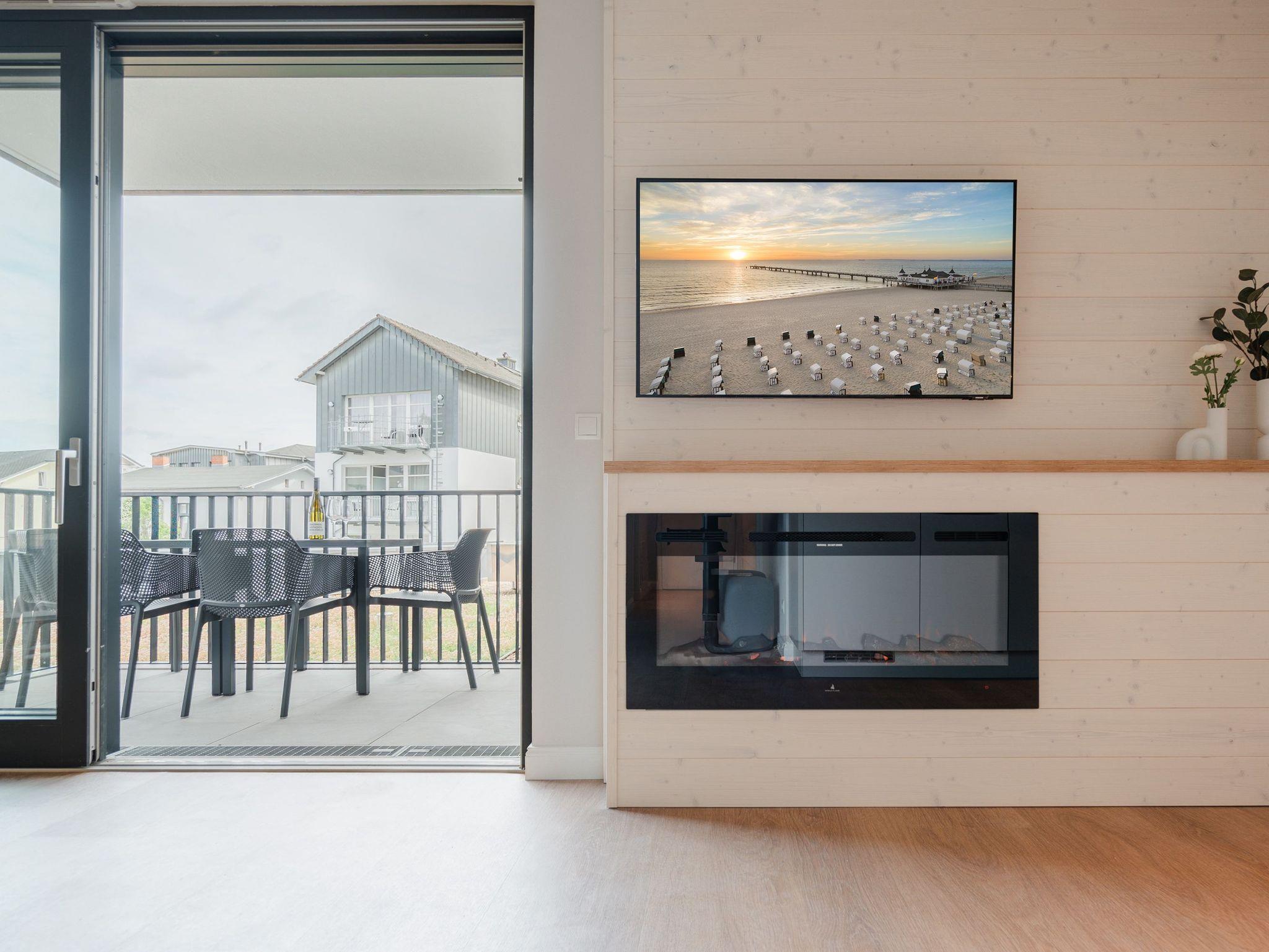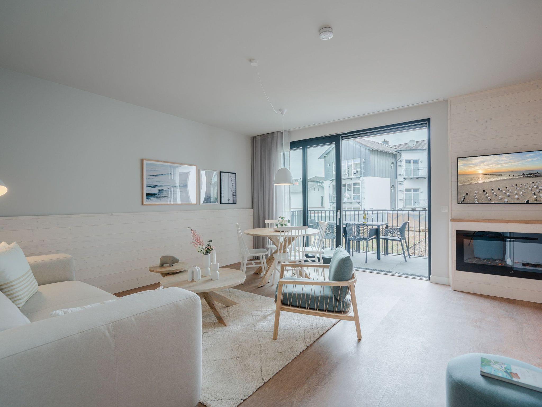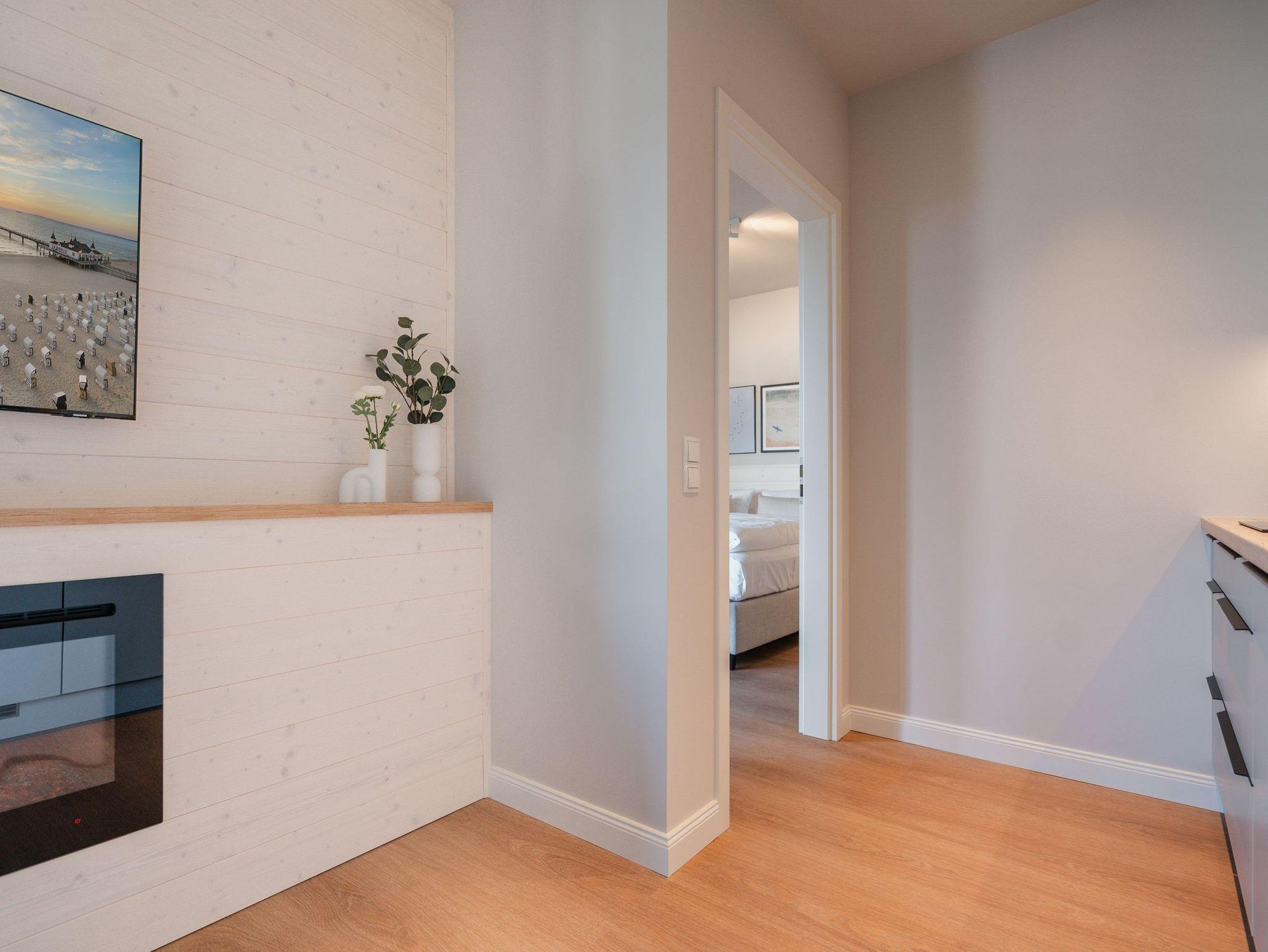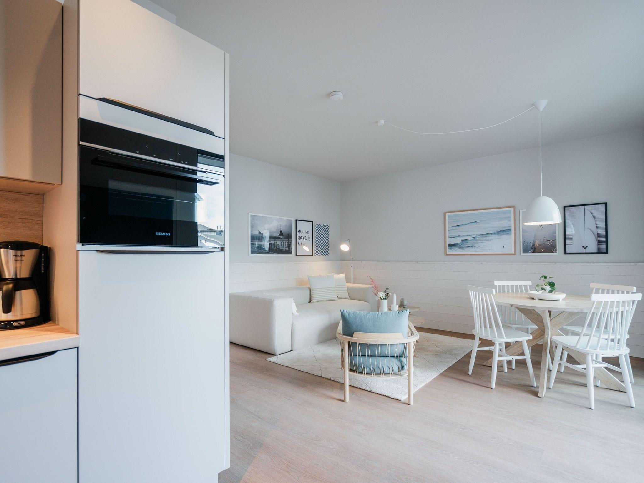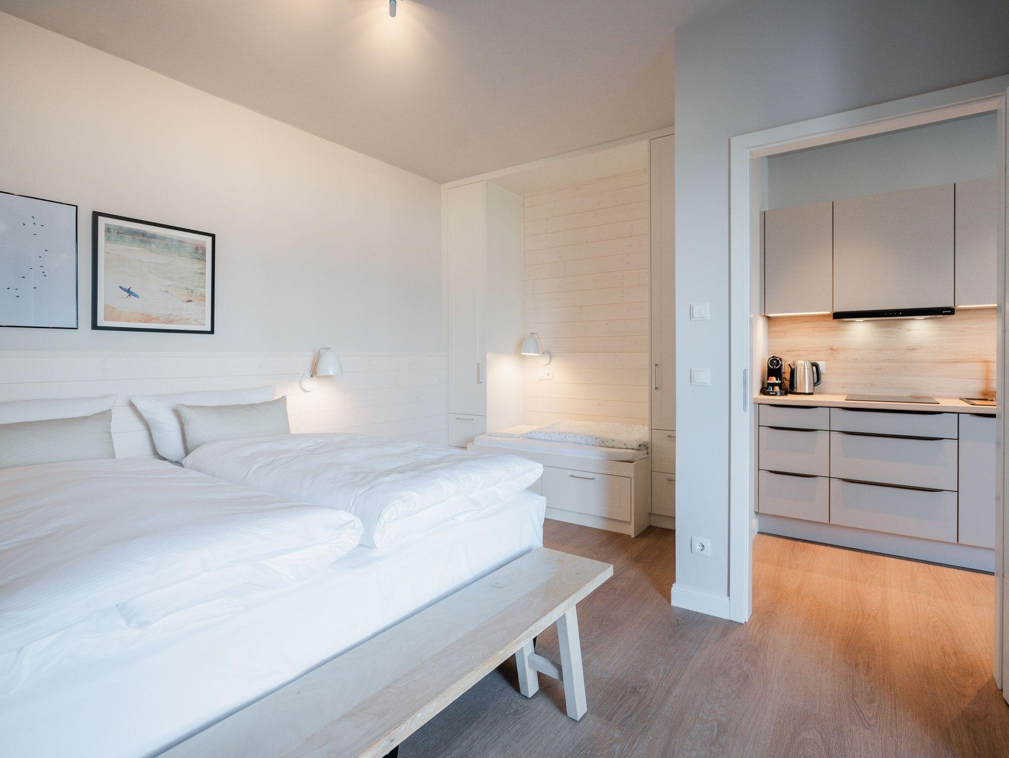 Hell und einladend ist das 60 Quadratmeter große 2-Raum-Appartement B 1.9 im Haus B der Strandterrasse. Es ist ein kuscheliges Urlaubsparadies für bis zu 2 Personen und 1 Kind bis 5 Jahre in der 1. Etage. Ein harmonisches Wohnkonzept empfängt Sie schon beim Ankommen. Alles zielt auf Ihr Wohlfühlen ab und ist mit einem Händchen für stylisches Interieur eingerichtet. Mit seinen großen Fenstern öffnet sich das Appartement vom Wohnzimmer und vom Schlafzimmer aus auf einen Nord-Balkon mit Balkonmöbeln. Hier an einem lauen Sommermorgen unter freiem Himmel zu frühstücken oder abends mit einem kühlen Getränk den Tag bei Meeresrauschen ausklingen zu lassen, ist ein Traum. Im Inneren der Wohnung sorgt eine gemütliche Atmosphäre für das entspannende Urlaubsgefühl. Ein offenes Wohn-Esszimmer ist der ideale Ort zum Runterkommen und Auftanken. Entspannen Sie auf dem gemütlichen Sofa vor dem großer Flat-TV (50 Zoll). Erfreuen Sie sich am Flackern des Elektrokamins (ohne Wärmeabgabe) und kommen Sie zur Ruhe. Die in den Wohnraum integrierte Küche ist mit allen Annehmlichkeiten wie einem Backofen, einem 3-Platten-Induktionsherd, einem Geschirrspüler und einer Nespresso-Kapselmaschine ausgestattet. Ein gemütlicher Essplatz lädt zum Genießen ein. Im Schlafzimmer wartet ein bequemes Boxspringdoppelbett (1,80m x 2,00m) sowie ein Kindertagesbett (0,80m x 1,40m) nur darauf, Ihnen einen erholsamen Schlaf und süße Träume zu schenken. Ein Kleiderschrank und ein Flat-TV (43 Zoll) gehören ebenfalls zur Ausstattung. Im modernen Bad sorgt die Fußbodenheizung dafür, dass Sie morgens nach dem Aufstehen garantiert keine kalten Füßen bekommen. Eine Dusche, ein Waschtisch und ein WC komplettieren die Einrichtung. Damit Sie so richtig abschalten und neue Energie tanken können, verfügt das Badezimmer zudem über eine Infrarotsaunakabine. Stellen Sie Ihr Auto einfach auf Ihrem Stellplatz in der Tiefgarage ab und schon kann die unvergesslich schöne Auszeit am Meer beginnen.