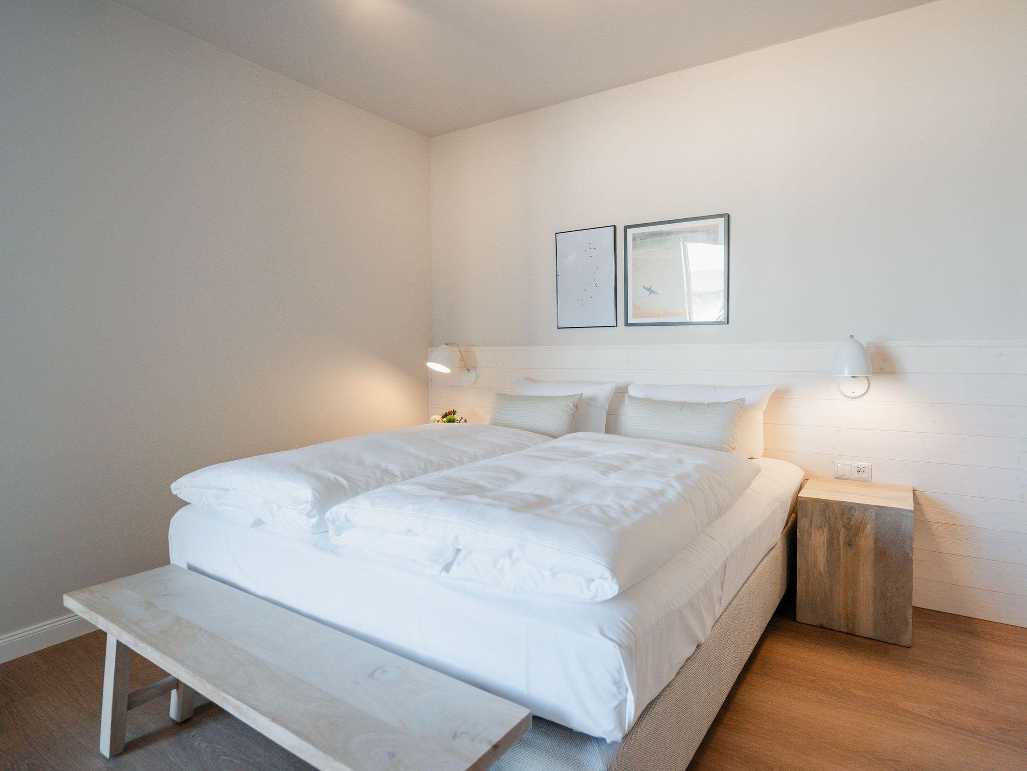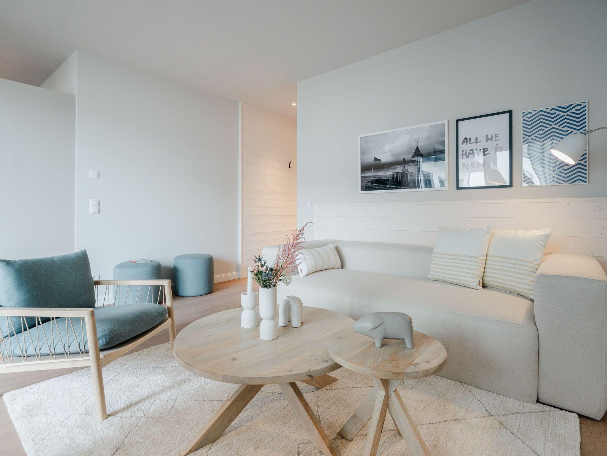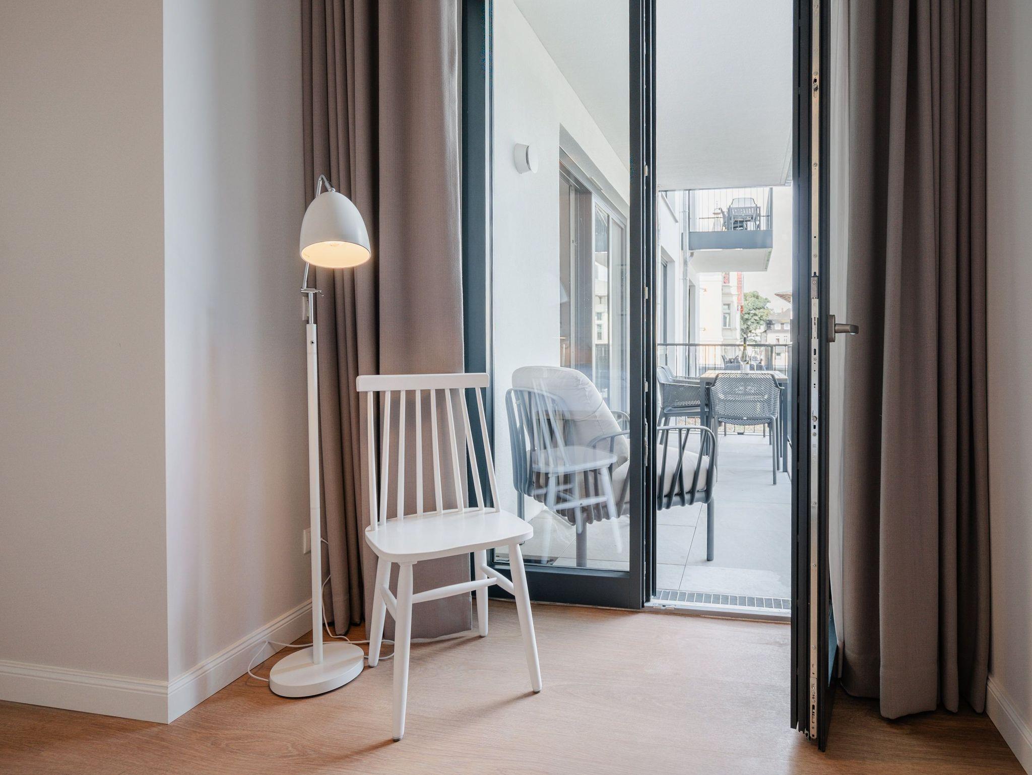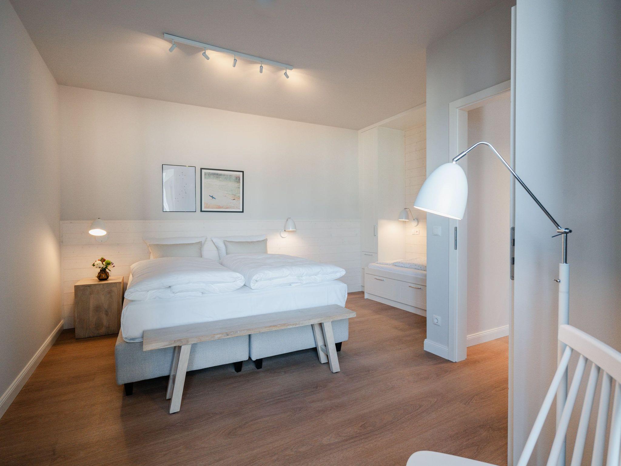 Hell und einladend ist das 60 Quadratmeter große 2-Raum-Appartement B 1.9 im Haus B der Strandterrasse. Es ist ein kuscheliges Urlaubsparadies für bis zu 2 Personen und 1 Kind bis 5 Jahre in der 1. Etage. Ein harmonisches Wohnkonzept empfängt Sie schon beim Ankommen. Alles zielt auf Ihr Wohlfühlen ab und ist mit einem Händchen für stylisches Interieur eingerichtet. Mit seinen großen Fenstern öffnet sich das Appartement vom Wohnzimmer und vom Schlafzimmer aus auf einen Nord-Balkon mit Balkonmöbeln. Hier an einem lauen Sommermorgen unter freiem Himmel zu frühstücken oder abends mit einem kühlen Getränk den Tag bei Meeresrauschen ausklingen zu lassen, ist ein Traum. Im Inneren der Wohnung sorgt eine gemütliche Atmosphäre für das entspannende Urlaubsgefühl. Ein offenes Wohn-Esszimmer ist der ideale Ort zum Runterkommen und Auftanken. Entspannen Sie auf dem gemütlichen Sofa vor dem großer Flat-TV (50 Zoll). Erfreuen Sie sich am Flackern des Elektrokamins (ohne Wärmeabgabe) und kommen Sie zur Ruhe. Die in den Wohnraum integrierte Küche ist mit allen Annehmlichkeiten wie einem Backofen, einem 3-Platten-Induktionsherd, einem Geschirrspüler und einer Nespresso-Kapselmaschine ausgestattet. Ein gemütlicher Essplatz lädt zum Genießen ein. Im Schlafzimmer wartet ein bequemes Boxspringdoppelbett (1,80m x 2,00m) sowie ein Kindertagesbett (0,80m x 1,40m) nur darauf, Ihnen einen erholsamen Schlaf und süße Träume zu schenken. Ein Kleiderschrank und ein Flat-TV (43 Zoll) gehören ebenfalls zur Ausstattung. Im modernen Bad sorgt die Fußbodenheizung dafür, dass Sie morgens nach dem Aufstehen garantiert keine kalten Füßen bekommen. Eine Dusche, ein Waschtisch und ein WC komplettieren die Einrichtung. Damit Sie so richtig abschalten und neue Energie tanken können, verfügt das Badezimmer zudem über eine Infrarotsaunakabine. Stellen Sie Ihr Auto einfach auf Ihrem Stellplatz in der Tiefgarage ab und schon kann die unvergesslich schöne Auszeit am Meer beginnen.