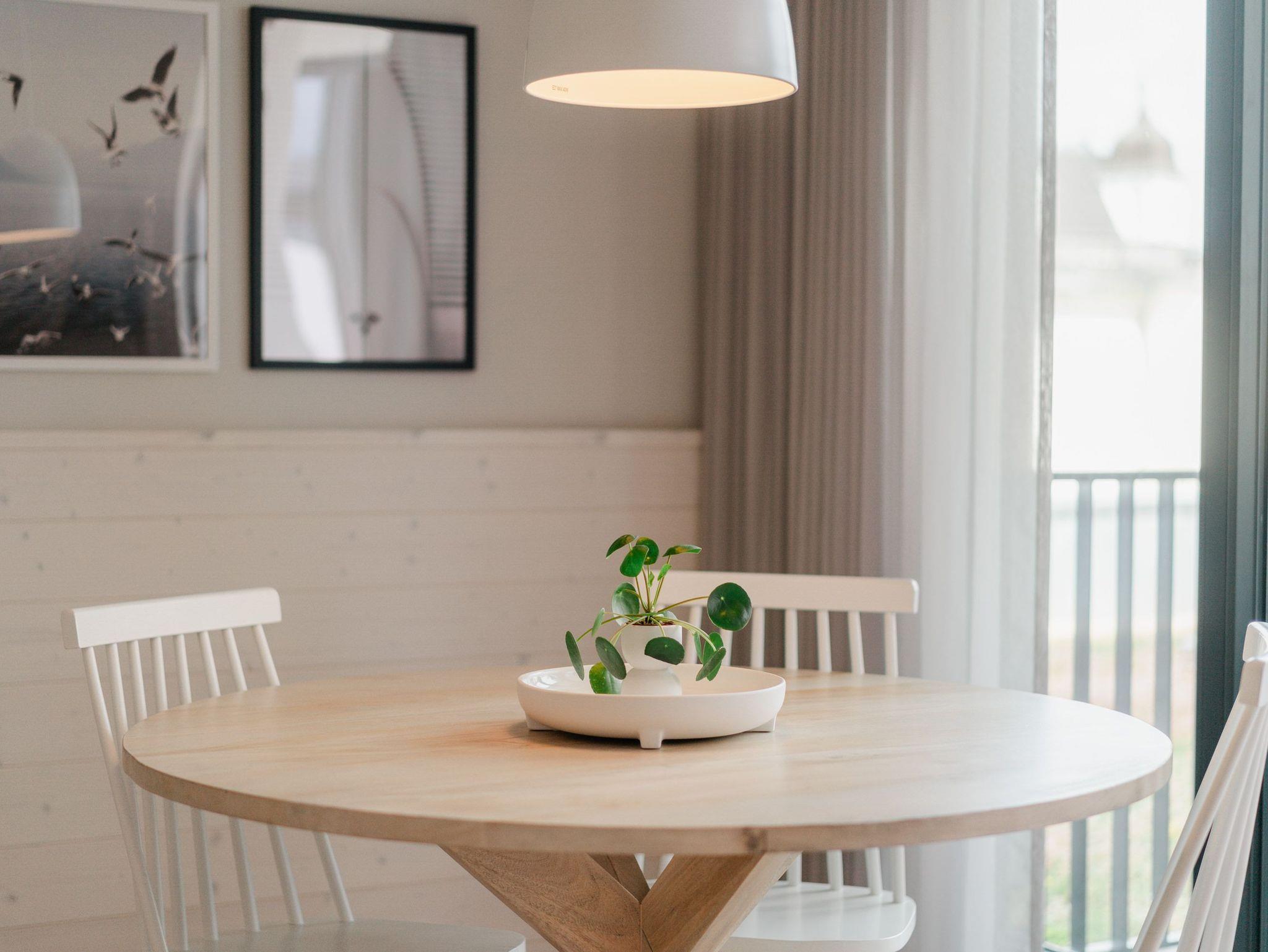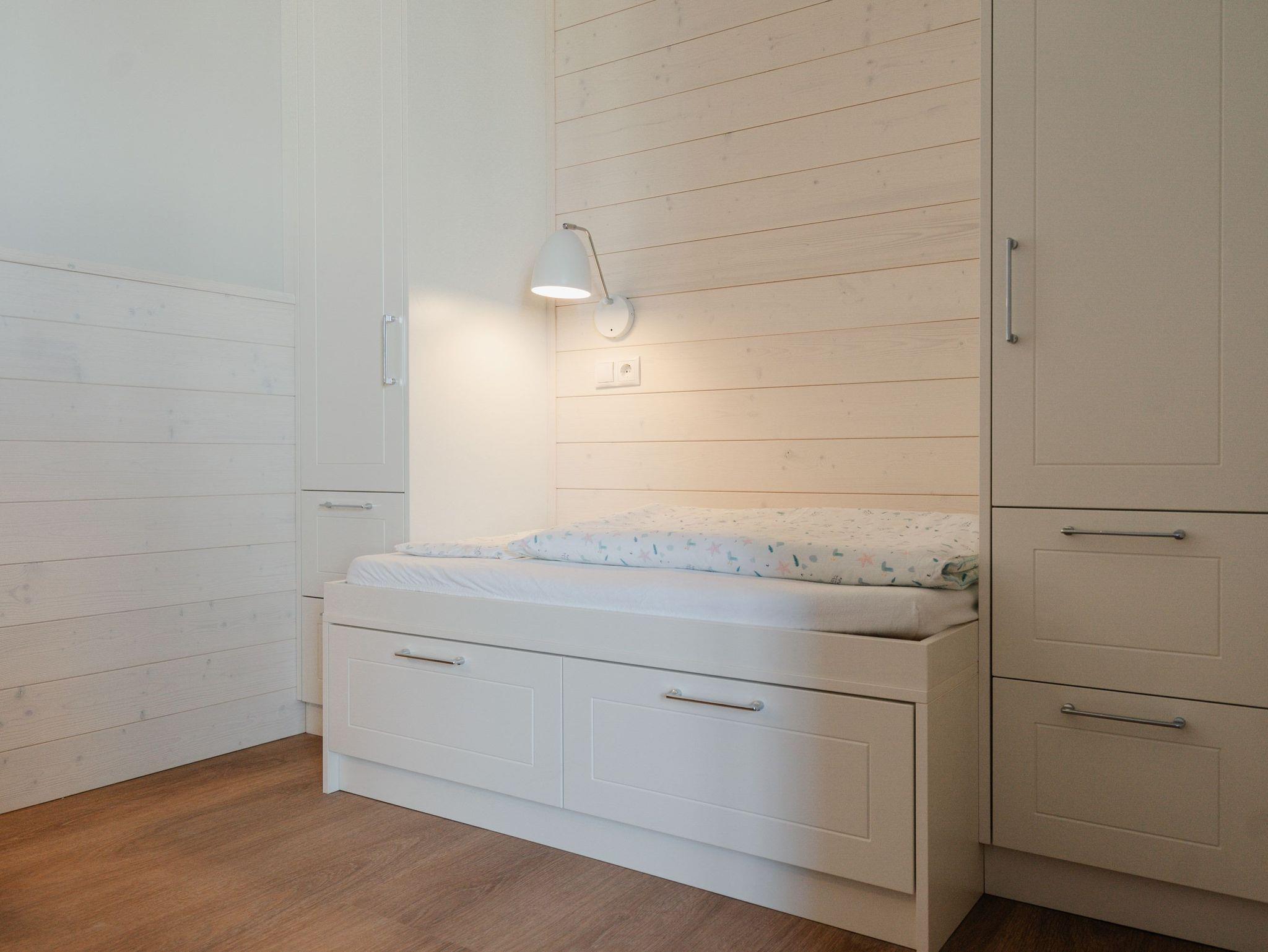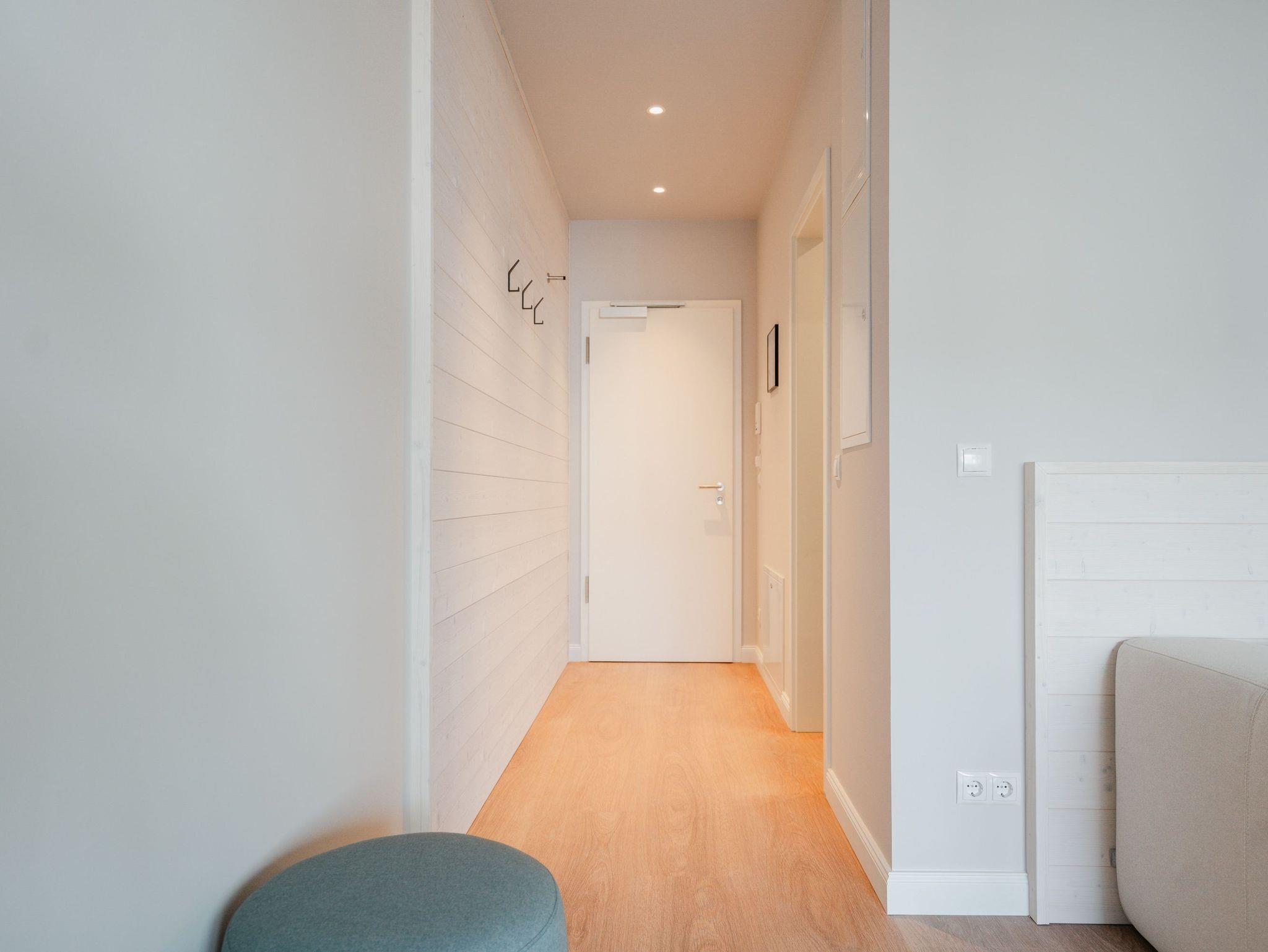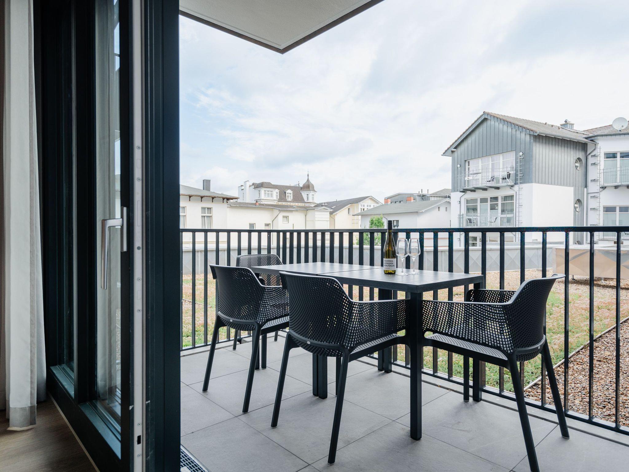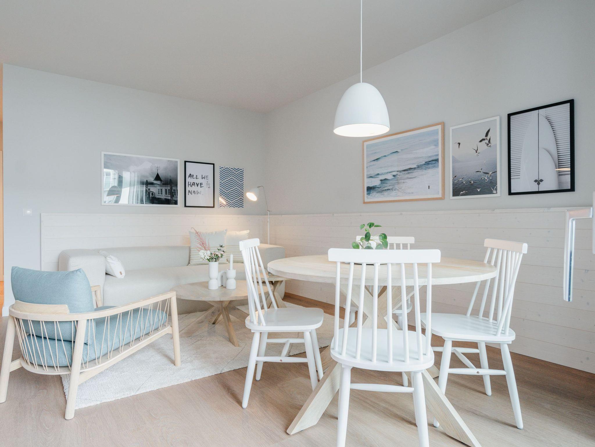 Hell und einladend ist das 60 Quadratmeter große 2-Raum-Appartement B 1.9 im Haus B der Strandterrasse. Es ist ein kuscheliges Urlaubsparadies für bis zu 2 Personen und 1 Kind bis 5 Jahre in der 1. Etage. Ein harmonisches Wohnkonzept empfängt Sie schon beim Ankommen. Alles zielt auf Ihr Wohlfühlen ab und ist mit einem Händchen für stylisches Interieur eingerichtet. Mit seinen großen Fenstern öffnet sich das Appartement vom Wohnzimmer und vom Schlafzimmer aus auf einen Nord-Balkon mit Balkonmöbeln. Hier an einem lauen Sommermorgen unter freiem Himmel zu frühstücken oder abends mit einem kühlen Getränk den Tag bei Meeresrauschen ausklingen zu lassen, ist ein Traum. Im Inneren der Wohnung sorgt eine gemütliche Atmosphäre für das entspannende Urlaubsgefühl. Ein offenes Wohn-Esszimmer ist der ideale Ort zum Runterkommen und Auftanken. Entspannen Sie auf dem gemütlichen Sofa vor dem großer Flat-TV (50 Zoll). Erfreuen Sie sich am Flackern des Elektrokamins (ohne Wärmeabgabe) und kommen Sie zur Ruhe. Die in den Wohnraum integrierte Küche ist mit allen Annehmlichkeiten wie einem Backofen, einem 3-Platten-Induktionsherd, einem Geschirrspüler und einer Nespresso-Kapselmaschine ausgestattet. Ein gemütlicher Essplatz lädt zum Genießen ein. Im Schlafzimmer wartet ein bequemes Boxspringdoppelbett (1,80m x 2,00m) sowie ein Kindertagesbett (0,80m x 1,40m) nur darauf, Ihnen einen erholsamen Schlaf und süße Träume zu schenken. Ein Kleiderschrank und ein Flat-TV (43 Zoll) gehören ebenfalls zur Ausstattung. Im modernen Bad sorgt die Fußbodenheizung dafür, dass Sie morgens nach dem Aufstehen garantiert keine kalten Füßen bekommen. Eine Dusche, ein Waschtisch und ein WC komplettieren die Einrichtung. Damit Sie so richtig abschalten und neue Energie tanken können, verfügt das Badezimmer zudem über eine Infrarotsaunakabine. Stellen Sie Ihr Auto einfach auf Ihrem Stellplatz in der Tiefgarage ab und schon kann die unvergesslich schöne Auszeit am Meer beginnen.