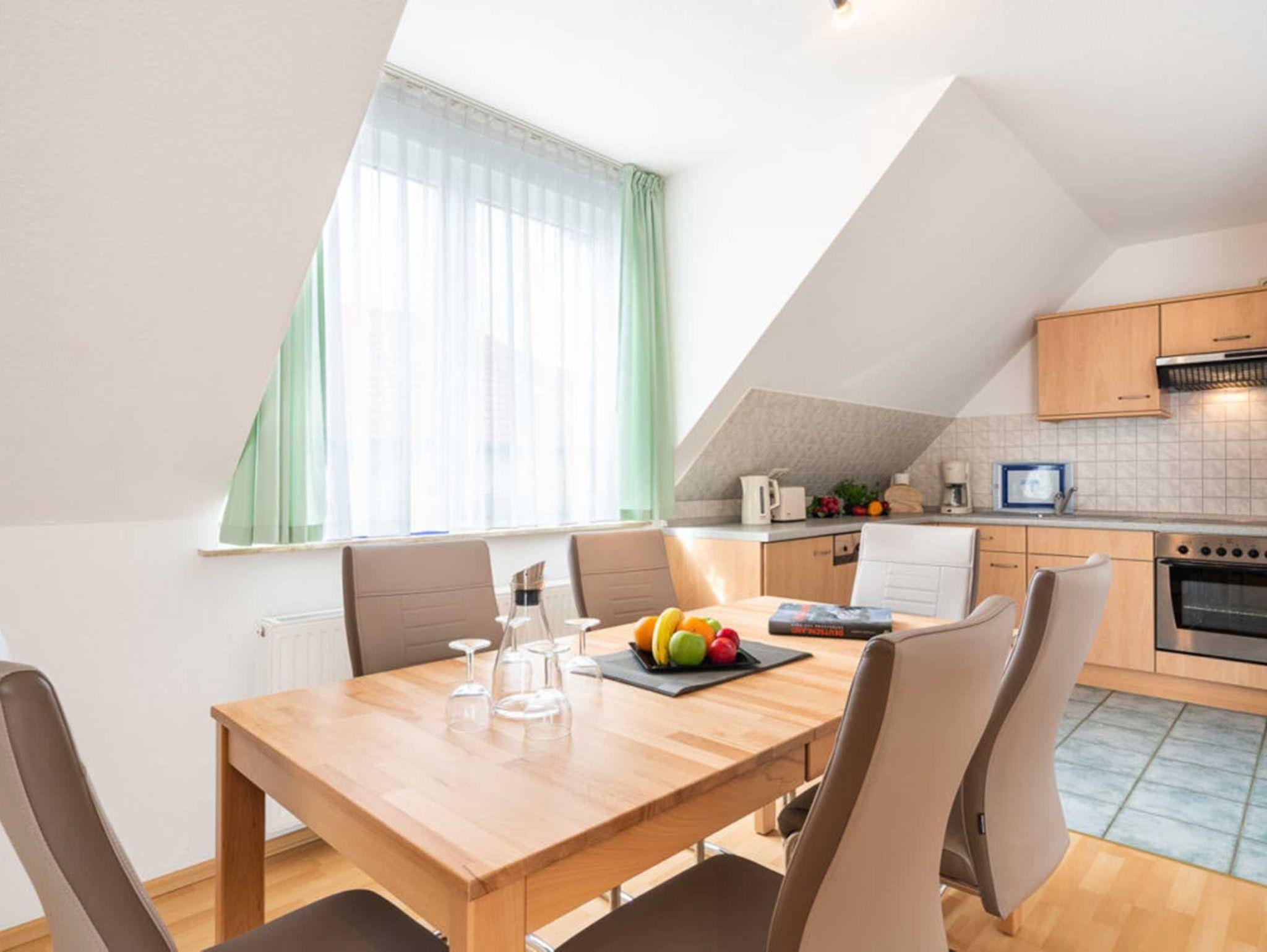 Die Wohnung Neptun erstreckt sich auf zwei Etagen und befindet sich im Ober- und Dachgeschoss des Hauses. Sie besteht aus Diele, Dusche/WC, zusätzlichem WC, kombiniertem Wohnzimmer mit Küche und zwei Schlafzimmern.