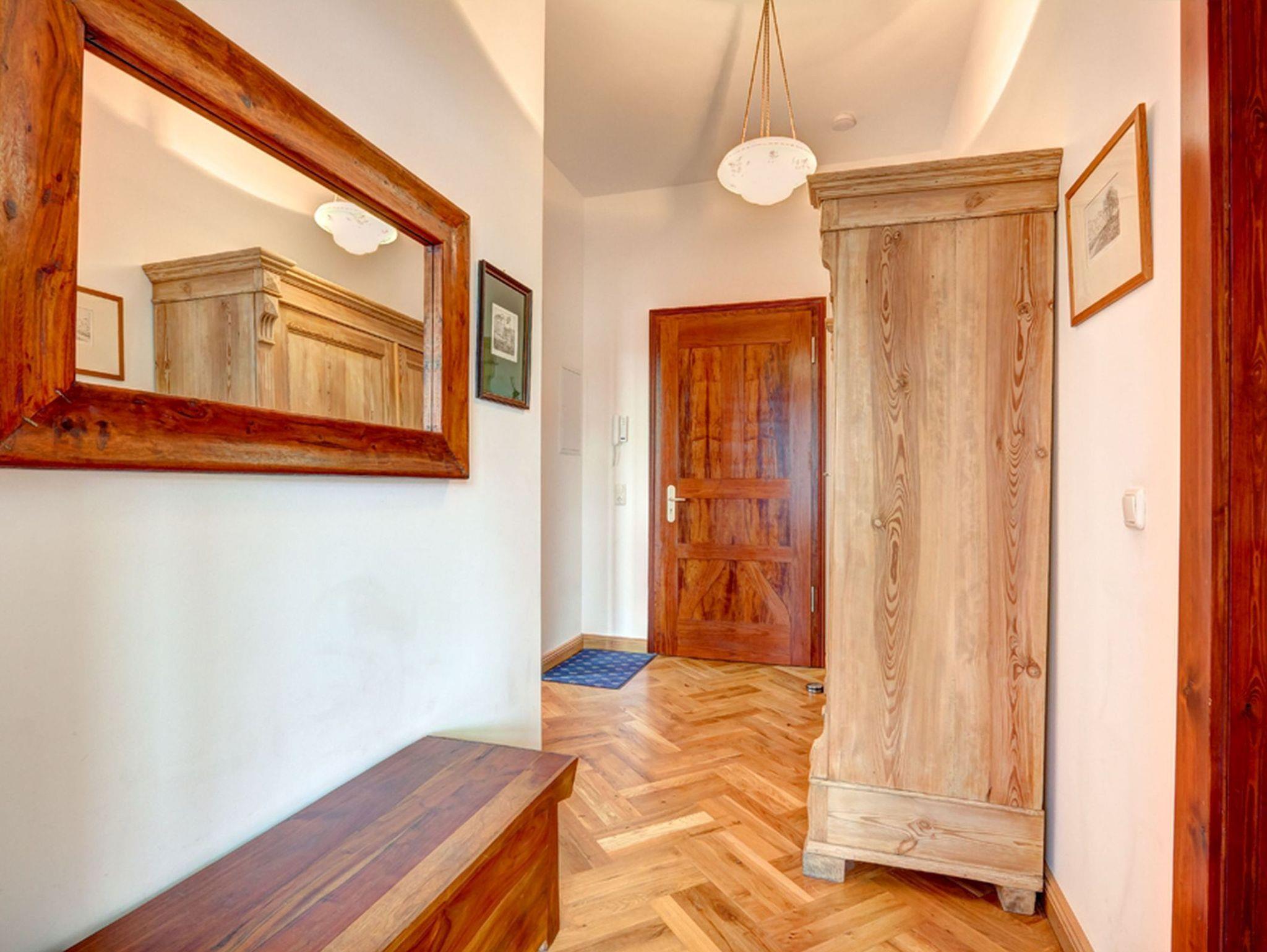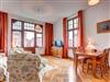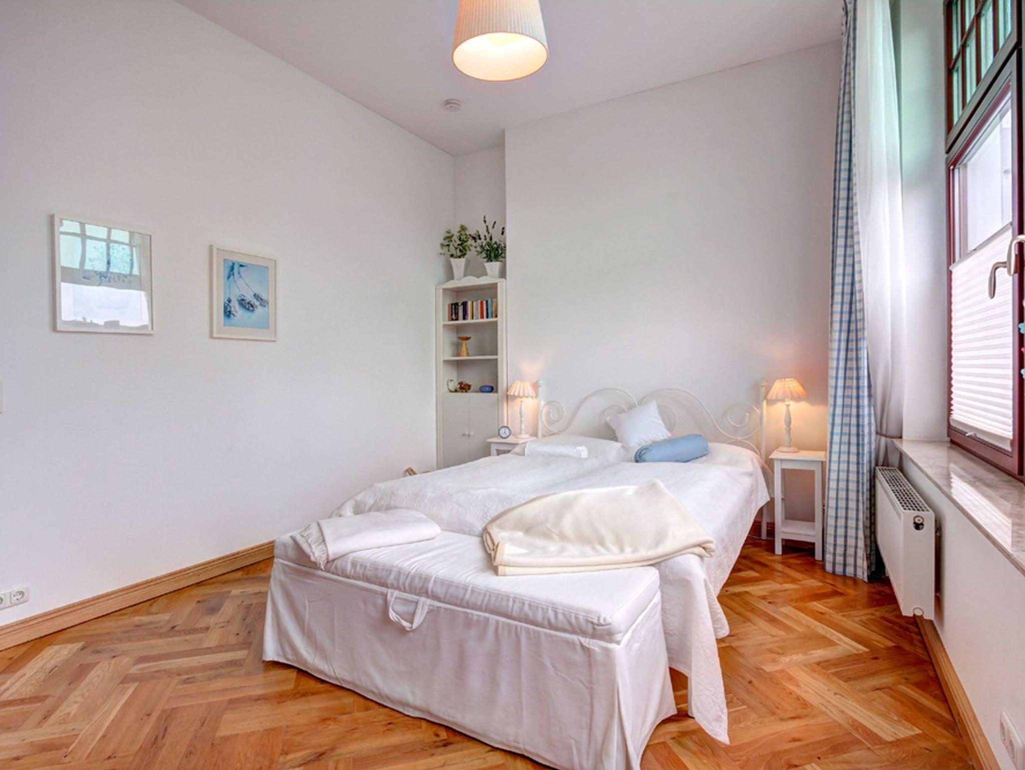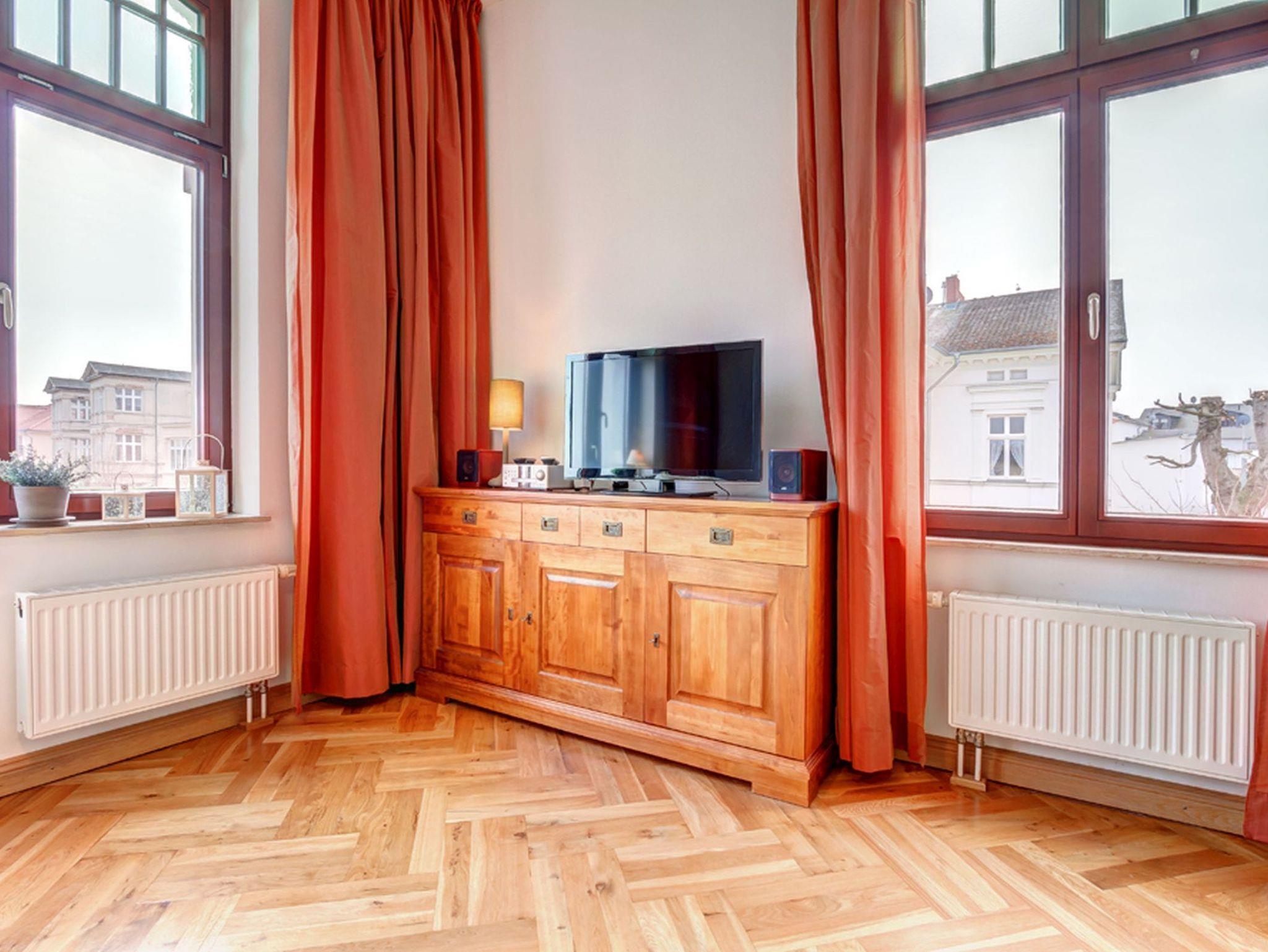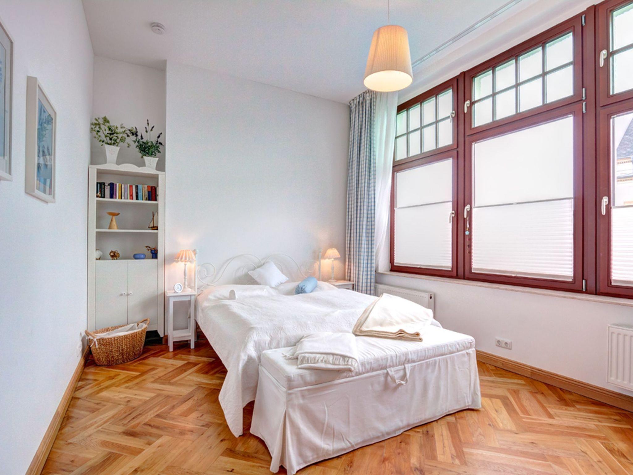 Eine besondere Note erhält die Ferienwohnung durch die klassischen englischen Möbel und das Massivholzparkett aus Eiche. An Komfort wird es Ihnen hier nicht mangeln! Dafür sorgt auch der schöne, nach Osten ausgerichtete Balkon. Die Ostsee können Sie seitlich aus den angrenzenden Fenstern erblicken. Genießen Sie vom kleinen Balkon aus die Sonnenstrahlen sowie den Blick auf die umliegenden, hübschen Villen des Seebades Ahlbeck!