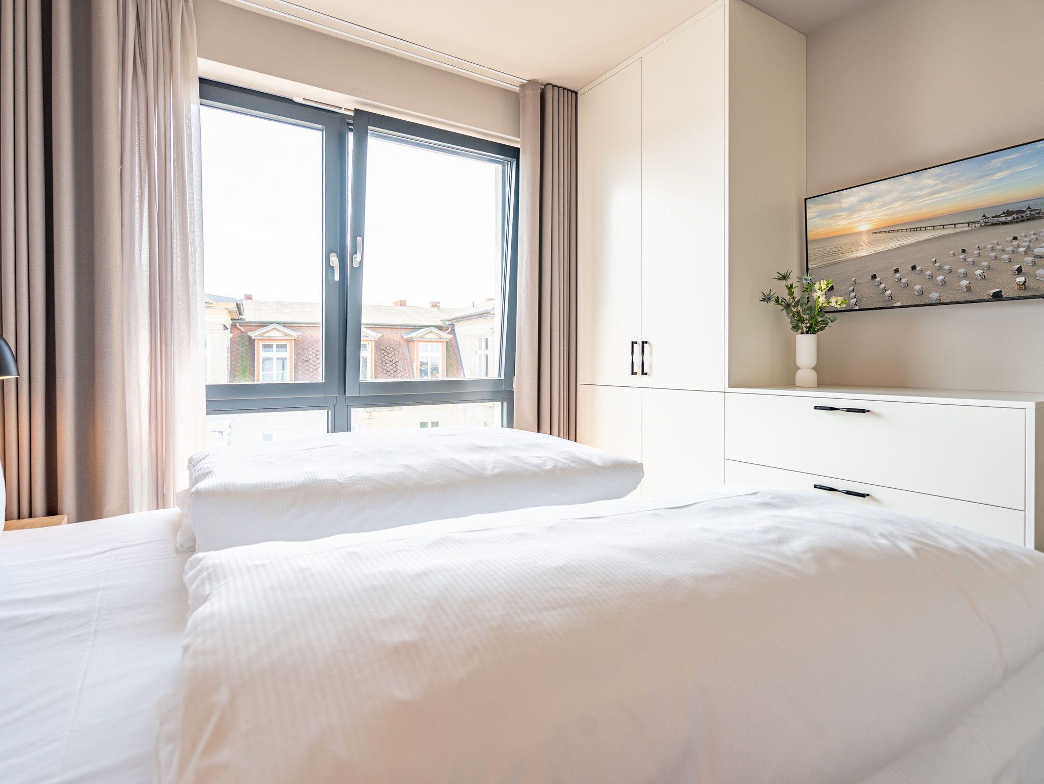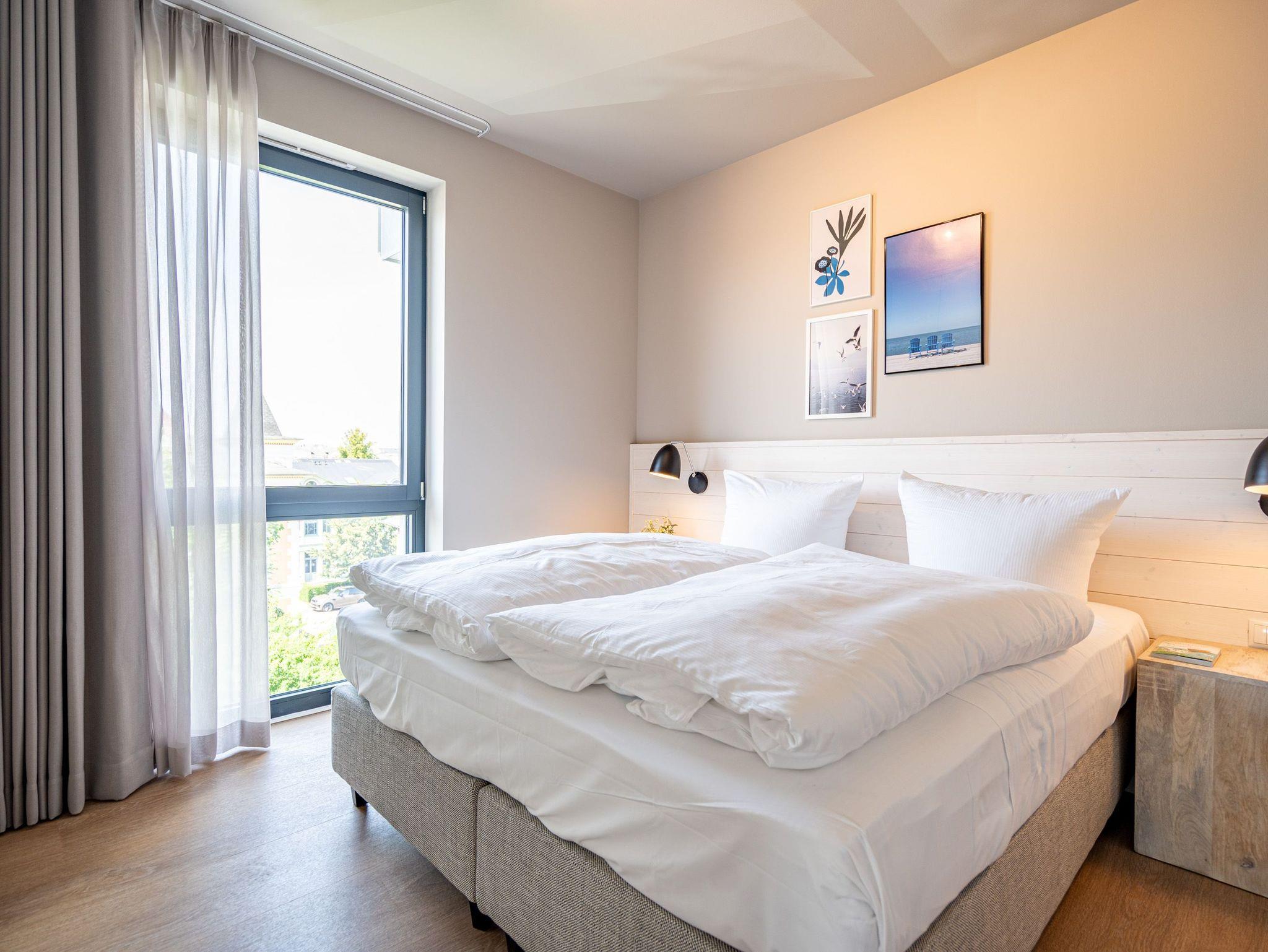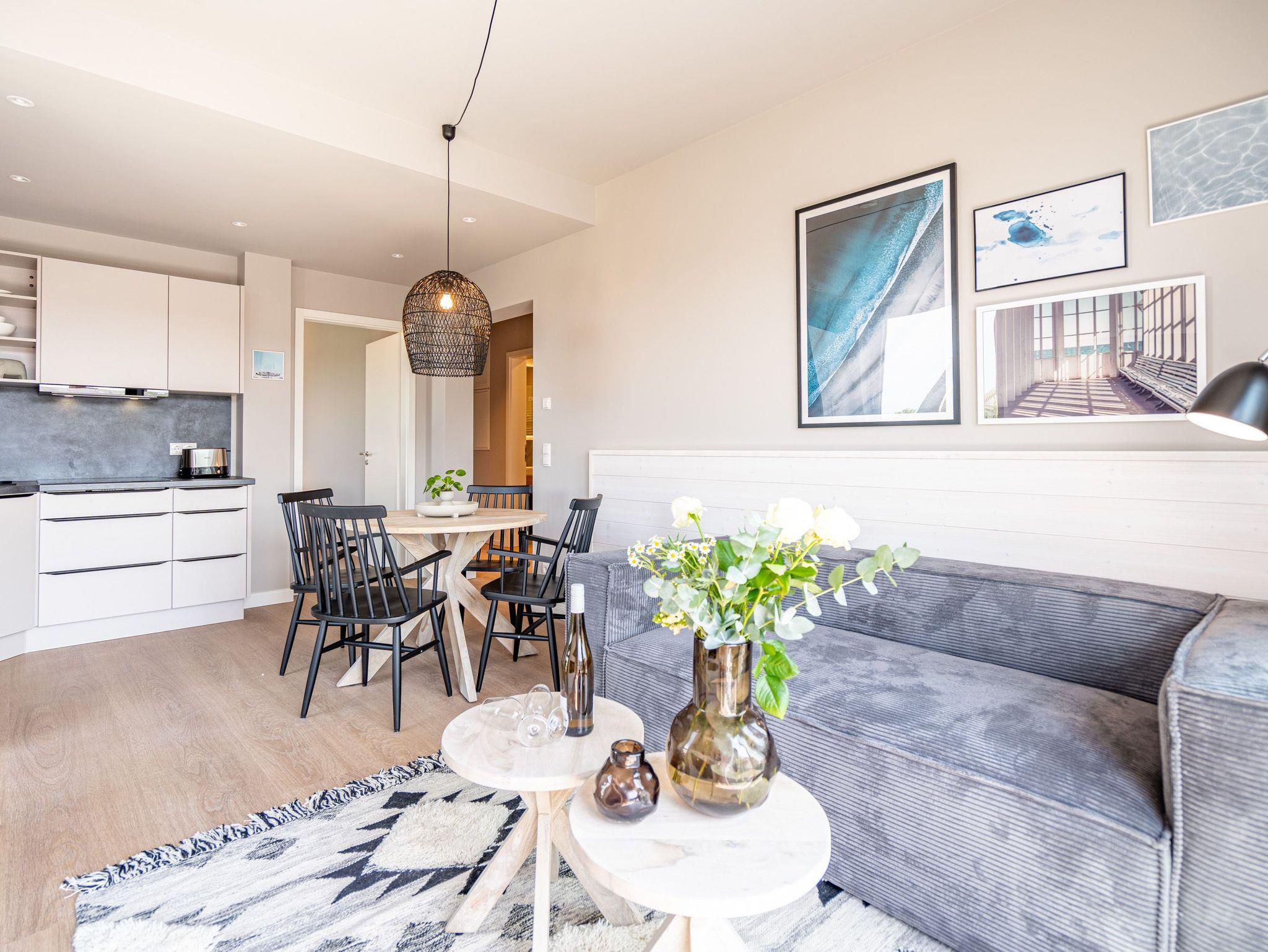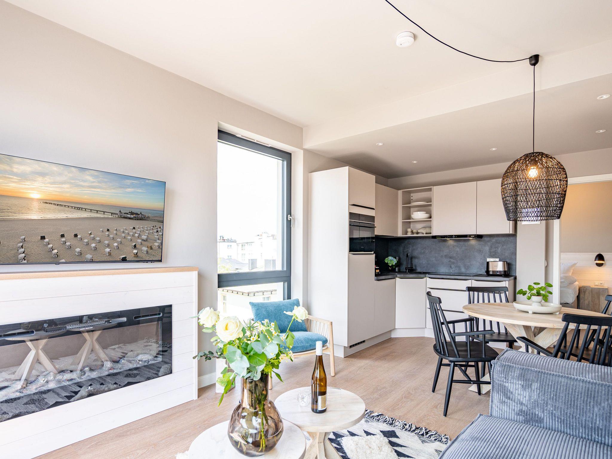 Einfach entspannt in den Tag hineinleben, die Ostsee, die direkt vor der Haustür rauscht, genießen und den Kopf auf neue Gedanken bringen in einer Umgebung, die rundum glücklich macht ? das und vieles mehr bietet das 3-Raum-Appartement B 3.7 (Haus B) in der 3. Etage der Strandterrasse bis zu 4 Personen. Die mit viel Liebe eingerichteten 58 Quadratmeter schaffen Urlaubsfeeling vom Feinsten. Das Möbel-und Lichtkonzept ist genau aufeinander abgestimmt. Und jedes Detail wurde eigens für dieses Traumdomizil angefertigt oder ausgesucht. So zum Beispiel die gemütliche Sofa-Sitzgruppe im Wohnzimmer, die zum ausgiebigen Entspannen einlädt. Der Flat-TV (50 Zoll) sorgt für Unterhaltung und ein Elektrokamin (ohne Wärmeabgabe) für eine kuschelige Atmosphäre. Ein großer Esstisch bietet genug Platz für ausgefeilte Mahlzeiten, aber auch zum Klönen und Schnacken. In der offenen Küche können Sie sich Dank der hochwertigen Elektrogeräte wie einem 4-Platten-Induktionsherd, einem Backofen, einem Toaster und sogar einer Nespresso-Kapselmaschine kulinarisch austoben und ausprobieren. Zur Wohnung gehört ein Süd-Balkon, den Sie vom Wohnzimmer aus betreten können. Genießen Sie auf ihm die Sonnenseite der Insel. Essen unter freiem Himmel, während Ihnen die Ostseebrise um die Nase weht, ist ein besonderes Erlebnis, bei dem das Essen gleich nochmal so gut schmeckt. Für erholsame Nächte stehen Ihnen zwei Schlafzimmer zur Verfügung, jeweils mit einem komfortablen Boxspringdoppelbett (1,80m x 2,00m), einem Kleiderschrank und einem Flat-TV (43 Zoll). Zwei moderne Bäder mit Dusche, Waschtisch und WC geben Raum für Privatsphäre. Das Appartement verfügt außerdem über einen PKW-Stellplatz in der Tiefgarage. So können Sie stressfrei in Ihrem Feriendomizil ankommen und sofort in die Urlaubsstimmung eintauchen.