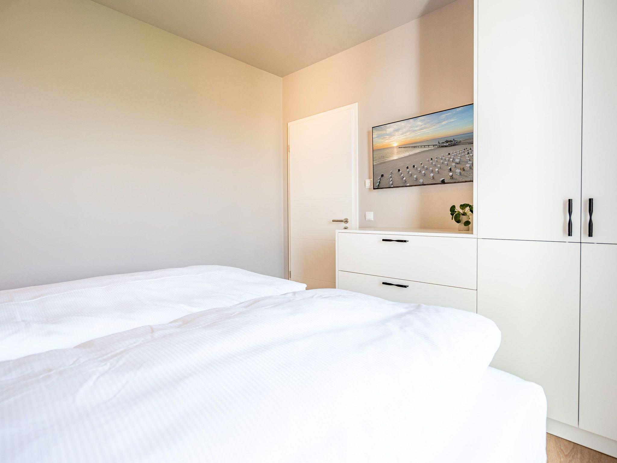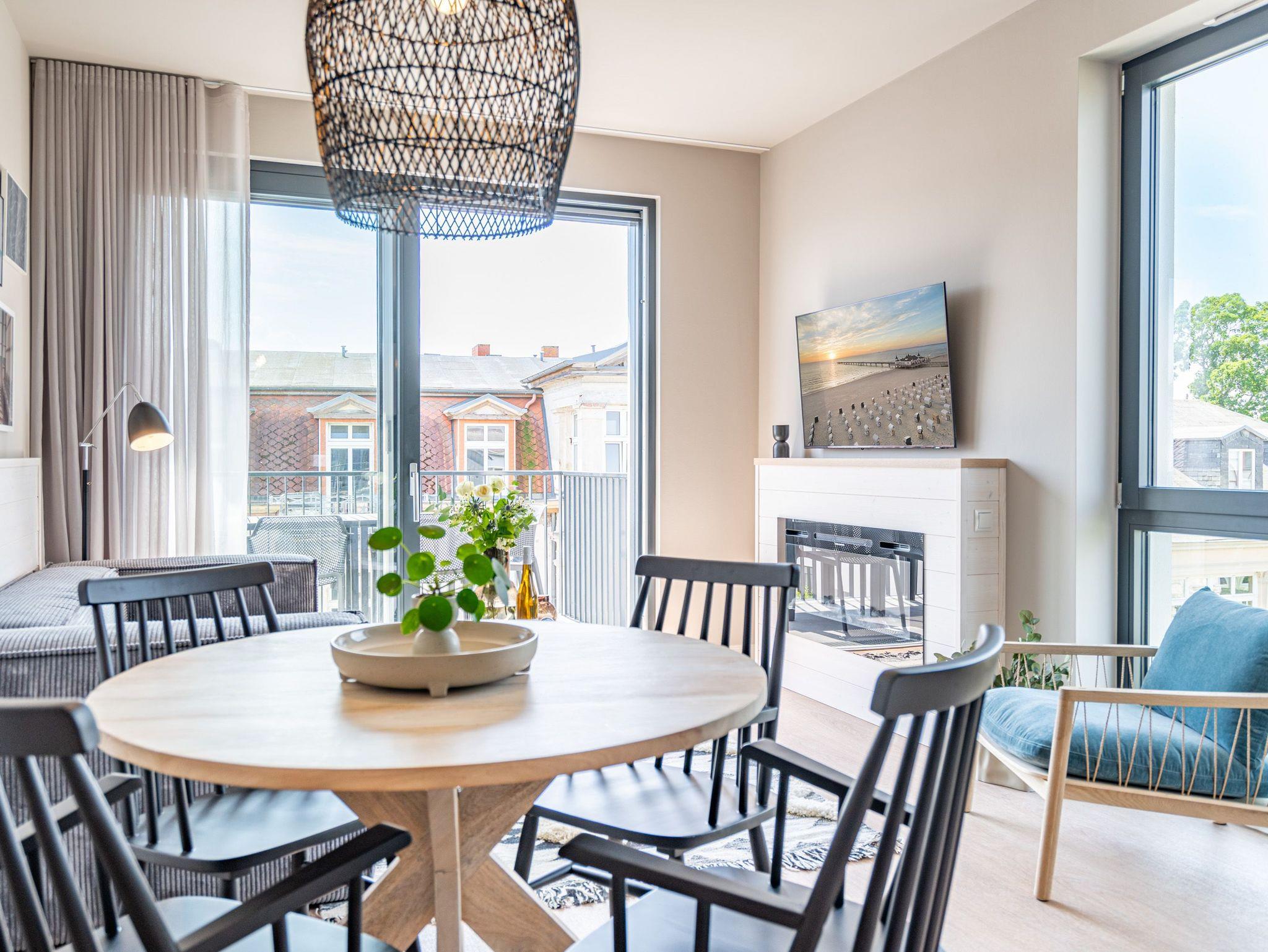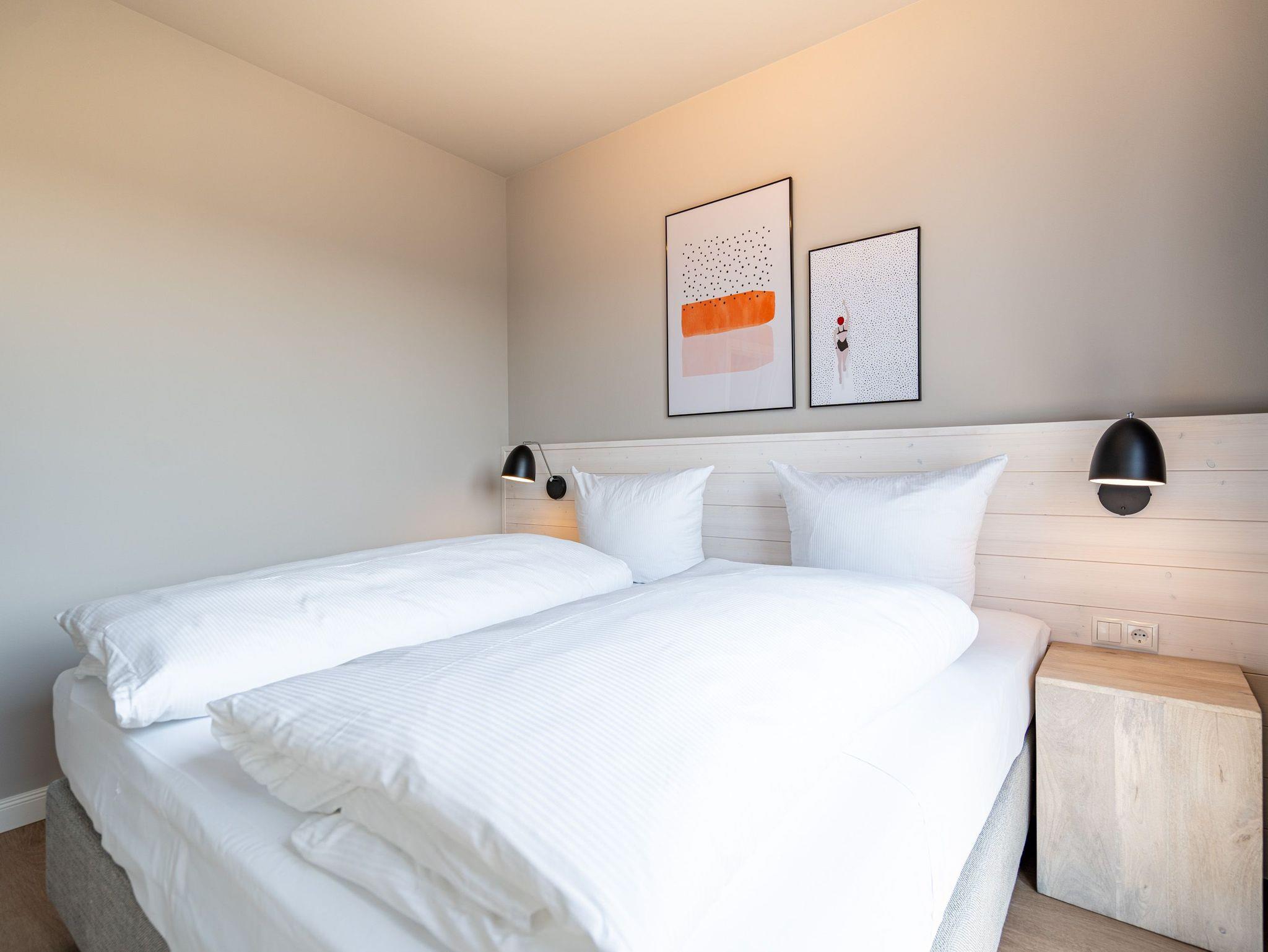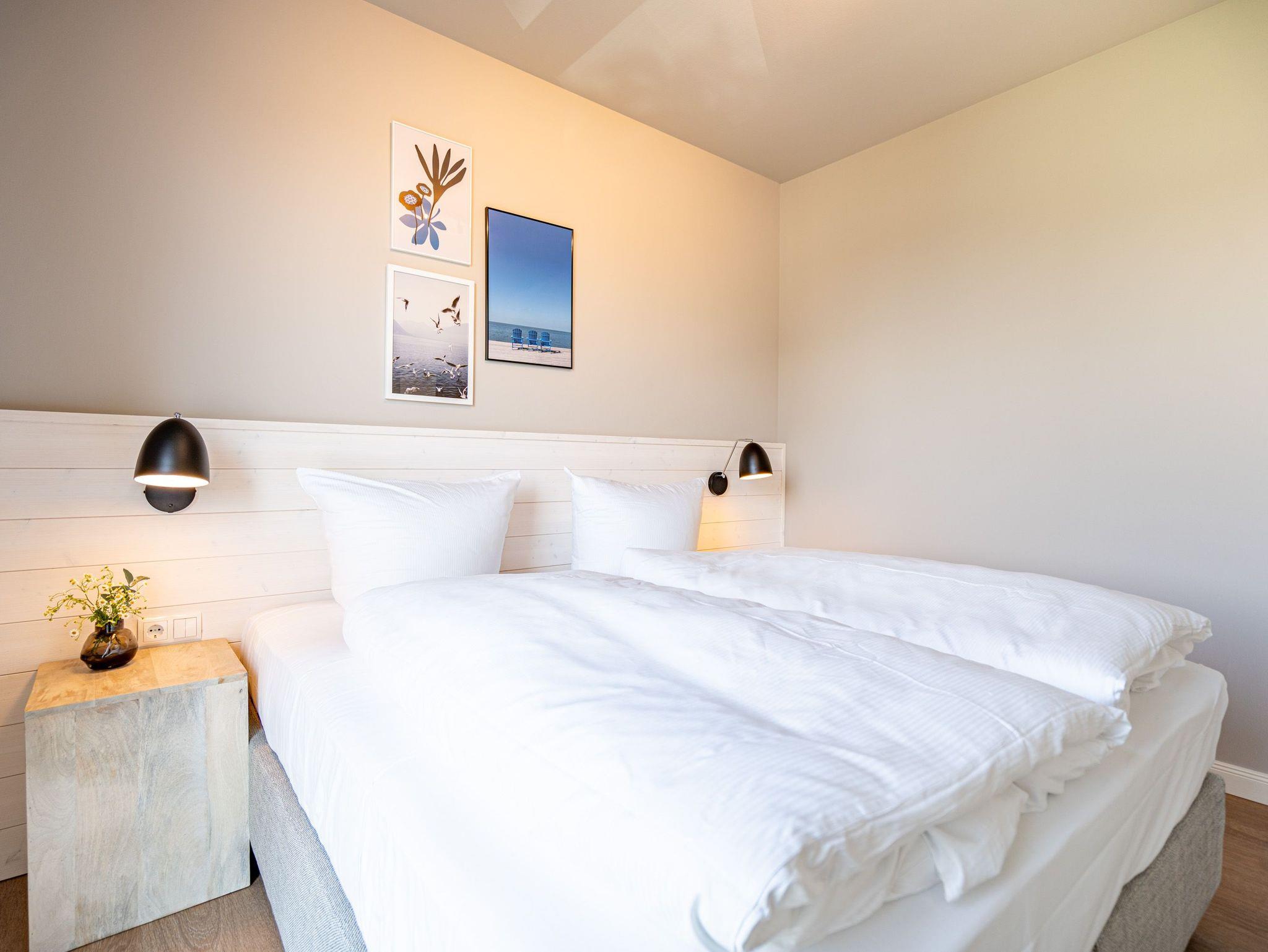 Einfach entspannt in den Tag hineinleben, die Ostsee, die direkt vor der Haustür rauscht, genießen und den Kopf auf neue Gedanken bringen in einer Umgebung, die rundum glücklich macht ? das und vieles mehr bietet das 3-Raum-Appartement B 3.7 (Haus B) in der 3. Etage der Strandterrasse bis zu 4 Personen. Die mit viel Liebe eingerichteten 58 Quadratmeter schaffen Urlaubsfeeling vom Feinsten. Das Möbel-und Lichtkonzept ist genau aufeinander abgestimmt. Und jedes Detail wurde eigens für dieses Traumdomizil angefertigt oder ausgesucht. So zum Beispiel die gemütliche Sofa-Sitzgruppe im Wohnzimmer, die zum ausgiebigen Entspannen einlädt. Der Flat-TV (50 Zoll) sorgt für Unterhaltung und ein Elektrokamin (ohne Wärmeabgabe) für eine kuschelige Atmosphäre. Ein großer Esstisch bietet genug Platz für ausgefeilte Mahlzeiten, aber auch zum Klönen und Schnacken. In der offenen Küche können Sie sich Dank der hochwertigen Elektrogeräte wie einem 4-Platten-Induktionsherd, einem Backofen, einem Toaster und sogar einer Nespresso-Kapselmaschine kulinarisch austoben und ausprobieren. Zur Wohnung gehört ein Süd-Balkon, den Sie vom Wohnzimmer aus betreten können. Genießen Sie auf ihm die Sonnenseite der Insel. Essen unter freiem Himmel, während Ihnen die Ostseebrise um die Nase weht, ist ein besonderes Erlebnis, bei dem das Essen gleich nochmal so gut schmeckt. Für erholsame Nächte stehen Ihnen zwei Schlafzimmer zur Verfügung, jeweils mit einem komfortablen Boxspringdoppelbett (1,80m x 2,00m), einem Kleiderschrank und einem Flat-TV (43 Zoll). Zwei moderne Bäder mit Dusche, Waschtisch und WC geben Raum für Privatsphäre. Das Appartement verfügt außerdem über einen PKW-Stellplatz in der Tiefgarage. So können Sie stressfrei in Ihrem Feriendomizil ankommen und sofort in die Urlaubsstimmung eintauchen.