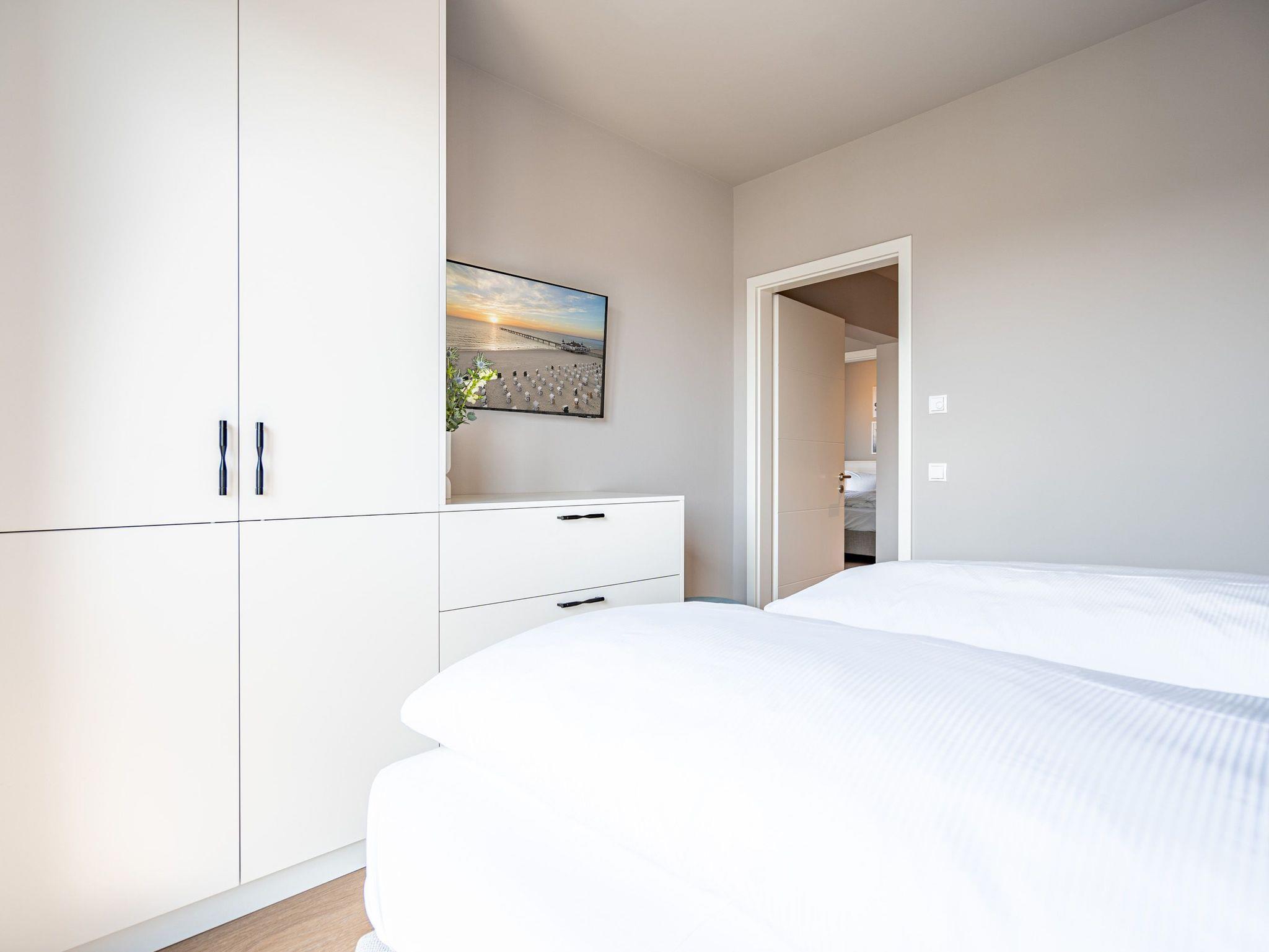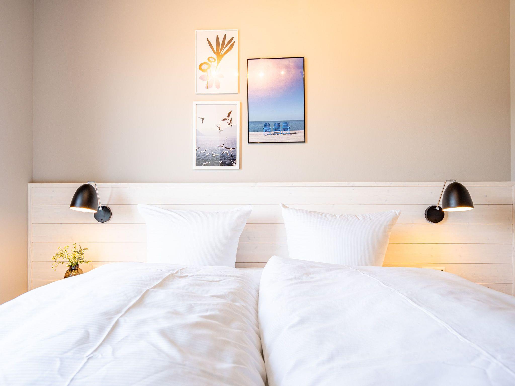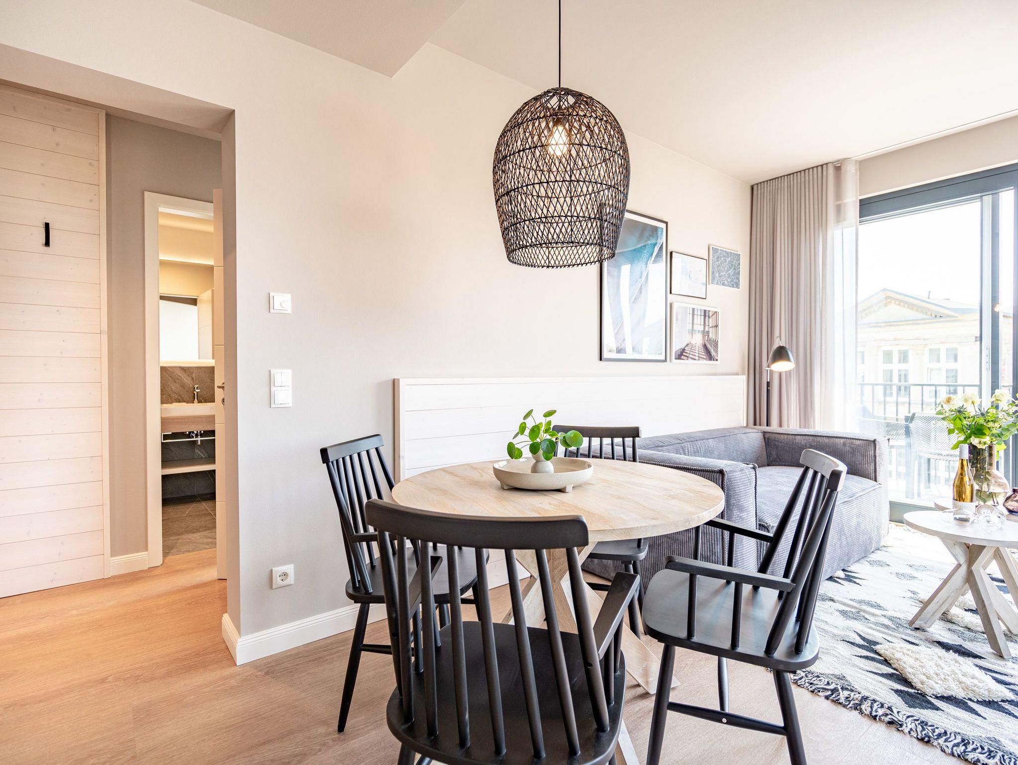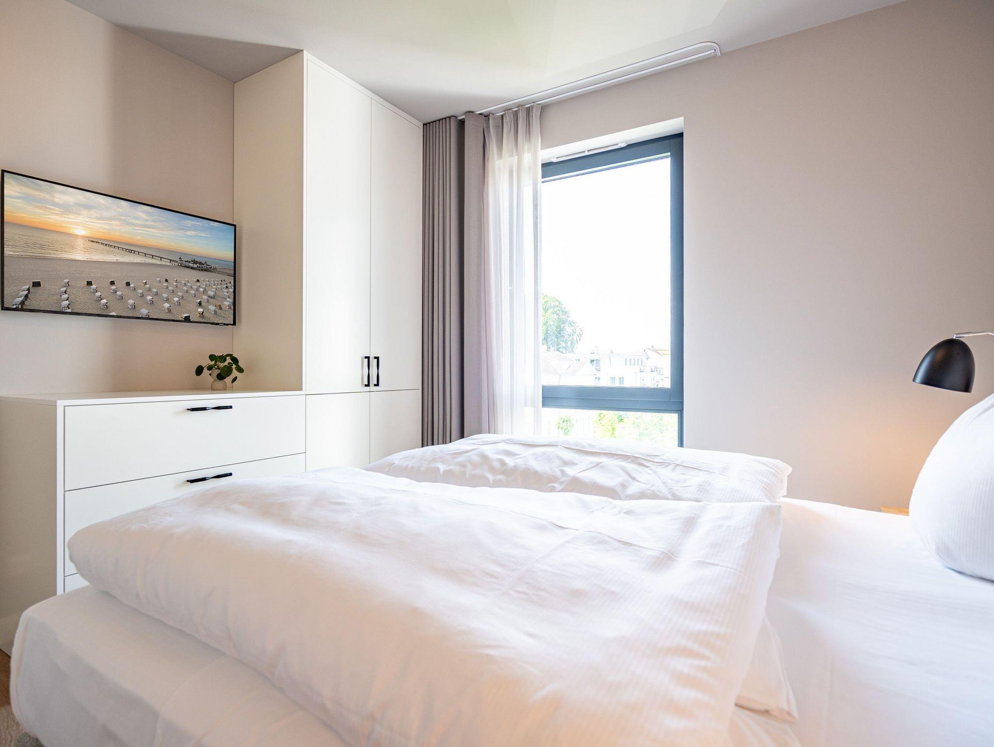 Einfach entspannt in den Tag hineinleben, die Ostsee, die direkt vor der Haustür rauscht, genießen und den Kopf auf neue Gedanken bringen in einer Umgebung, die rundum glücklich macht ? das und vieles mehr bietet das 3-Raum-Appartement B 3.7 (Haus B) in der 3. Etage der Strandterrasse bis zu 4 Personen. Die mit viel Liebe eingerichteten 58 Quadratmeter schaffen Urlaubsfeeling vom Feinsten. Das Möbel-und Lichtkonzept ist genau aufeinander abgestimmt. Und jedes Detail wurde eigens für dieses Traumdomizil angefertigt oder ausgesucht. So zum Beispiel die gemütliche Sofa-Sitzgruppe im Wohnzimmer, die zum ausgiebigen Entspannen einlädt. Der Flat-TV (50 Zoll) sorgt für Unterhaltung und ein Elektrokamin (ohne Wärmeabgabe) für eine kuschelige Atmosphäre. Ein großer Esstisch bietet genug Platz für ausgefeilte Mahlzeiten, aber auch zum Klönen und Schnacken. In der offenen Küche können Sie sich Dank der hochwertigen Elektrogeräte wie einem 4-Platten-Induktionsherd, einem Backofen, einem Toaster und sogar einer Nespresso-Kapselmaschine kulinarisch austoben und ausprobieren. Zur Wohnung gehört ein Süd-Balkon, den Sie vom Wohnzimmer aus betreten können. Genießen Sie auf ihm die Sonnenseite der Insel. Essen unter freiem Himmel, während Ihnen die Ostseebrise um die Nase weht, ist ein besonderes Erlebnis, bei dem das Essen gleich nochmal so gut schmeckt. Für erholsame Nächte stehen Ihnen zwei Schlafzimmer zur Verfügung, jeweils mit einem komfortablen Boxspringdoppelbett (1,80m x 2,00m), einem Kleiderschrank und einem Flat-TV (43 Zoll). Zwei moderne Bäder mit Dusche, Waschtisch und WC geben Raum für Privatsphäre. Das Appartement verfügt außerdem über einen PKW-Stellplatz in der Tiefgarage. So können Sie stressfrei in Ihrem Feriendomizil ankommen und sofort in die Urlaubsstimmung eintauchen.