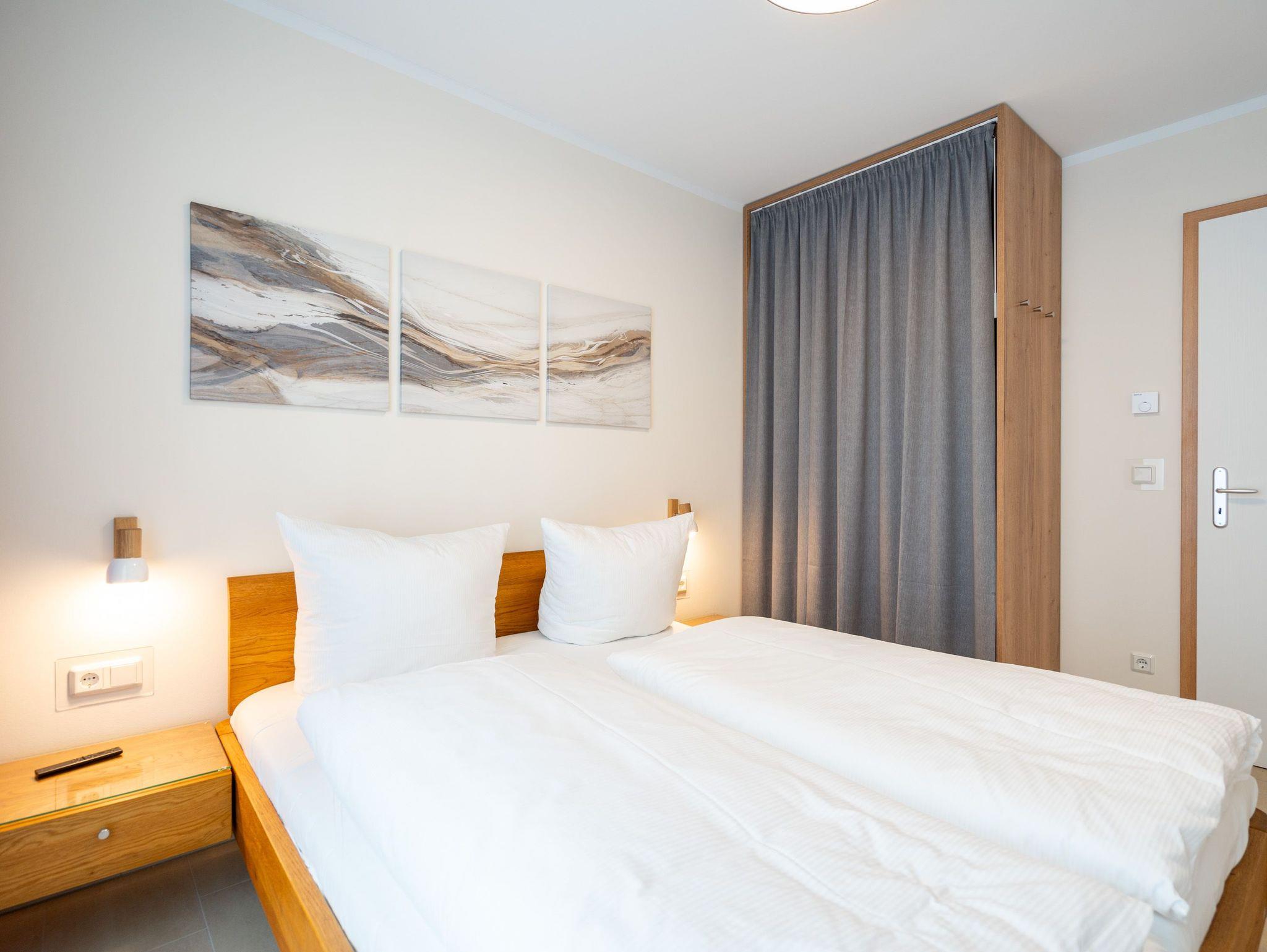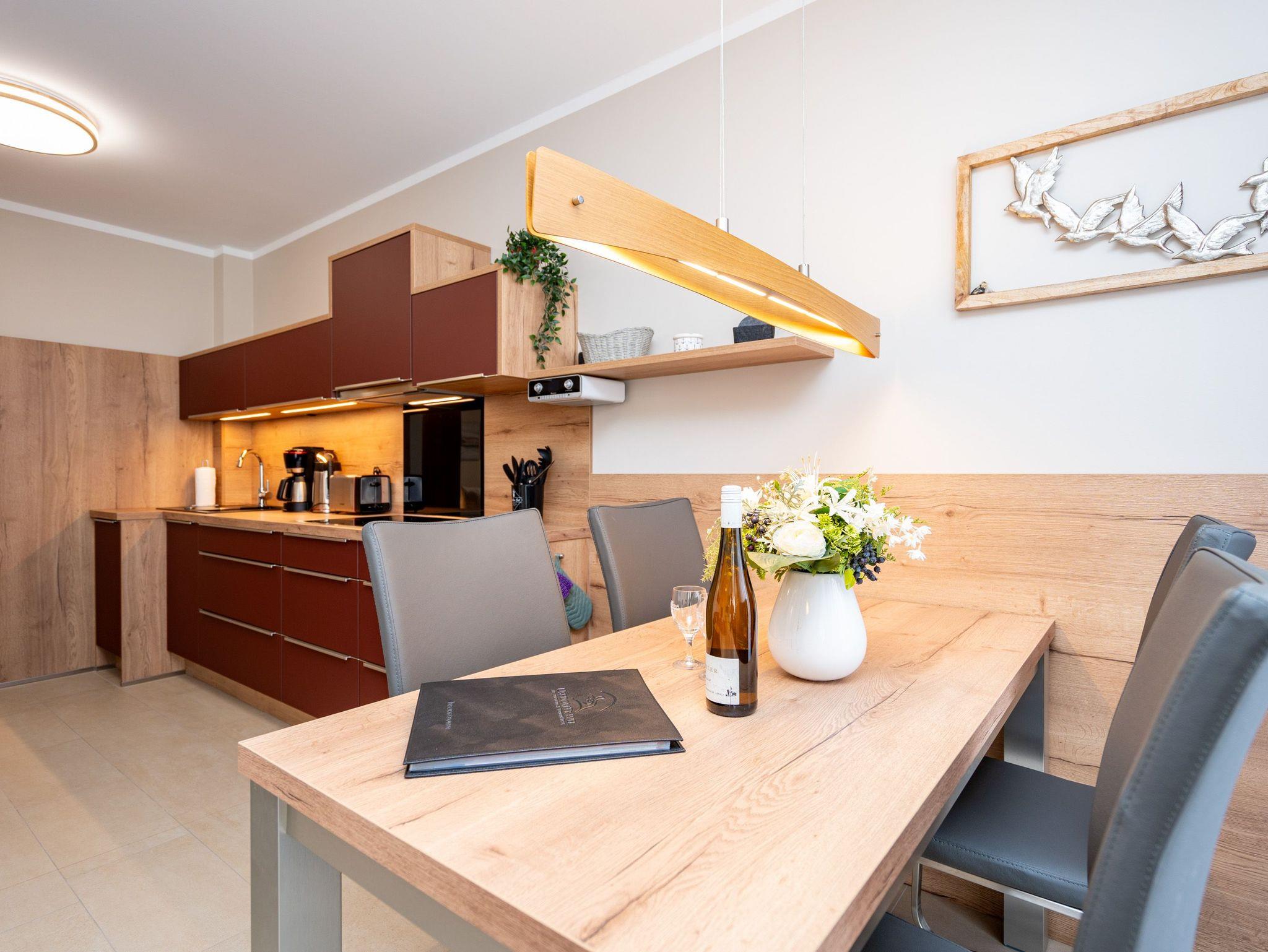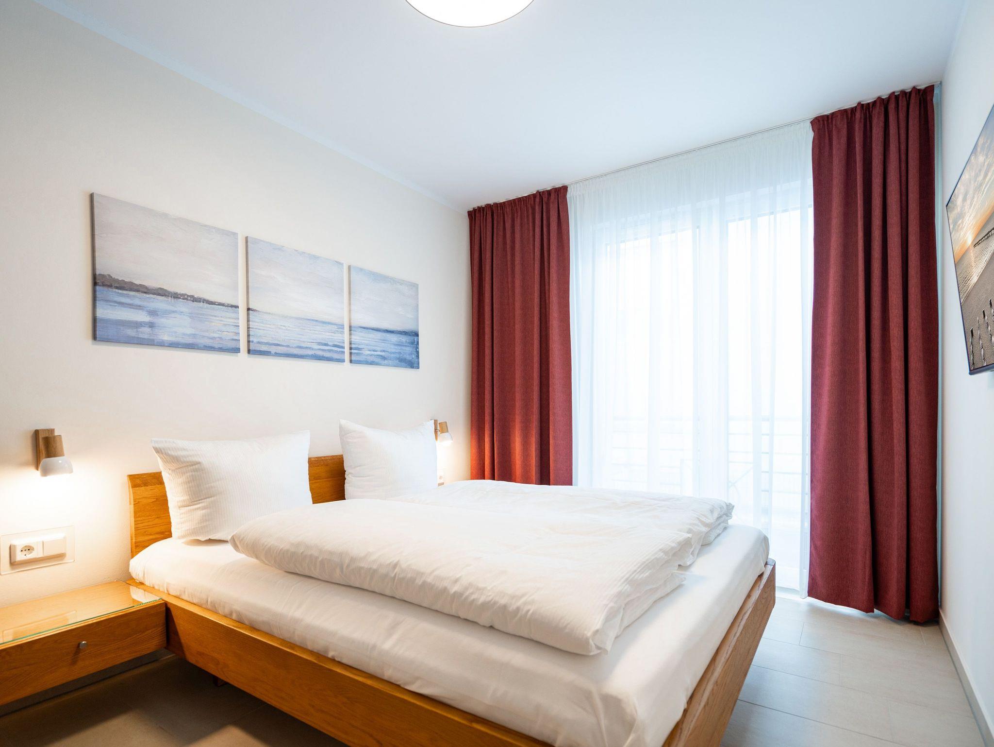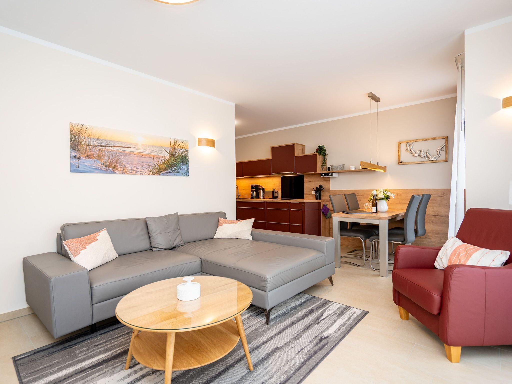 Die 3-Raum-Ferienwohnung Nr. 02 im Erdgeschoss des Quartier 6 bietet auf 73 m² Platz für bis zu 4 Personen und überzeugt mit einer modernen und komfortablen Ausstattung. Der offene Wohnbereich verfügt über eine voll ausgestattete Küchenzeile mit Induktionsherd, Mikrowelle und Backofen. Ein Essplatz für 4 Personen lädt zu gemeinsamen Mahlzeiten ein, während die gemütliche Sitzgruppe mit Flat-TV und ein per Fernbedienung gesteuerter Gas-Kamin für entspannte Abende sorgen. Von hier aus gelangen Sie auf die sonnige Süd-West-Terrasse mit einer Fläche von 10 m², die einen seitlichen Blick in Richtung Ostsee bietet. Die Ferienwohnung verfügt über zwei Schlafzimmer, jeweils mit einem Doppelbett (1,60 m x 2,00 m), Kleiderschrank und Flat-TV ausgestattet. Es stehen Ihnen zwei Bäder zur Verfügung: das erste innenliegende Bad bietet eine Dusche, einen Waschtisch, einen Haarfön und ein WC, während das zweite Bad ebenfalls mit Dusche, Waschtisch und WC ausgestattet ist und zusätzlich über eine Infrarotwärmekabine verfügt. Ein Hauswirtschaftsraum mit Waschmaschine und Trockner sorgt für zusätzlichen Komfort. Zur Wohnung gehört ein PKW-Stellplatz in der Tiefgarage sowie ein eigener Abstellraum im Keller für Fahrräder.