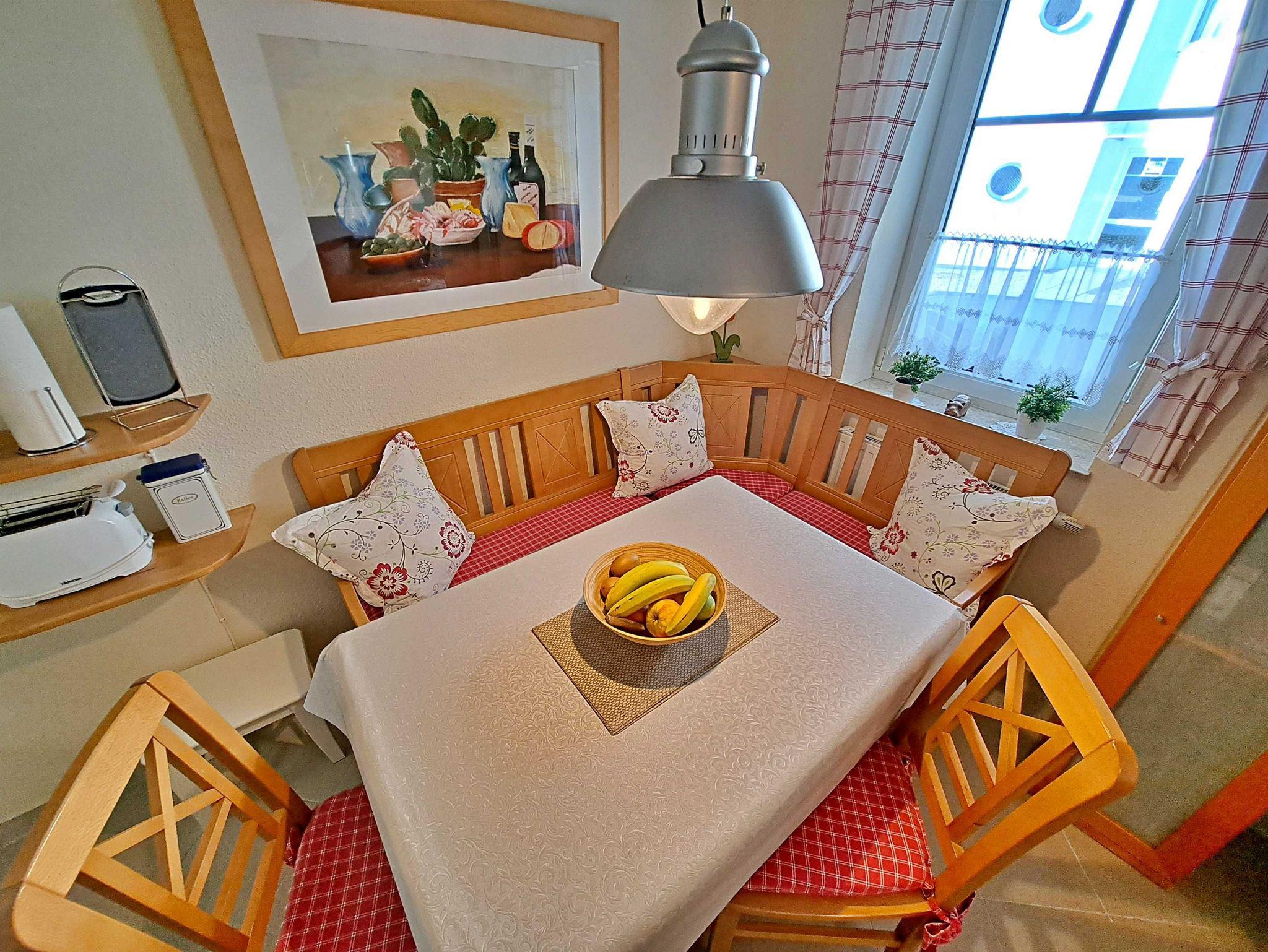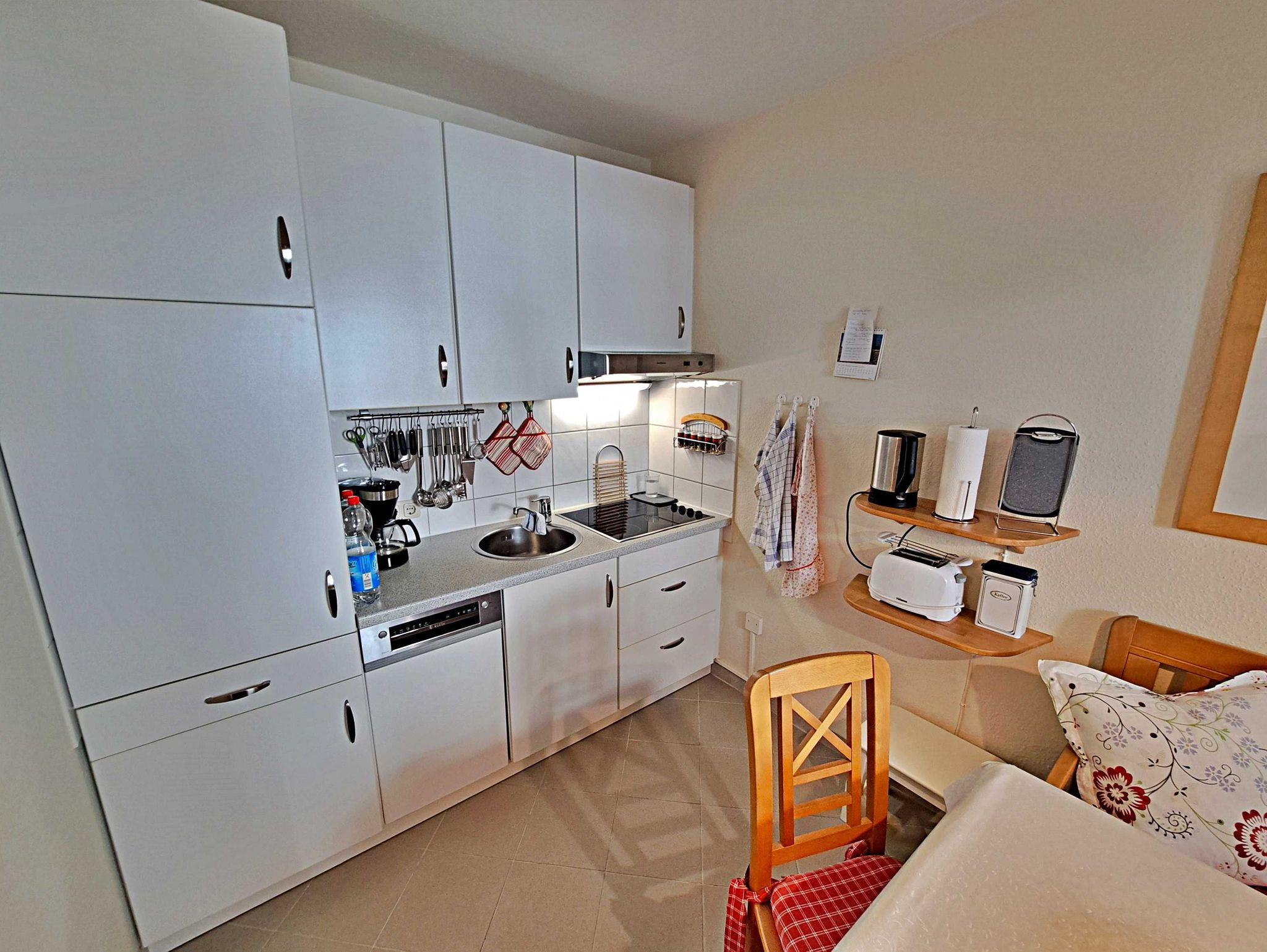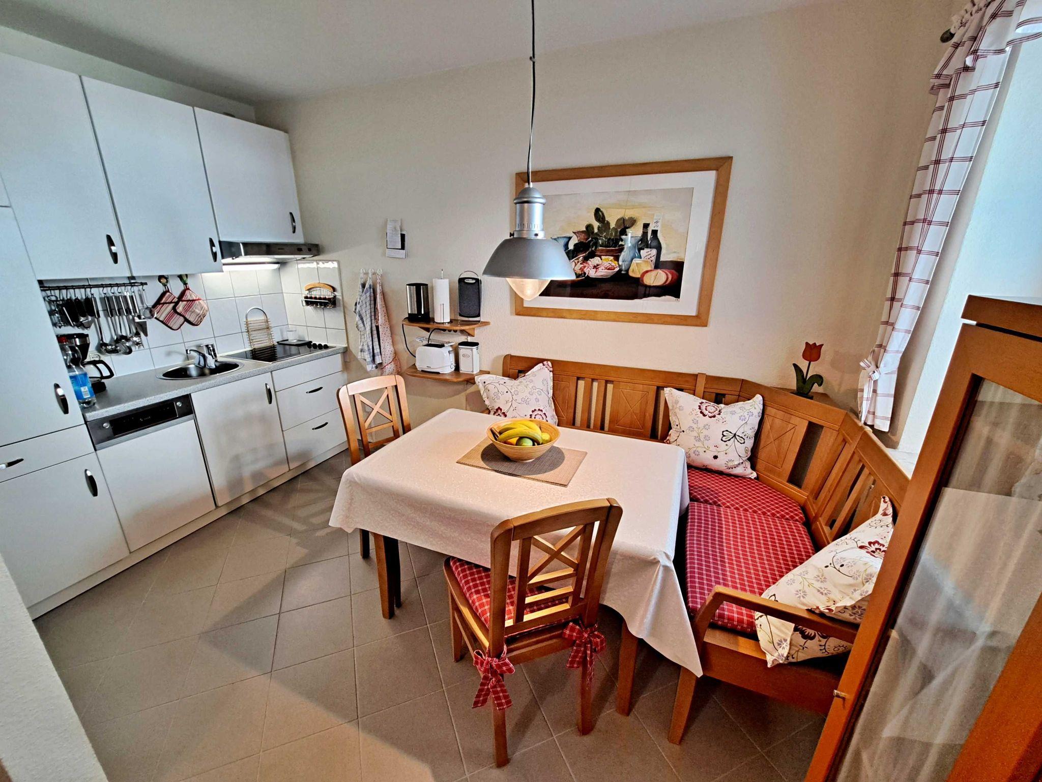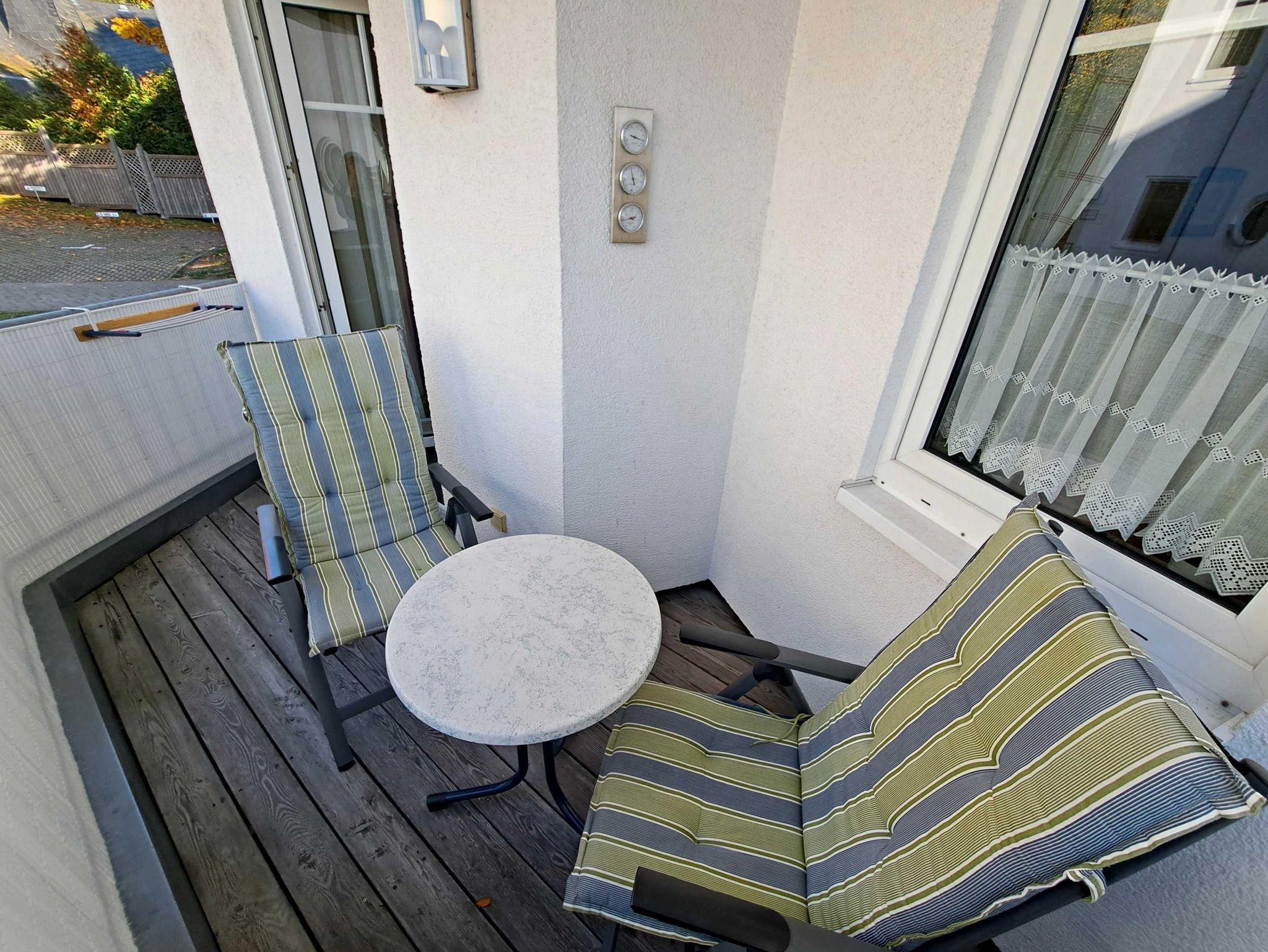Herzlich willkommen in dieser gemütlichen und gepflegten Wohnung! Sie befindet sich im Erdgeschoss und besticht durch geschmackvoll eingerichtete Zimmer. Das Wohnzimmer und die Küche sind durch einen offenen Wanddurchbruch miteinander verbunden, was für eine einladende Atmosphäre sorgt. Im Wohnzimmer finden Sie neben einem Flachbild-TV auch zwei bequeme Sessel und ein Sofa, das sich bei Bedarf in ein Schlafsofa (1,30 m x 2,00 m) umwandeln lässt - ideal, wenn Sie getrennt schlafen möchten. Für die kleinen Gäste steht ein Kinderreisebett sowie ein Hochstuhl bereit, damit sich auch die Jüngsten wohlfühlen. Genießen Sie die warmen Sommermonate auf dem möblierten Balkon in Süd-West-Richtung, der vom Wohnzimmer aus zugänglich ist. Hier können Sie morgens Ihr Frühstück genießen oder den erlebnisreichen Tag bei einem Glas Wein ausklingen lassen. Die Küche ist modern ausgestattet mit einem Cerankochfeld, Spülmaschine, Kaffeemaschine, Wasserkocher und Toaster. An dem großen Esszimmertisch gibt es genügend Platz um die selbstgekochten Mahlzeiten zu genießen - auf der gemütlichen Eckbank und den zwei Stühlen. Das separate Schlafzimmer bietet Ihnen ein komfortables Doppelbett (Liegefläche 1,80 x 2,00 m) sowie einen Kleiderschrank mit ausreichend Ablagemöglichkeiten und Bügeln für Ihre Kleidung. Das Badezimmer ist mit einer Dusche und WC ausgestattet. Ihr Auto und Ihre Fahrräder sind sicher in der Tiefgarage untergebracht, die eine Einfahrthöhe von 2 m und eine Einfahrtsbreite von 2 m bietet.