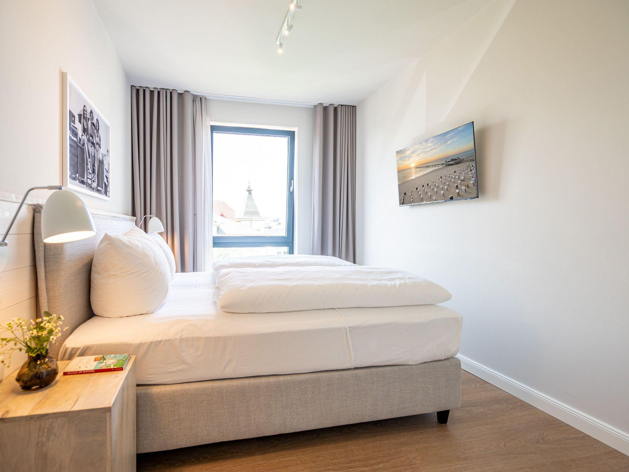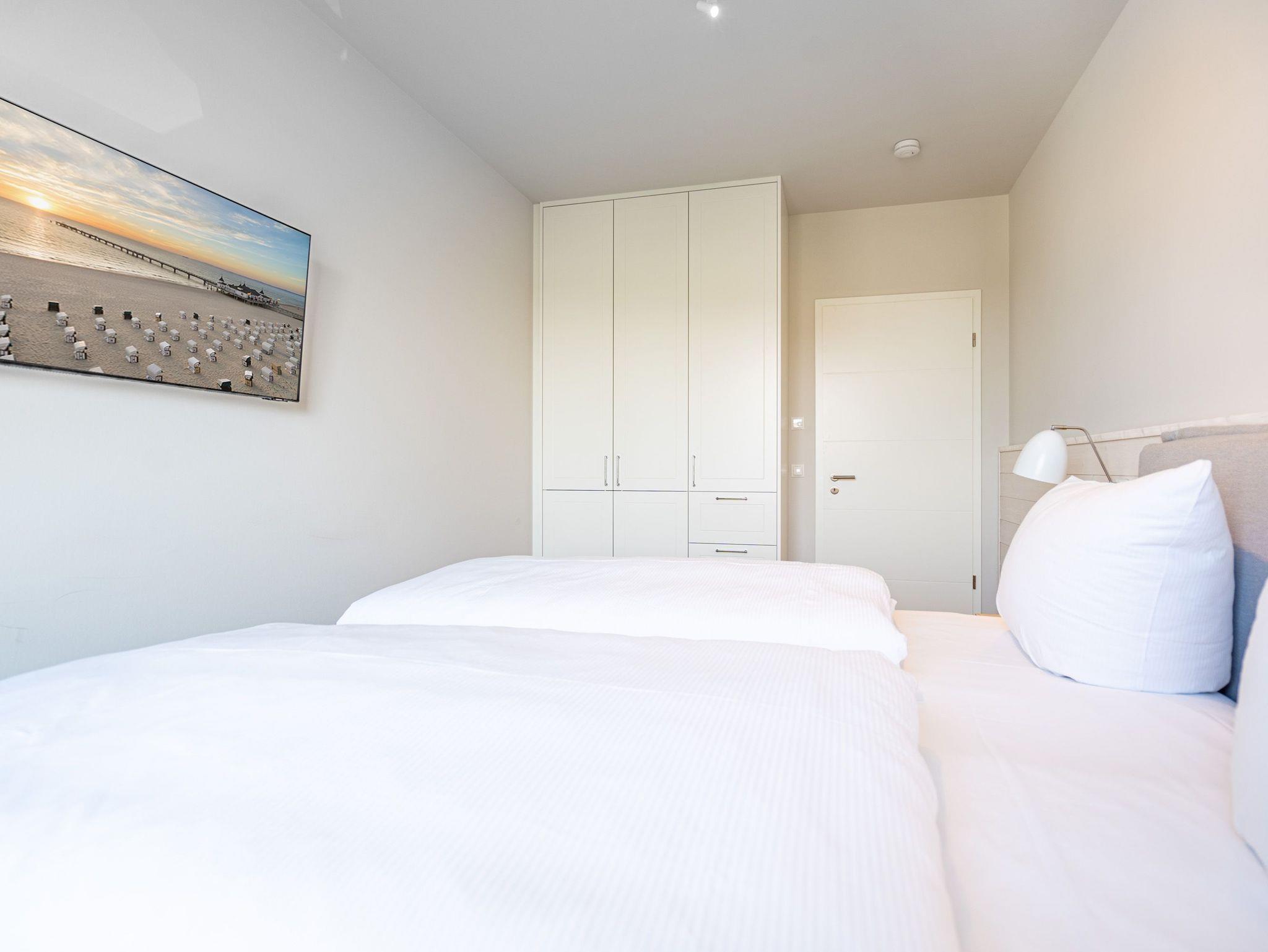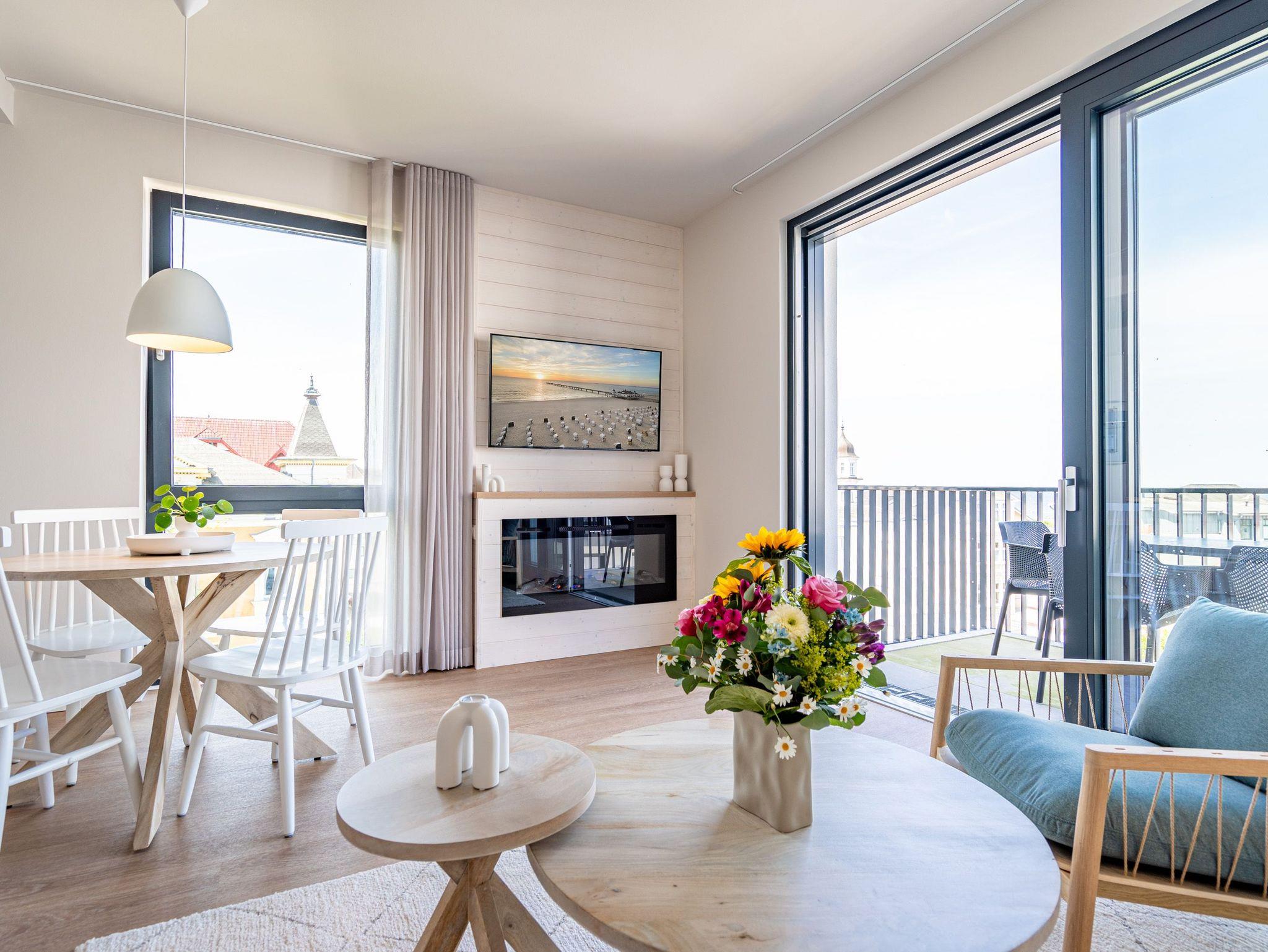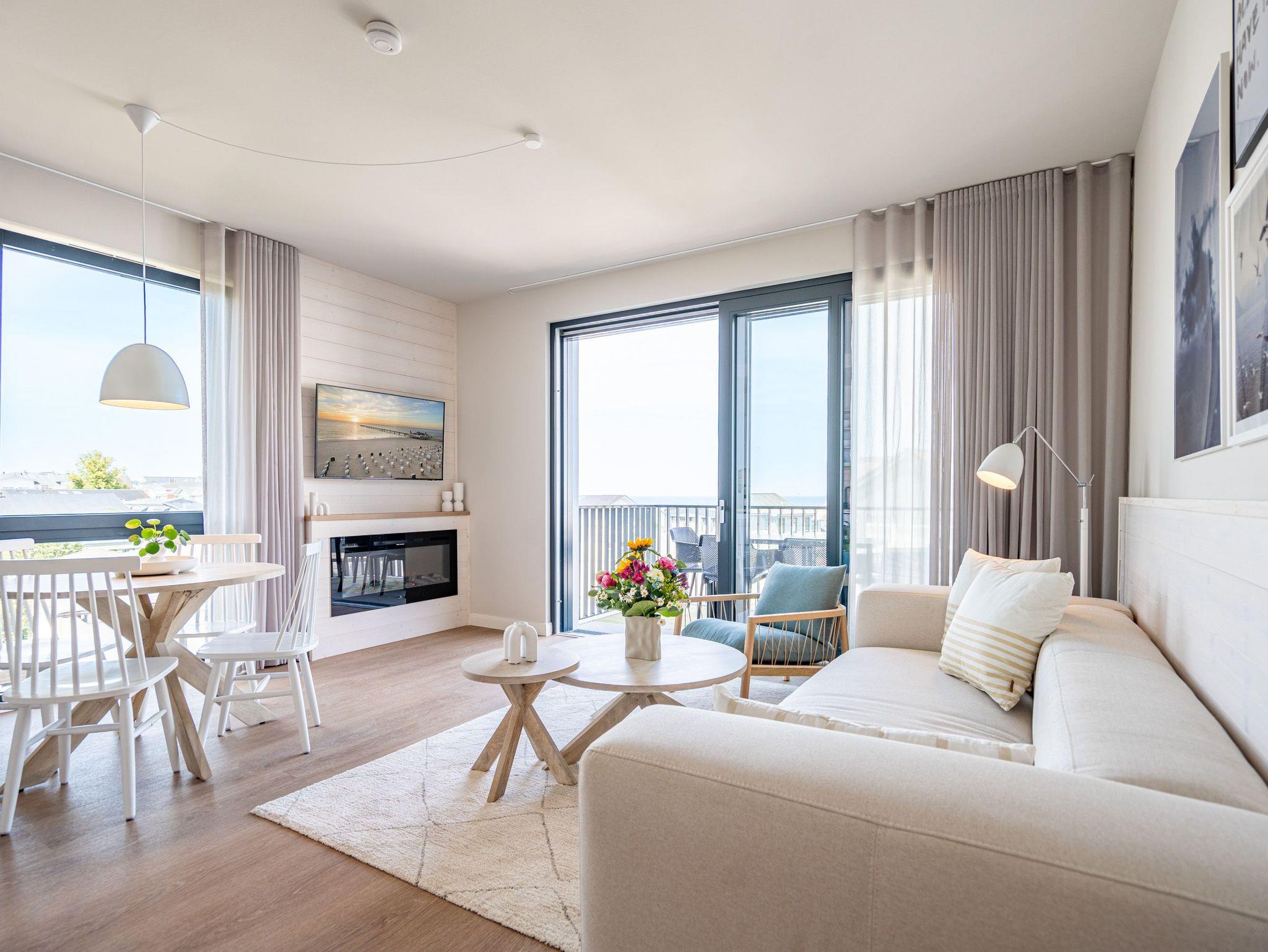 Im 3-Raum-Appartement B 3.8 (Haus B) im 3. Obergeschoss der Strandterrasse können Sie die Ostsee nicht nur rauschen hören, Sie können sich auch in jedem Moment Ihres Aufenthaltes in dieser charmanten und eleganten Ferienwohnung am endlosen Blau bis an den Horizont erfreuen. Die großen Fenster und der Nord-West-Balkon bieten Ihnen eine wahrhaft atemberaubende Aussicht auf das ersehnte Urlaubsziel. Zudem erwartet Sie in den 62 Quadratmetern ein behagliches und komfortables Zuhause auf Zeit. Helle, lichtdurchflutete Räume, eine stylische und moderne Einrichtung und viele weitere Annehmlichkeiten machen dieses Domizil für 4 Personen zu einem wundervollen Ausgangspunkt für entspannte und unvergesslich schöne Tage an der Ostsee. Ein großzügiges Wohn-Esszimmer sorgt für eine heimelige Atmosphäre. Relaxen Sie auf dem Sofa oder dem Sessel mit Blick auf einen Elektrokamin (ohne Wärmeabgabe) und einen 50 Zoll-Flat-TV. Kuschelige Abende mit spannenden Filmen oder anregenden Gesprächen sind hier garantiert. Genießen Sie die Mahlzeiten am großen Esstisch, die Sie in der offenen Küche ganz easy zubereiten können. Denn die ist mit hochwertigen Elektrogeräten wie einem Backofen, einem 4-Platten-Induktionsherd, einer Kaffeemaschine und einer Nespresso-Kapselmaschine bestens ausgestattet. Vom Balkon aus haben Sie einen herrlichen Blick auf die historische Seebrücke von Ahlbeck und über die Ostsee. Mit einem Tisch und 4 Stühlen ausgestattet, ist dies der ideale Ort, um bei einem Glas Wein den Sonnenuntergang zu genießen oder den Tag mit einem Frühstück im Freien zu beginnen. Die beiden Schlafzimmer sind jeweils mit einem komfortablen Boxspringdoppelbett (1,80m x 2,00m), einem geräumigen Kleiderschrank und einem Flat-TV (43 Zoll) ausgestattet. Zwei moderne Duschbäder mit Waschtisch und WC bieten Komfort für alle Gäste. Zur Wohnung gehört in der Tiefgarage ein PKW-Stellplatz. Es ist also alles da, was man sich für eine entspannte Zeit am Meer nur wünschen kann. Erleben Sie einen unvergesslichen Aufenthalt in diesem charmanten Ferienappartement und genießen Sie die Schönheit der Küste direkt vor Ihrer Tür.