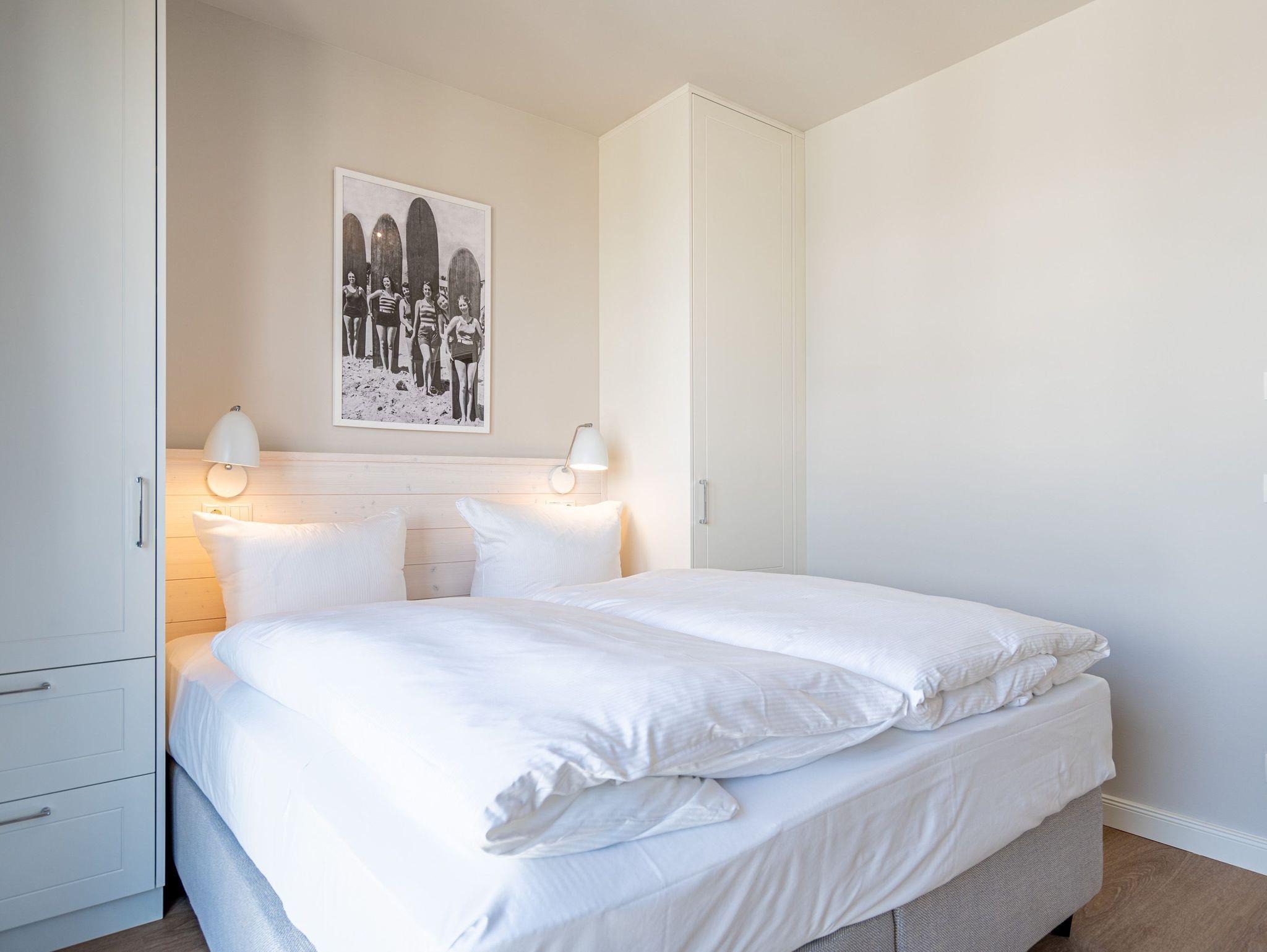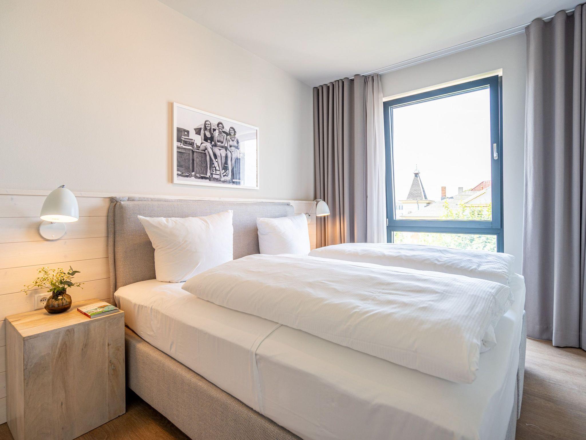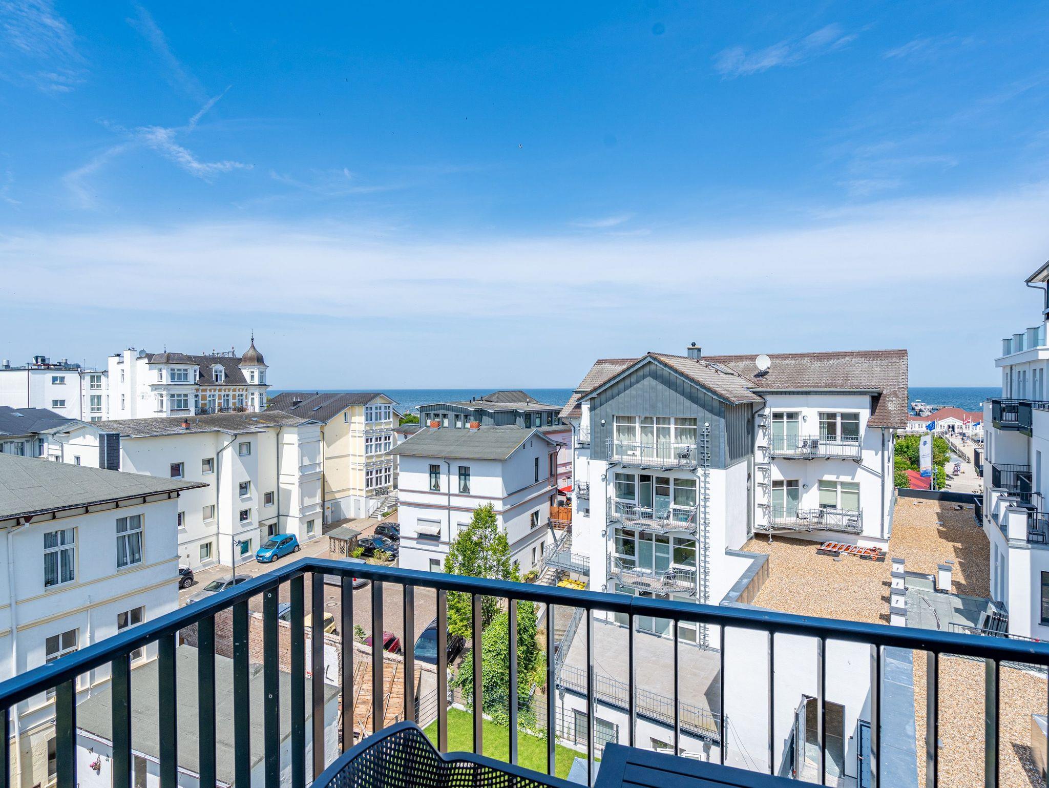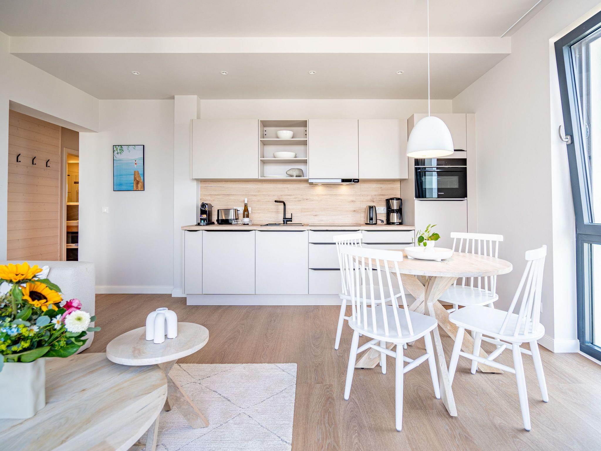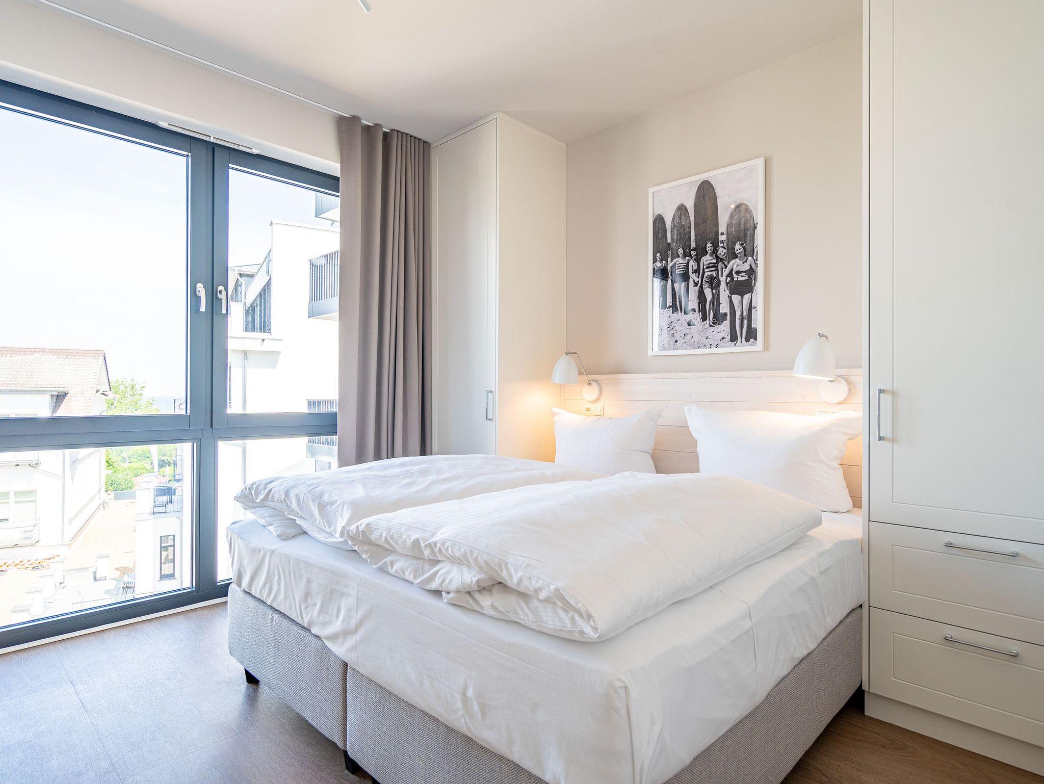 Im 3-Raum-Appartement B 3.8 (Haus B) im 3. Obergeschoss der Strandterrasse können Sie die Ostsee nicht nur rauschen hören, Sie können sich auch in jedem Moment Ihres Aufenthaltes in dieser charmanten und eleganten Ferienwohnung am endlosen Blau bis an den Horizont erfreuen. Die großen Fenster und der Nord-West-Balkon bieten Ihnen eine wahrhaft atemberaubende Aussicht auf das ersehnte Urlaubsziel. Zudem erwartet Sie in den 62 Quadratmetern ein behagliches und komfortables Zuhause auf Zeit. Helle, lichtdurchflutete Räume, eine stylische und moderne Einrichtung und viele weitere Annehmlichkeiten machen dieses Domizil für 4 Personen zu einem wundervollen Ausgangspunkt für entspannte und unvergesslich schöne Tage an der Ostsee. Ein großzügiges Wohn-Esszimmer sorgt für eine heimelige Atmosphäre. Relaxen Sie auf dem Sofa oder dem Sessel mit Blick auf einen Elektrokamin (ohne Wärmeabgabe) und einen 50 Zoll-Flat-TV. Kuschelige Abende mit spannenden Filmen oder anregenden Gesprächen sind hier garantiert. Genießen Sie die Mahlzeiten am großen Esstisch, die Sie in der offenen Küche ganz easy zubereiten können. Denn die ist mit hochwertigen Elektrogeräten wie einem Backofen, einem 4-Platten-Induktionsherd, einer Kaffeemaschine und einer Nespresso-Kapselmaschine bestens ausgestattet. Vom Balkon aus haben Sie einen herrlichen Blick auf die historische Seebrücke von Ahlbeck und über die Ostsee. Mit einem Tisch und 4 Stühlen ausgestattet, ist dies der ideale Ort, um bei einem Glas Wein den Sonnenuntergang zu genießen oder den Tag mit einem Frühstück im Freien zu beginnen. Die beiden Schlafzimmer sind jeweils mit einem komfortablen Boxspringdoppelbett (1,80m x 2,00m), einem geräumigen Kleiderschrank und einem Flat-TV (43 Zoll) ausgestattet. Zwei moderne Duschbäder mit Waschtisch und WC bieten Komfort für alle Gäste. Zur Wohnung gehört in der Tiefgarage ein PKW-Stellplatz. Es ist also alles da, was man sich für eine entspannte Zeit am Meer nur wünschen kann. Erleben Sie einen unvergesslichen Aufenthalt in diesem charmanten Ferienappartement und genießen Sie die Schönheit der Küste direkt vor Ihrer Tür.