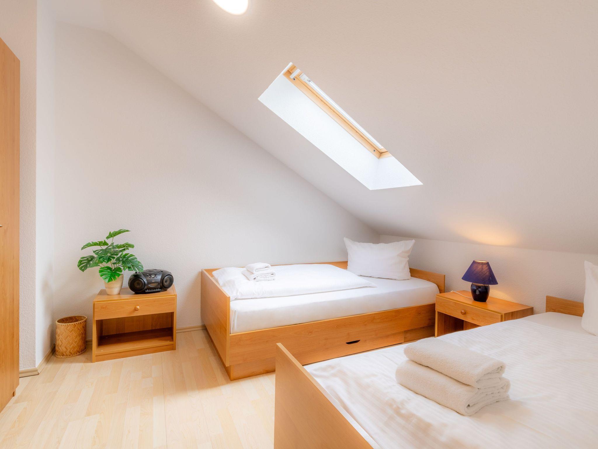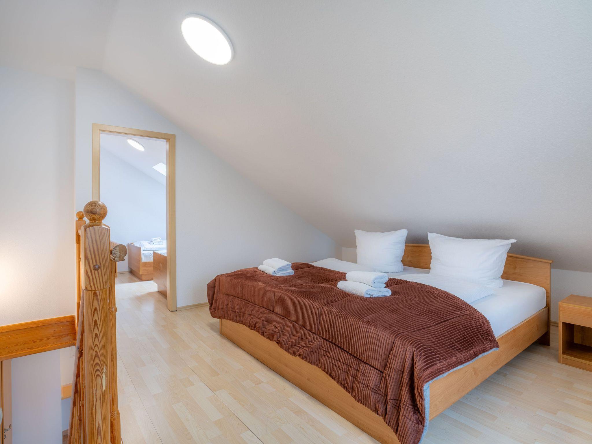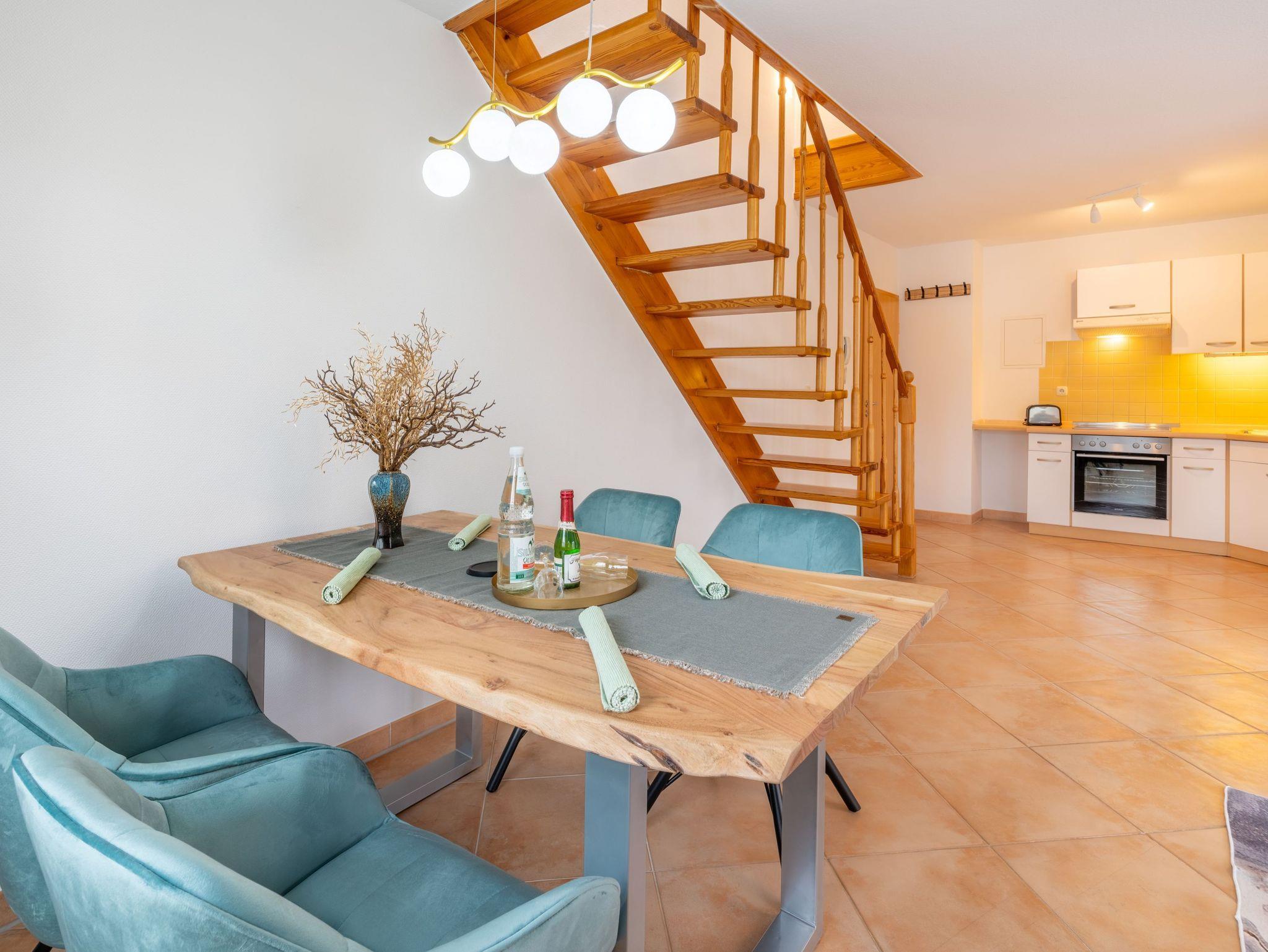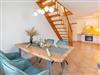 Die 53 qm große Maisonette-Ferienwohnung bietet Platz für max. 4 Personen. Die Wohnung verfügt über einen Wohnbereich und Küchenzeile, ein Badezimmer mit Dusche und WC und in der oberen Etage über ein Schlafzimmer mit einem Doppelbett und ein Schlafzimmer mit 2 Einzelbetten. Die Wohnung hat einen Balkon zur Gartenseite. Der Wohnbereich ist mit einer gemütlichen Sitzgruppe und einem Essplatz eingerichtet. Ebenso sind Kabel-TV und CD-Spieler mit Radio vorhanden.