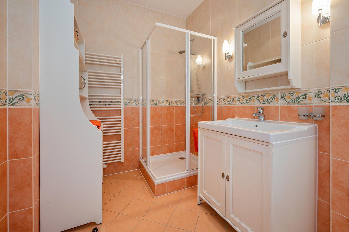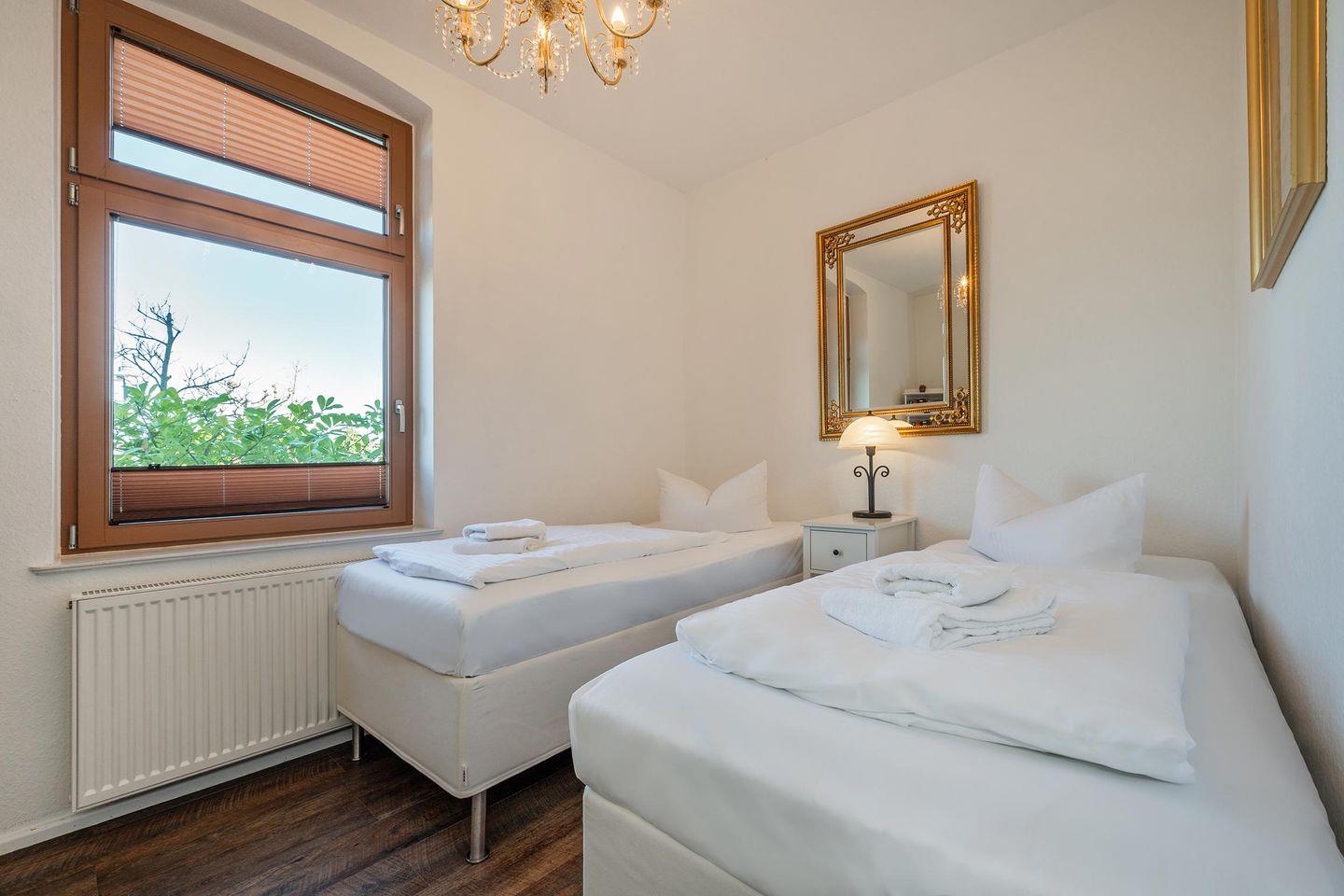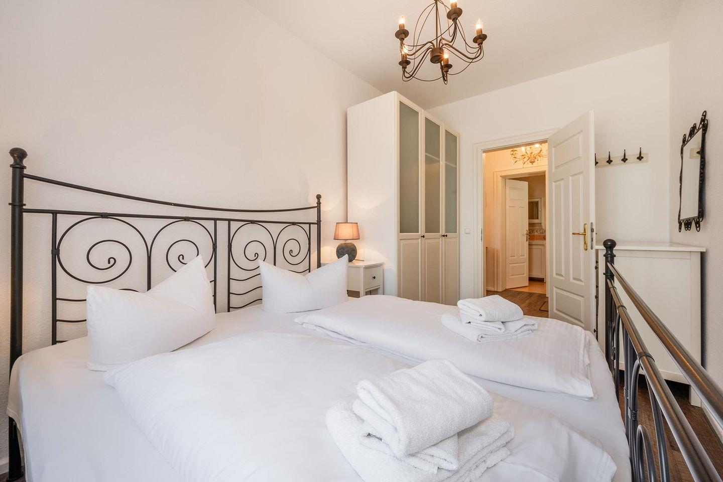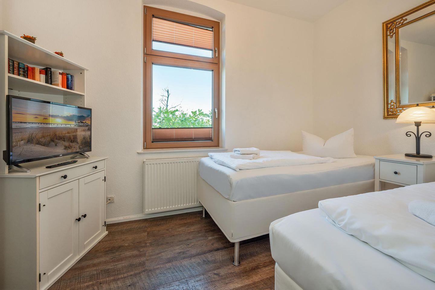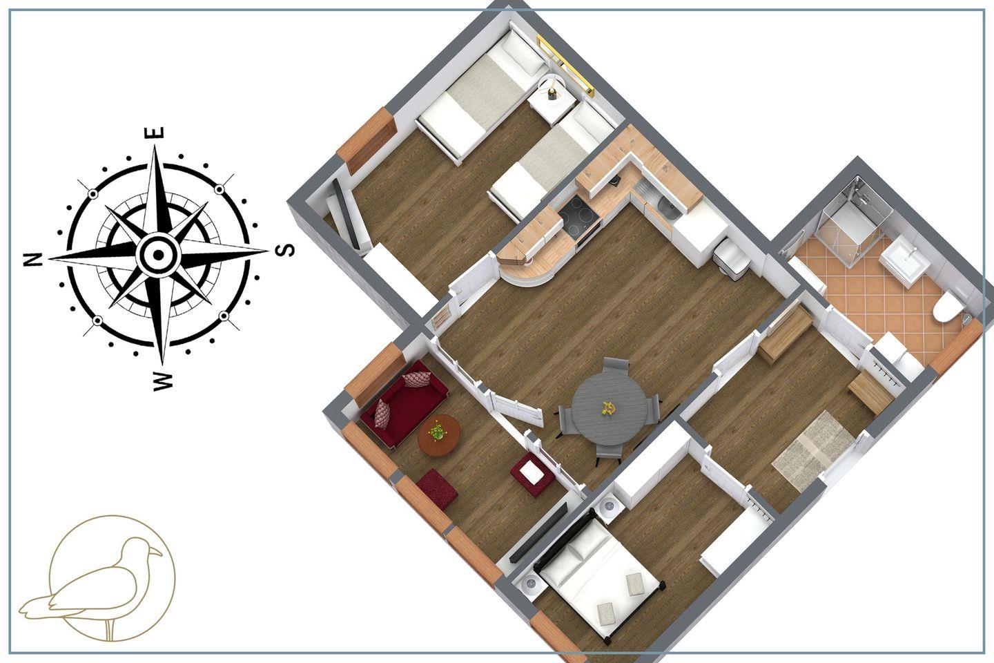 Die lichtdurchflutete Loggia ist freundlich und gemütlich eingerichtet mit einer Couchgarnitur, Hocker und einem Flat-TV. Setzen Sie sich zu entspannenden Filmeabenden zusammen oder beobachten Sie den Trubel auf der Promenade. Ihr Ausblick reicht mit wenigen Einschränkungen bis zum Meer. Anbei findet sich der Küchen- und Essbereich mit einem großen Esstisch, an dem vier Personen wunderbar sitzen können. Die Küche ist vollwertig ausgestattet und bietet Ihnen ein 4-Platten-Ceranherd, Backofen, Mikrowelle und eine Geschirrspülmaschine. Im ersten Schlafzimmer befindet sich ein Doppelbett mit einer Liegefläche von 1,80 x 2,00 Metern, ein Kleiderschrank und eine Kommode, die Ihnen zusätzlichen Stauraum bietet. Im zweiten Schlafzimmer befinden sich zwei Einzelbetten, welche ein Standardmaß von 0,90 x 2,00 Metern besitzen. Ein eigener Fernseher ist in diesem Raum ebenfalls vorhanden. Das in warmen Tönen gestaltete Bad ist ausgestattet mit WC, Waschtisch und einer Dusche. Das große Regal sorgt für ausreichend Ablagefläche für Ihre Hygieneartikel.