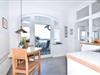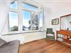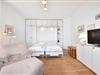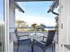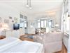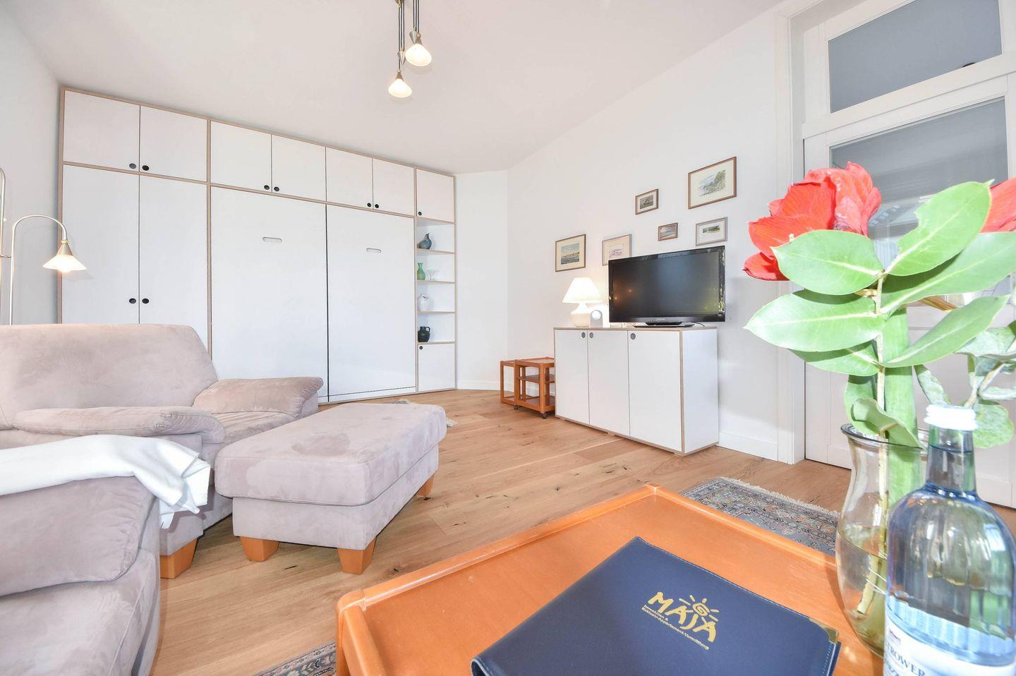 Der kombinierte Wohn- und Schlafraum ist stilvoll gestaltet und verfügt über ein komfortables Schrankklappbett für zwei Personen, das tagsüber dezent im Raum verschwindet und so ein großzügiges Wohngefühl schafft. Ein Fernseher sorgt für Unterhaltung, während der lichtdurchflutete Erker mit weiterem Ostseeblick und einer gemütlichen Schlafcouch ideal für ein Kind geeignet ist. Die klare Raumaufteilung und die freundliche Atmosphäre machen diese Wohnung zu einem idealen Rückzugsort nach einem Tag am Strand oder einem Ausflug über die Insel.