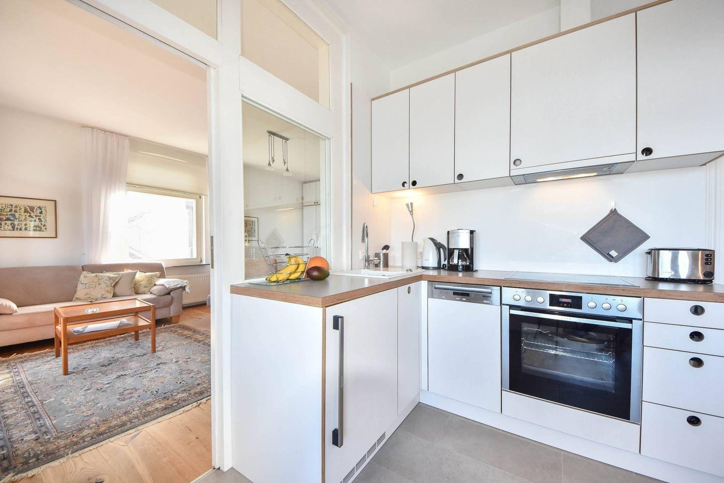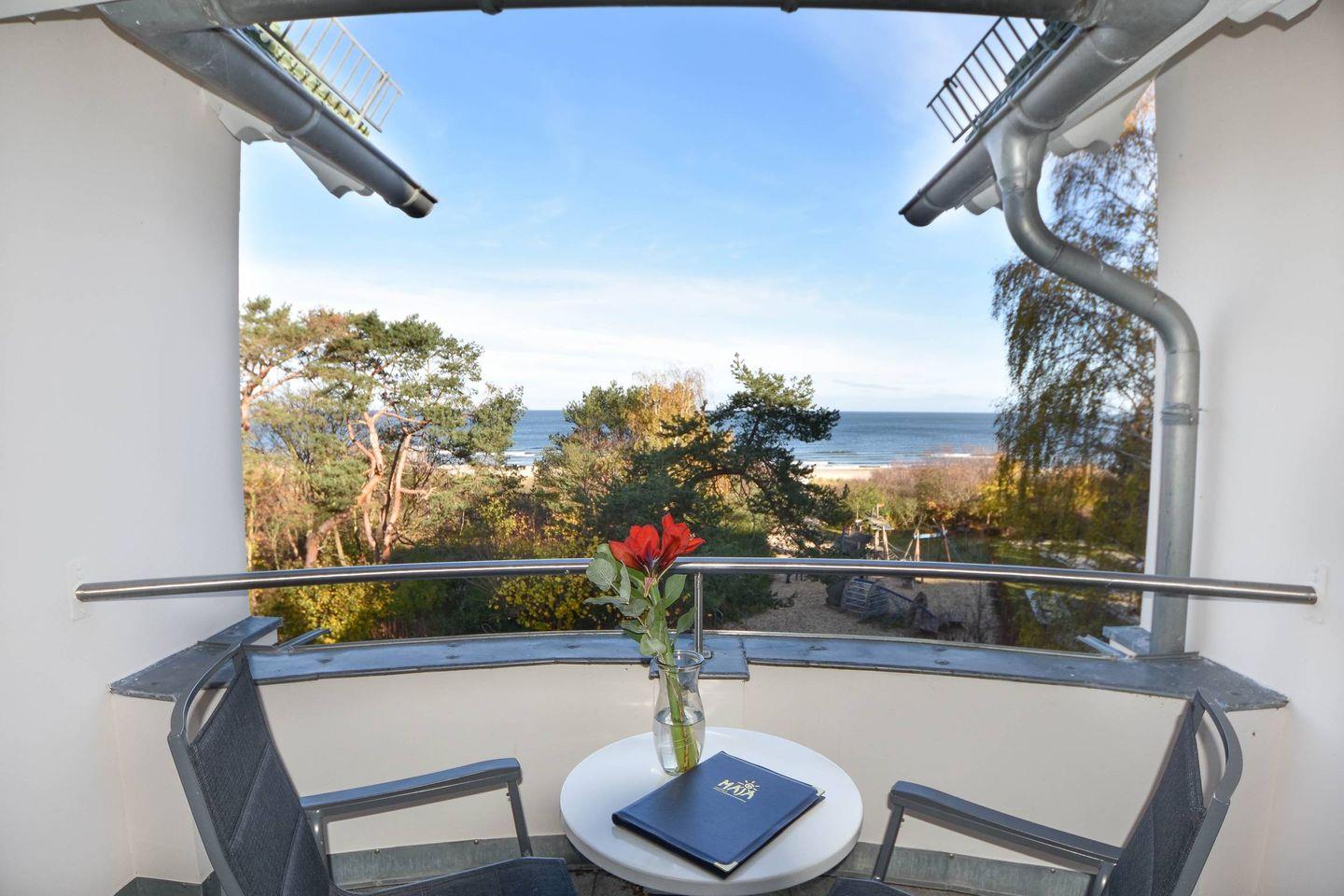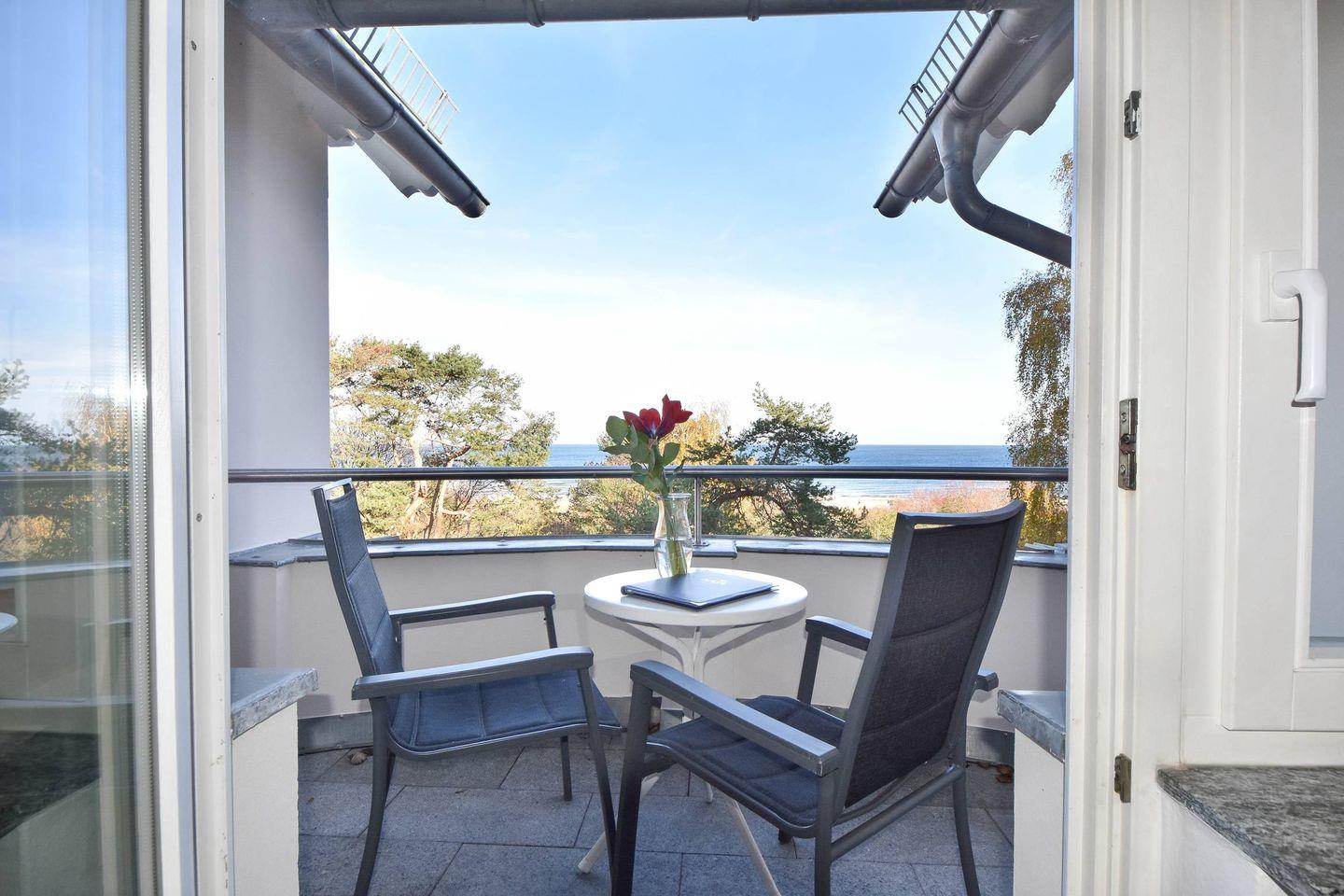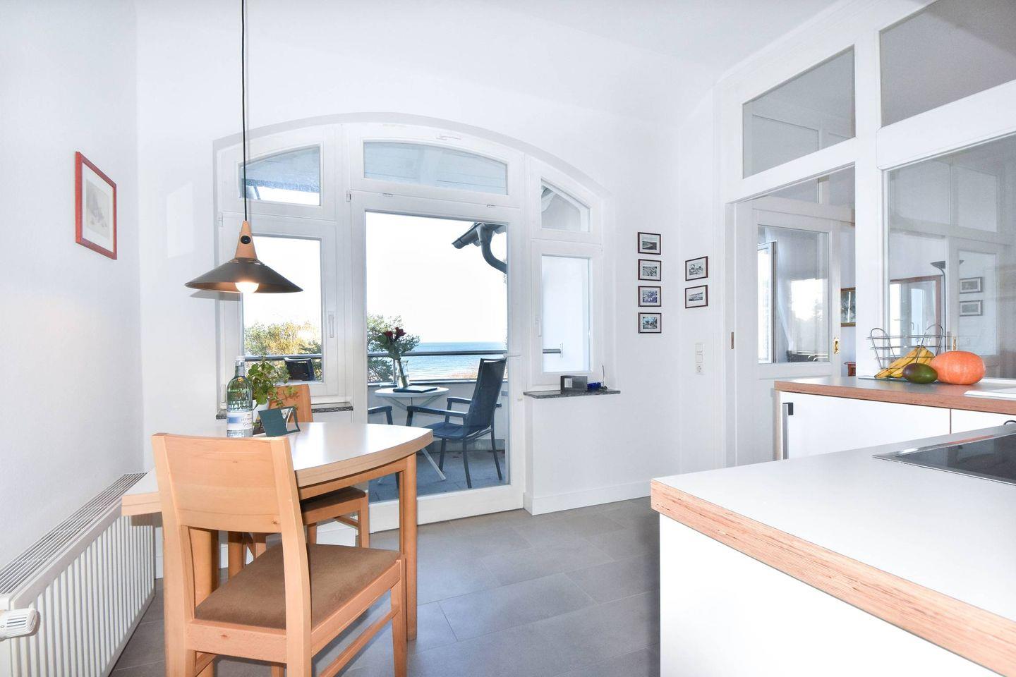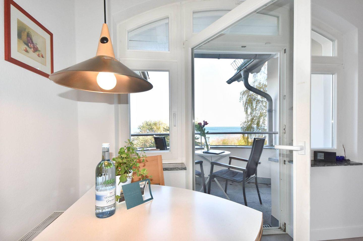 Die liebevoll eingerichtete Ferienwohnung befindet sich im zweiten Obergeschoss der denkmalgeschützten Villa Germania und bietet auf 50 m² Wohnfläche alles, was Sie für entspannte Urlaubstage benötigen. Die geschlossene Küche mit Esstisch ist komplett ausgestattet mit Cerankochfeld, Backofen, Spülmaschine und einem Kühlschrank mit Gefrierfach. Von hier aus gelangen Sie direkt auf den möblierten Balkon, der Ihnen einen traumhaften Blick auf die Ostsee schenkt – perfekt für ein Frühstück mit Meerblick oder einen stimmungsvollen Ausklang des Tages bei Sonnenuntergang.