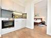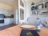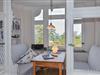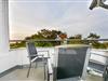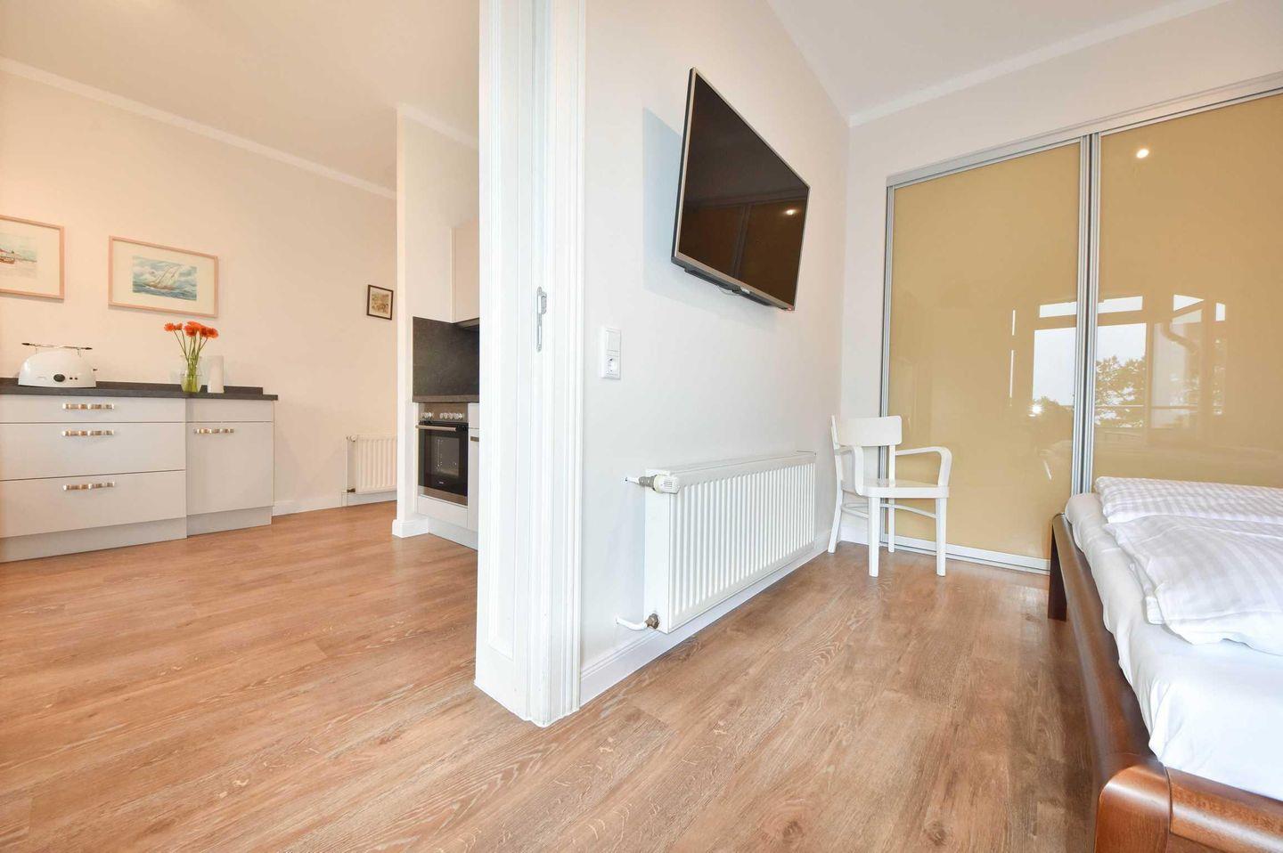 Der offene Wohnbereich verbindet gekonnt Wohn- und Esskomfort mit einem angenehmen Raumgefühl. Die moderne Küche ist offen gestaltet und bietet mit Backofen, Ceranfeld und einem Kühlschrank mit Gefrierfach alles, was für eine bequeme Selbstverpflegung notwendig ist. Die kleine Loggia mit eigener Sitzgelegenheit lädt bereits morgens zu einem Frühstück mit Meerblick ein – ein besonderer Genuss in dieser einzigartigen Umgebung. Ein kompaktes TV-Gerät sorgt für Unterhaltung auch an gemütlichen Abenden.