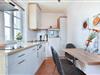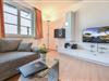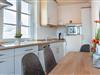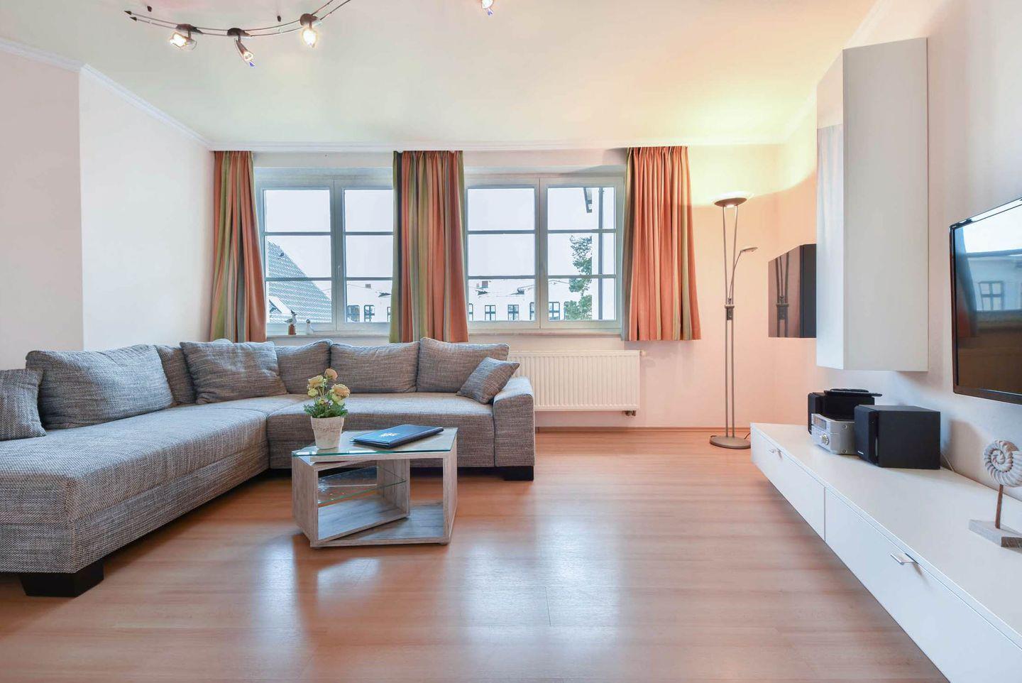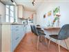 Die offene Küche ist mit allen nötigen Geräten ausgestattet, darunter ein 2-Platten-Cerankochfeld, Geschirrspüler, Mikrowelle und ein Kühlschrank. Der separate Esstisch lädt zum ausgedehnten Frühstück oder gemeinsamen Abendessen ein. Der angrenzende Wohnbereich ist praktisch und behaglich eingerichtet – mit einer bequemen Couch, die nicht nur zu erholsamen Fernsehabenden einlädt, sondern auch eine komfortable Schlafmöglichkeit für eine dritte Person bietet. Ein Flachbild-TV sorgt für Unterhaltung am Abend, während die Raumaufteilung ein angenehmes Raumgefühl vermittelt.