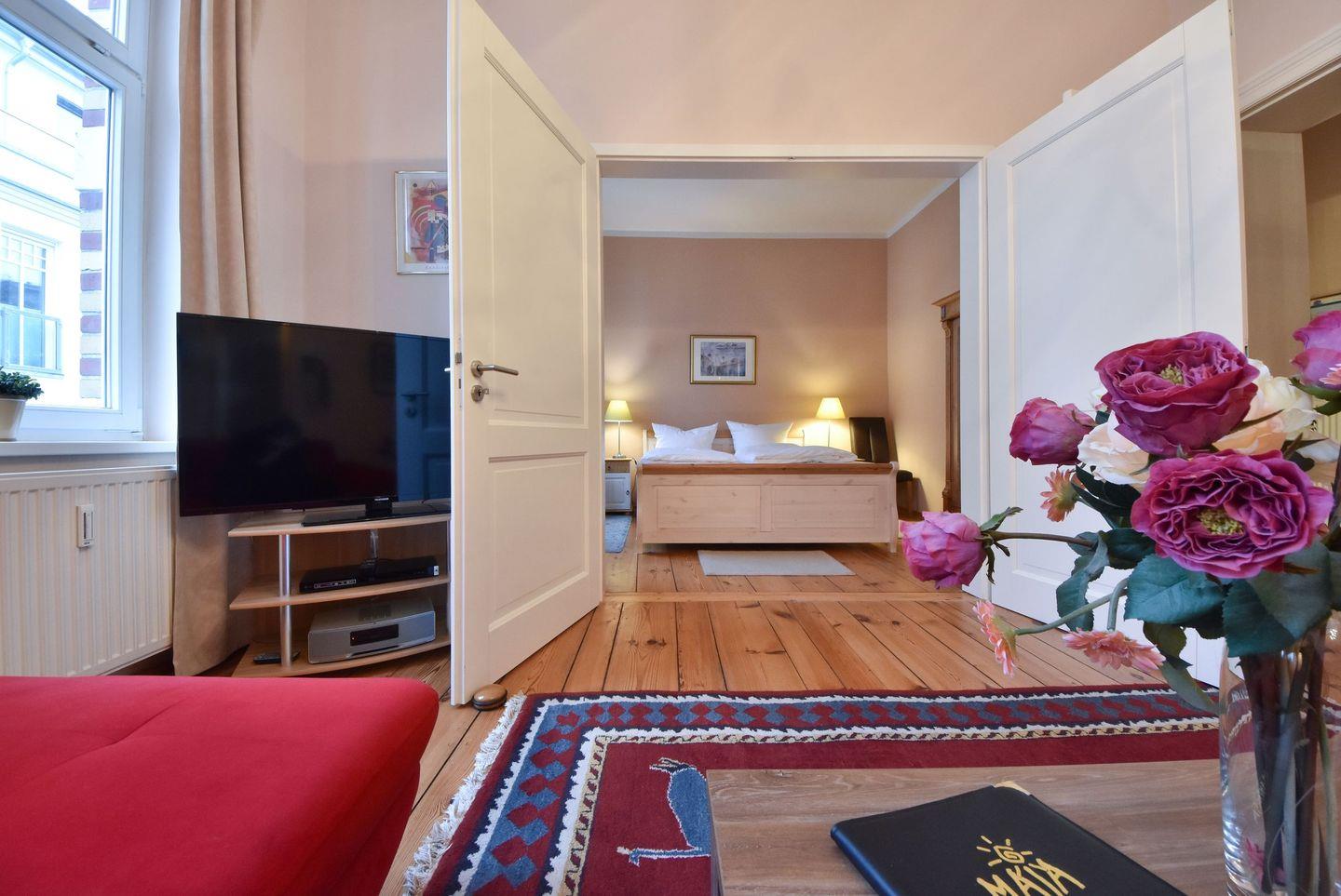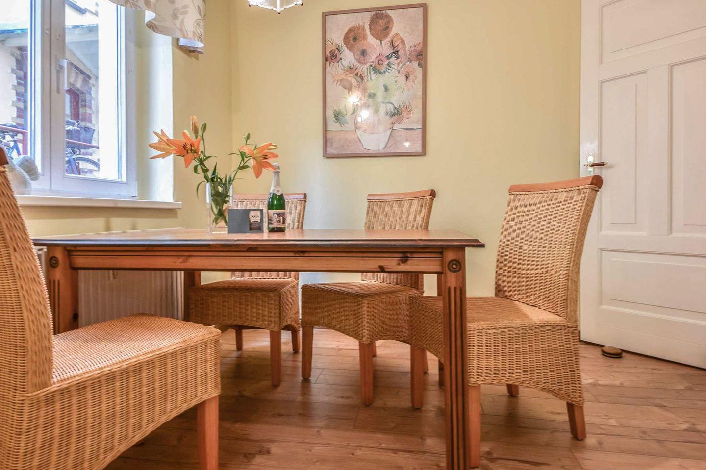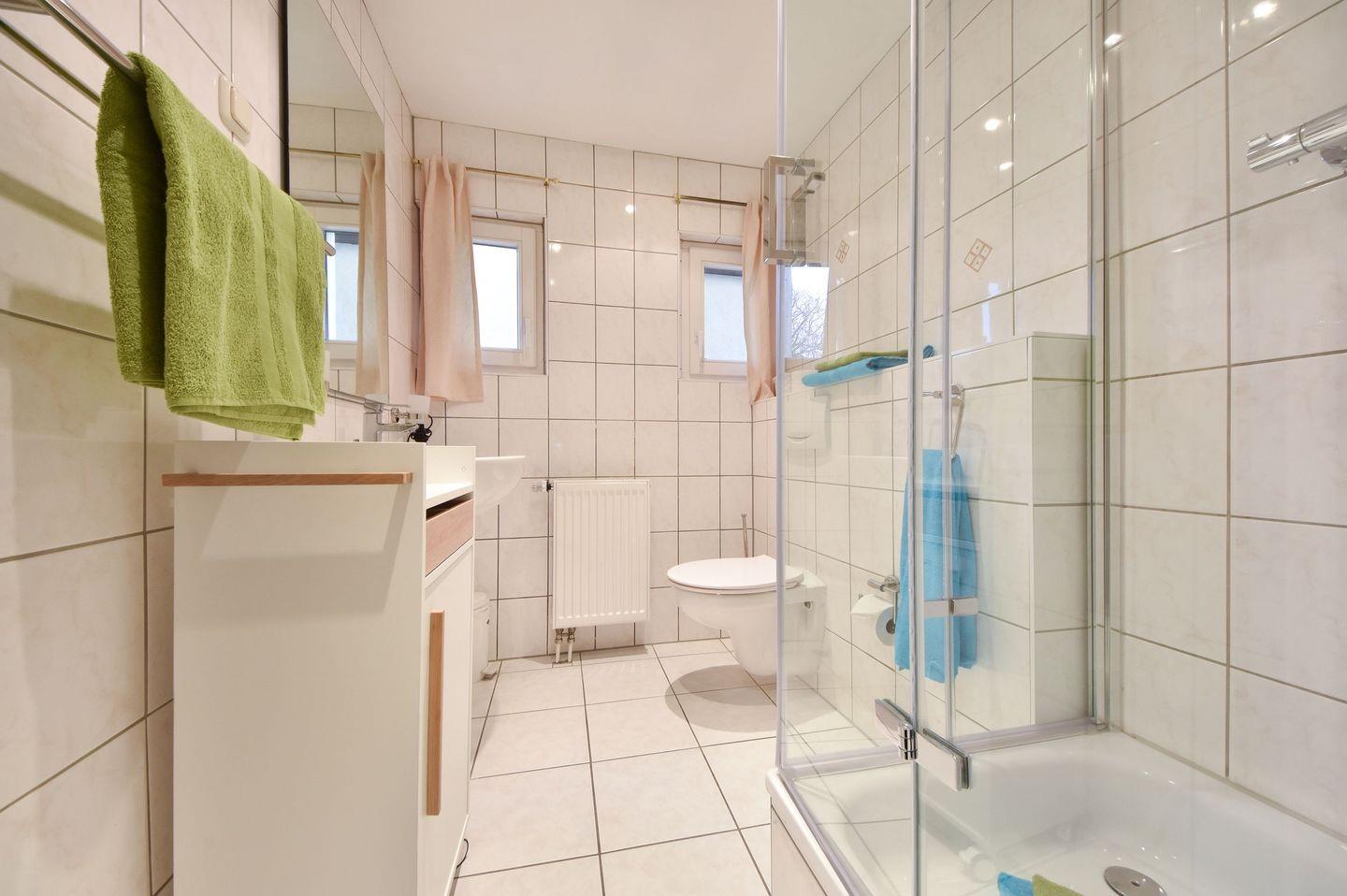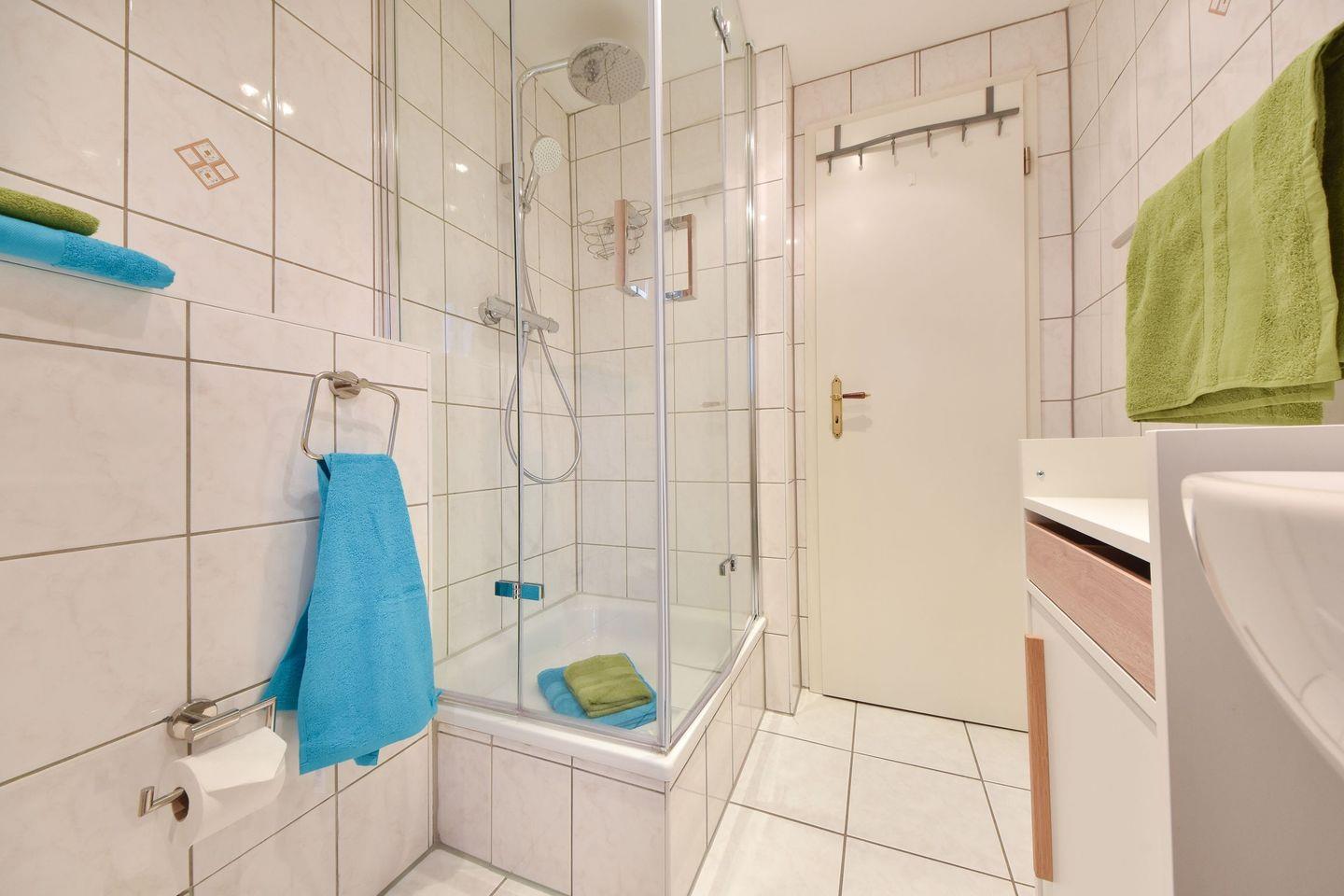 Das Schlafzimmer ist mit einem komfortablen Doppelbett (200?cm x 180?cm), verstellbaren Lattenrosten sowie einem geräumigen Kleiderschrank ausgestattet und sorgt für erholsamen Schlaf in ruhiger Umgebung. Das moderne Bad verfügt über eine Dusche, ein Waschbecken und ein WC. Die Wohnung ist bezugsfertig vorbereitet – alle Betten sind liebevoll bezogen, frische Handtücher liegen bereit, und eine sorgfältig zusammengestellte Grundausstattung erleichtert den sorgenfreien Start in die Ferien. WLAN ist kostenfrei verfügbar, ebenso ein eigener Stellplatz direkt am Haus. Für mitgebrachte Fahrräder steht ein abschließbarer Abstellraum zur Verfügung.