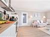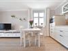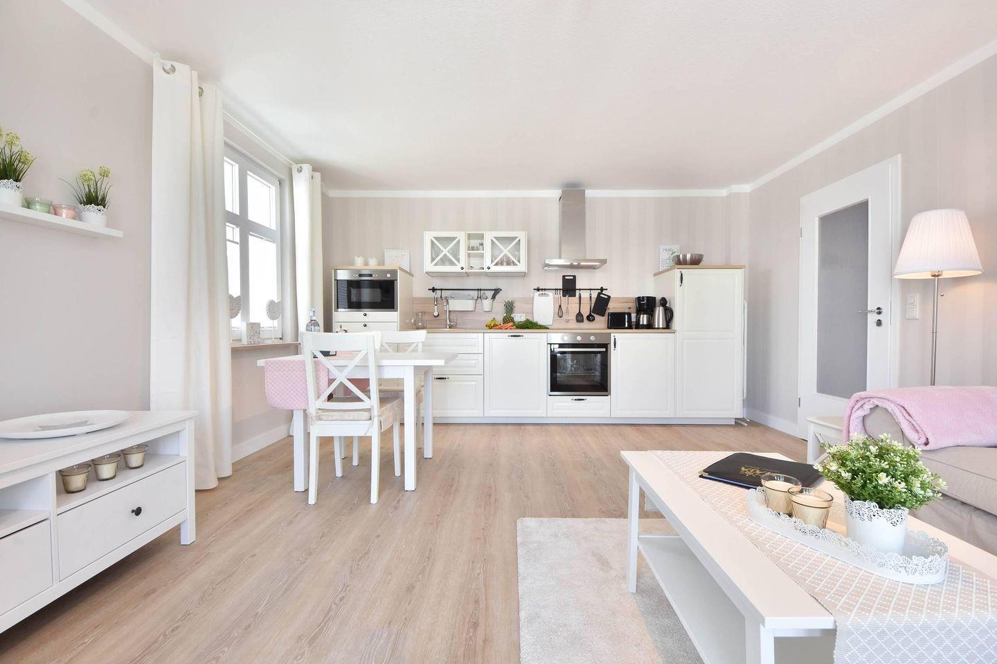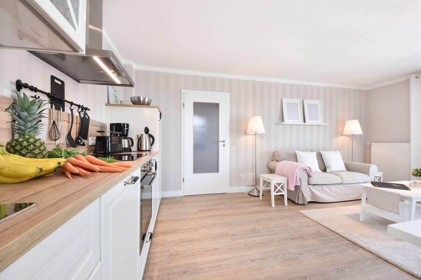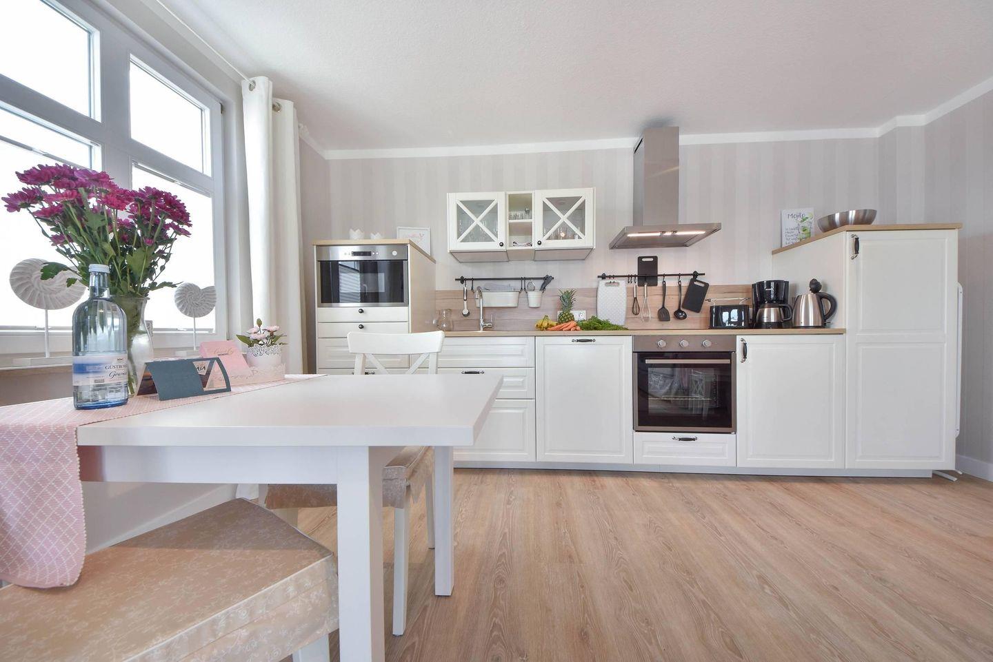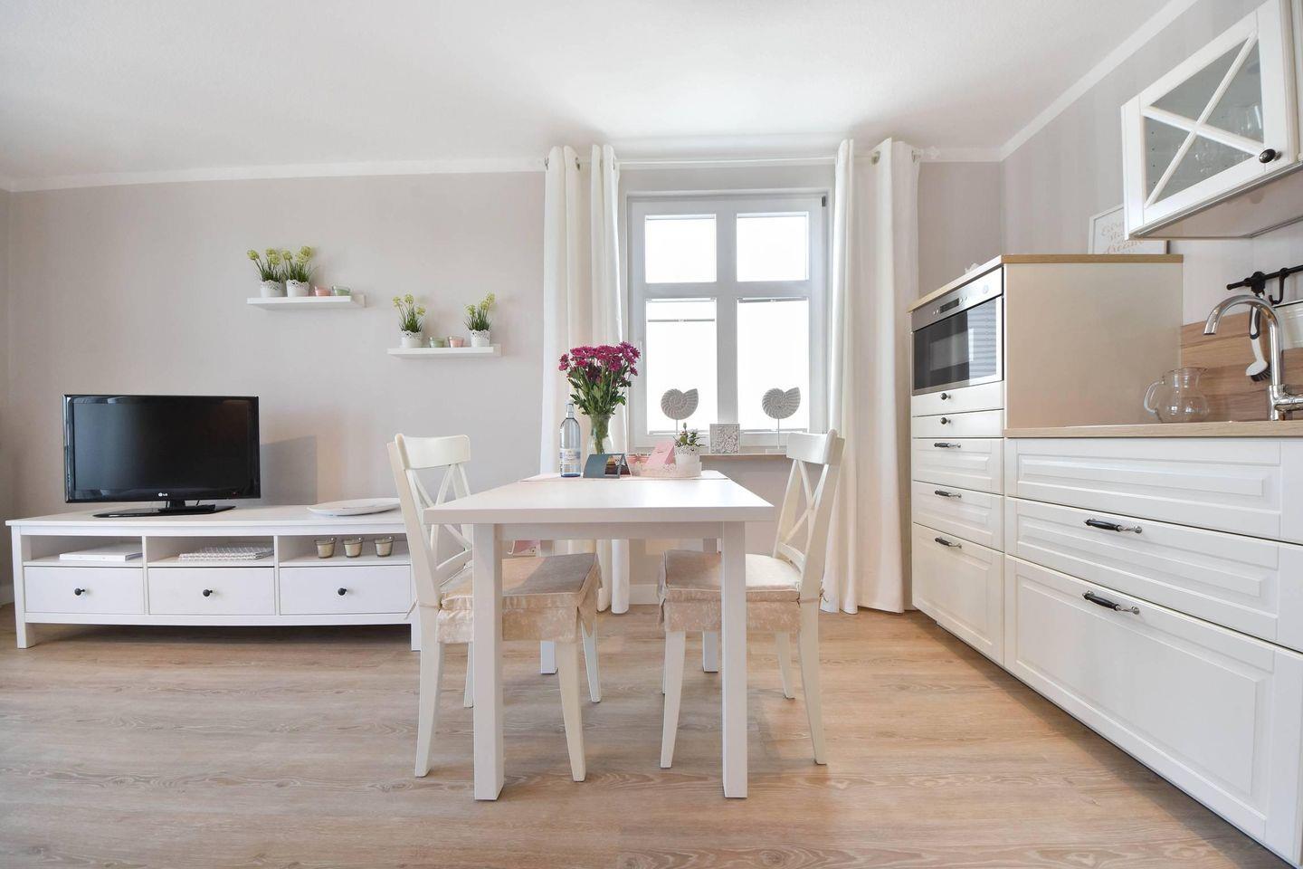 Die moderne und gut ausgestattete Küchenzeile verfügt über ein Ceran-Kochfeld, einen Backofen, eine Mikrowelle, einen Geschirrspüler und einen Kühlschrank mit Gefrierfach. Sie geht offen in den Wohnbereich über, der eine helle und freundliche Atmosphäre schafft. Der separate Essbereich ist perfekt für gemeinsame Mahlzeiten. Der gemütliche Wohnbereich ist mit einer bequemen Couch und einem TV-Gerät ausgestattet, ideal für entspannte Abende.