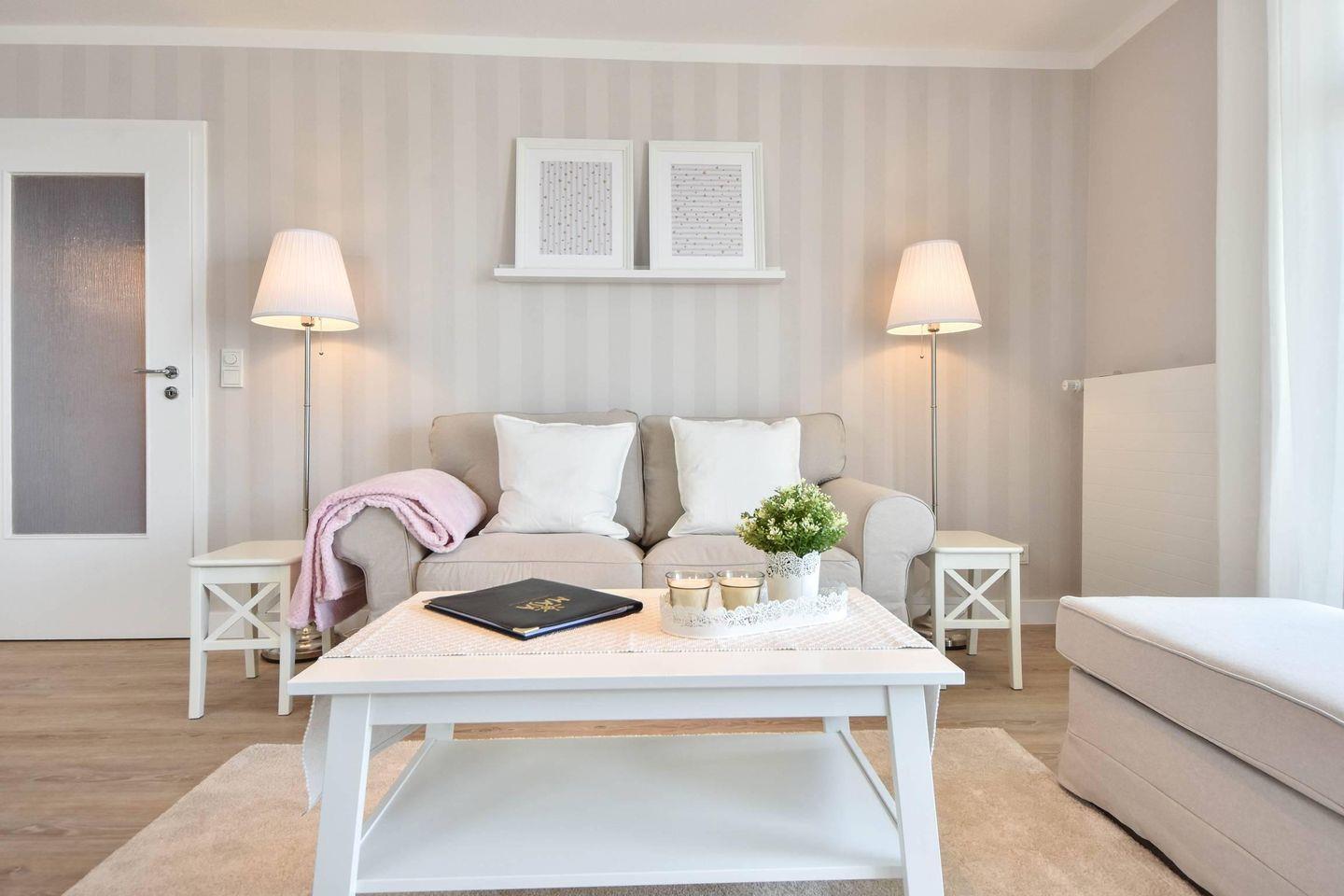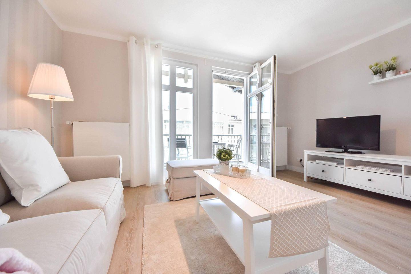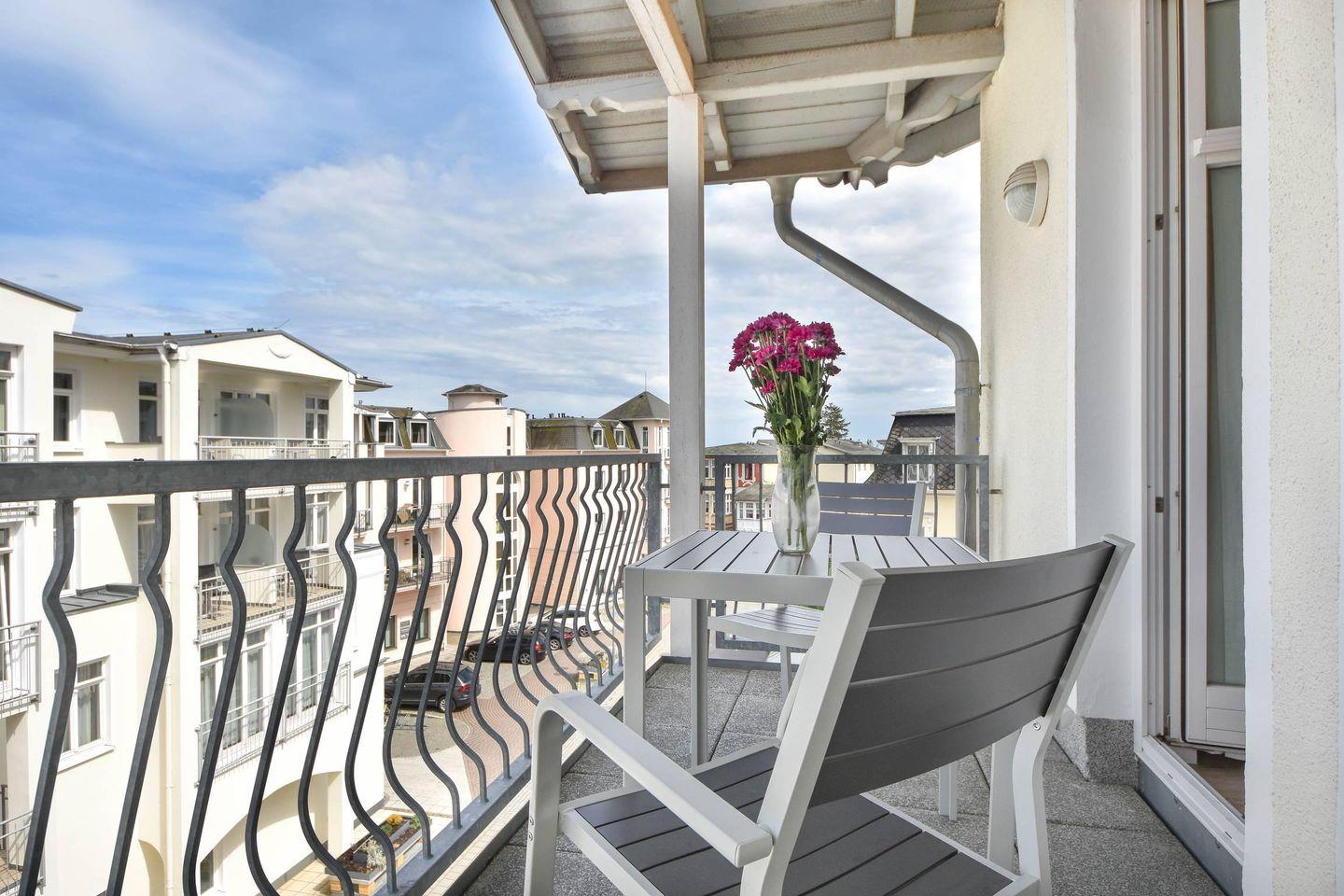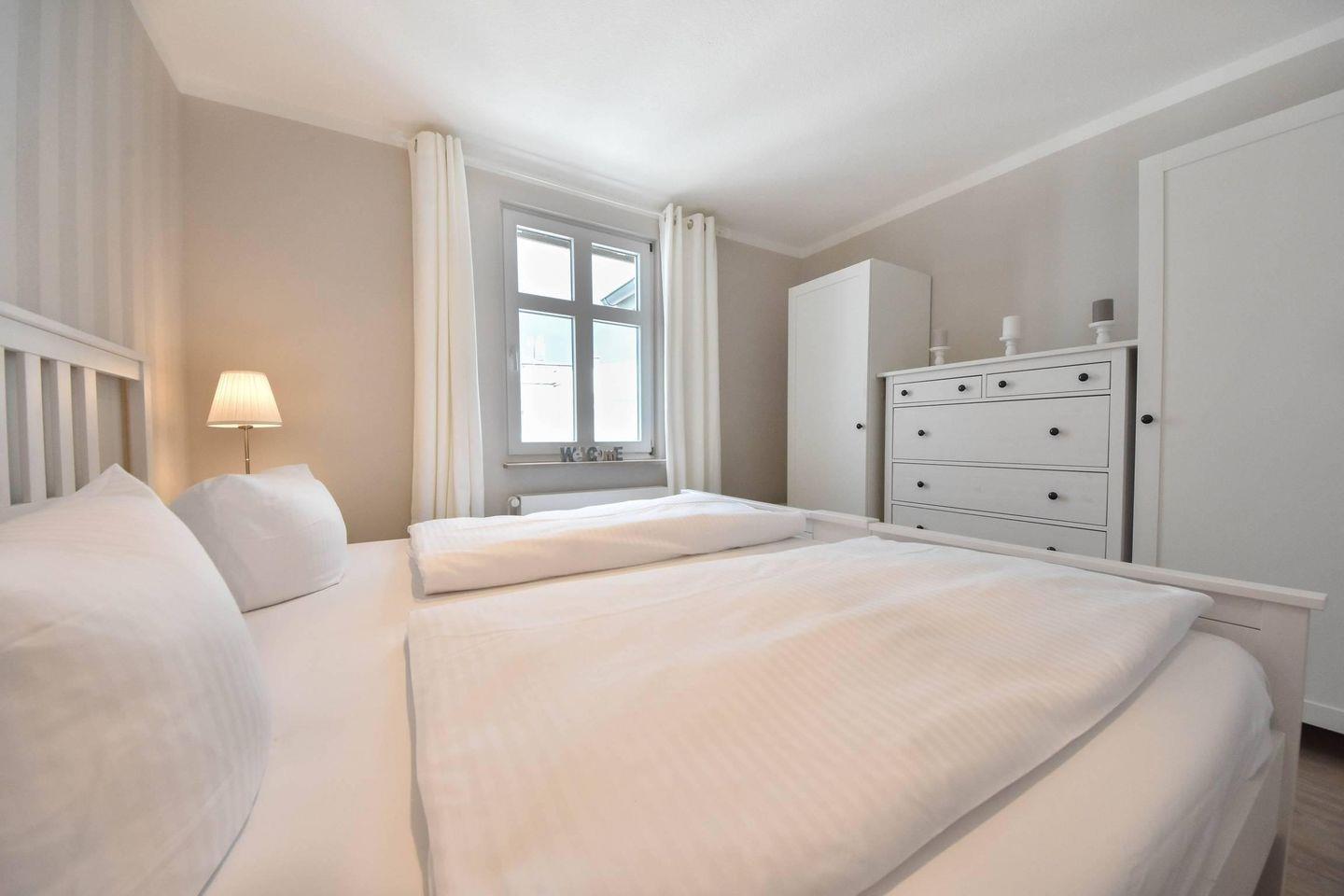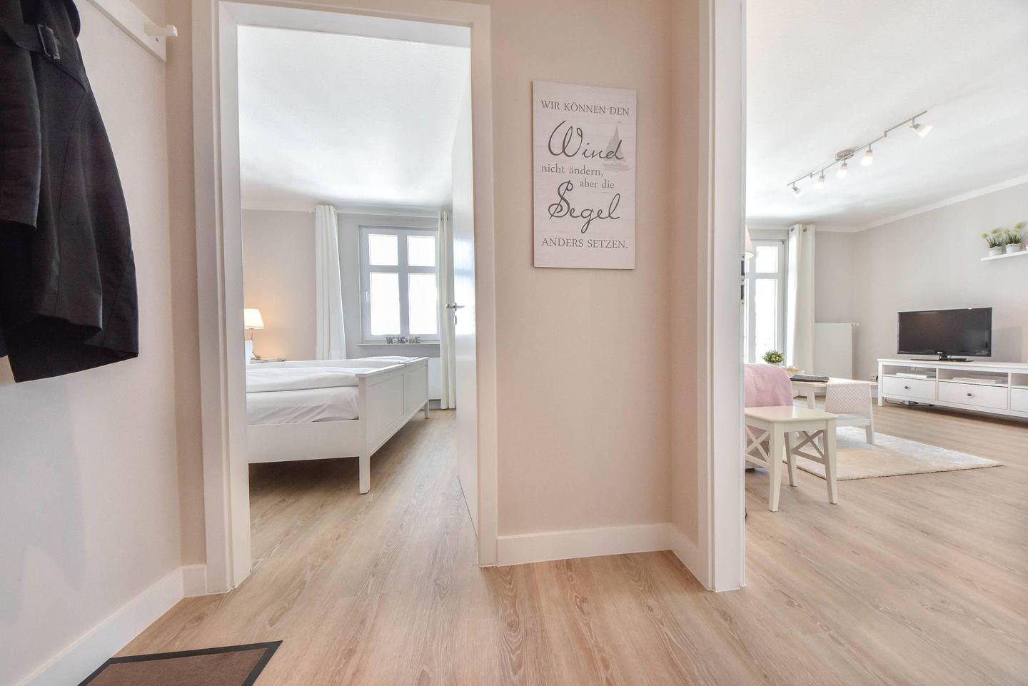Ein Highlight der Wohnung ist der möblierte Balkon, auf dem Sie die frische Ostseeluft genießen können. Das Schlafzimmer bietet mit einem Doppelbett (200 cm x 180 cm) und einem verstellbaren Lattenrost höchsten Komfort. Ein Kleiderschrank und eine Kommode bieten ausreichend Stauraum, auch für längere Aufenthalte.