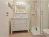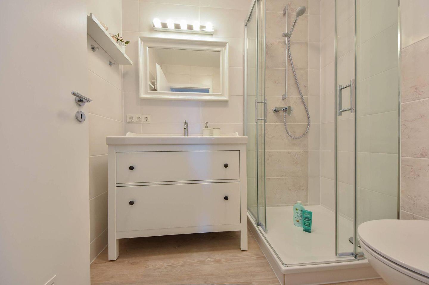 Das Badezimmer ist mit einer fast bodengleichen Dusche, einem Waschbecken und einem WC ausgestattet, sodass Sie nach einem Tag am Strand komfortabel entspannen können.