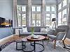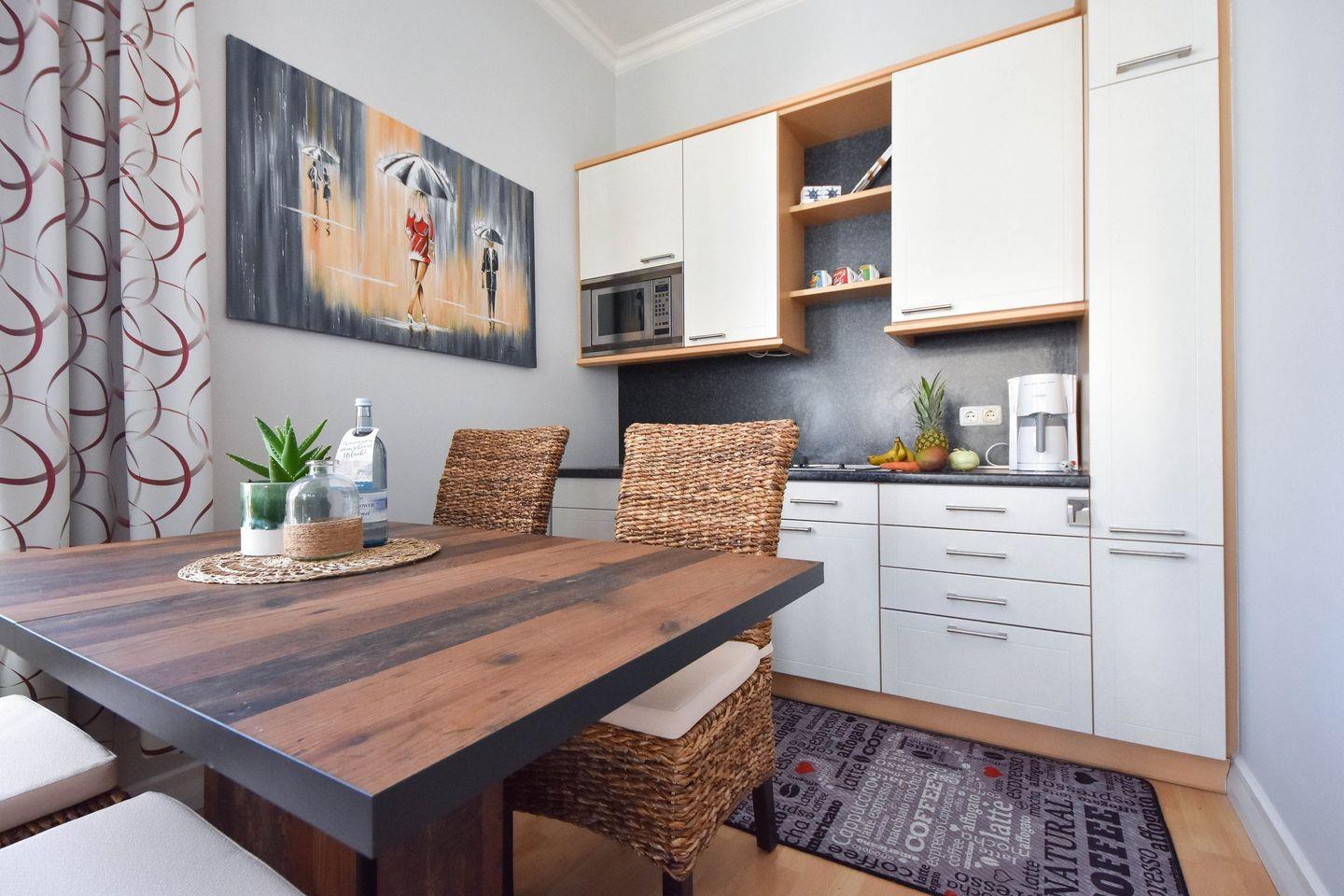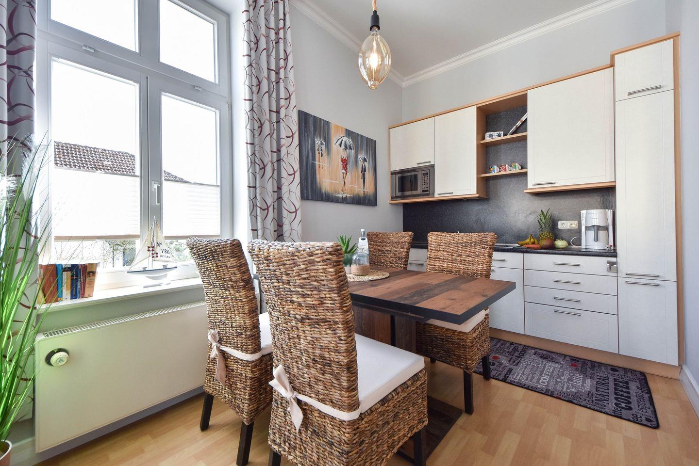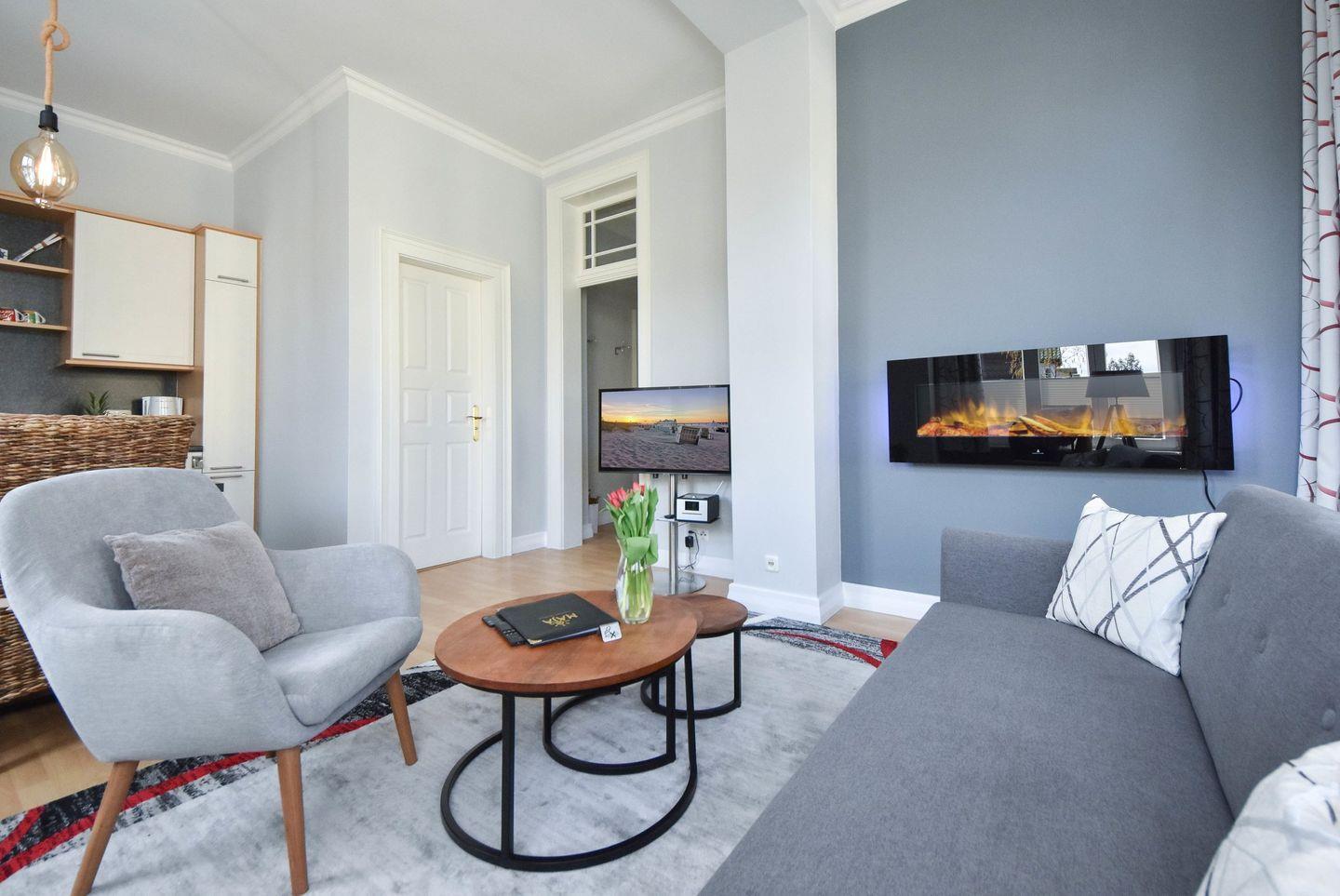 Dieses gemütliche, 40 Quadratmeter große 2-Zimmer Appartement ist geschmackvoll eingerichtet und liegt im Hochparterre der Villa. Es wurde umfänglich und mit viel Liebe zum Detail und im Jahre 2022 renoviert, sodass Sie nun erholsame und stressfreie Urlaubstage in diesem Domizil verbringen können. Die Wohnung verfügt über eine offene, helle Loggia mit Blick auf die Goethestraße ist mit einer gemütlichen Sitzecke mit Flat-TV und Radio eingerichtet. Ebenfalls im Wohnraum integriert sind die offene Küche mit Cerankochfeld, Mikrowelle, und Kühlschrank sowie ein großer Esstisch. Der Elektro-Kamin sorgt für angenehme Atmosphäre und kann auch an Sommerabenden eingeschaltet werden - dann genießen Sie die verschiedenen Beleuchtungseinstellungen und das entsprechende Ambiente. Im Schlafzimmer stehen ein Boxspring-Doppelbett mit getrennten Matratzen und ein Kleiderschrank zur Verfügung. Das Bad ist mit Dusche und Waschbecken sowie WC ausgestattet.