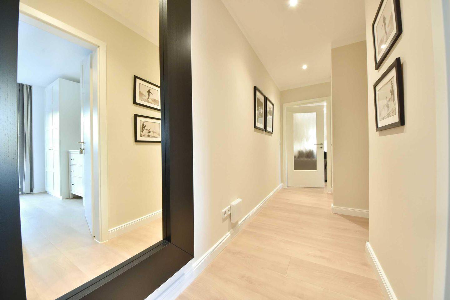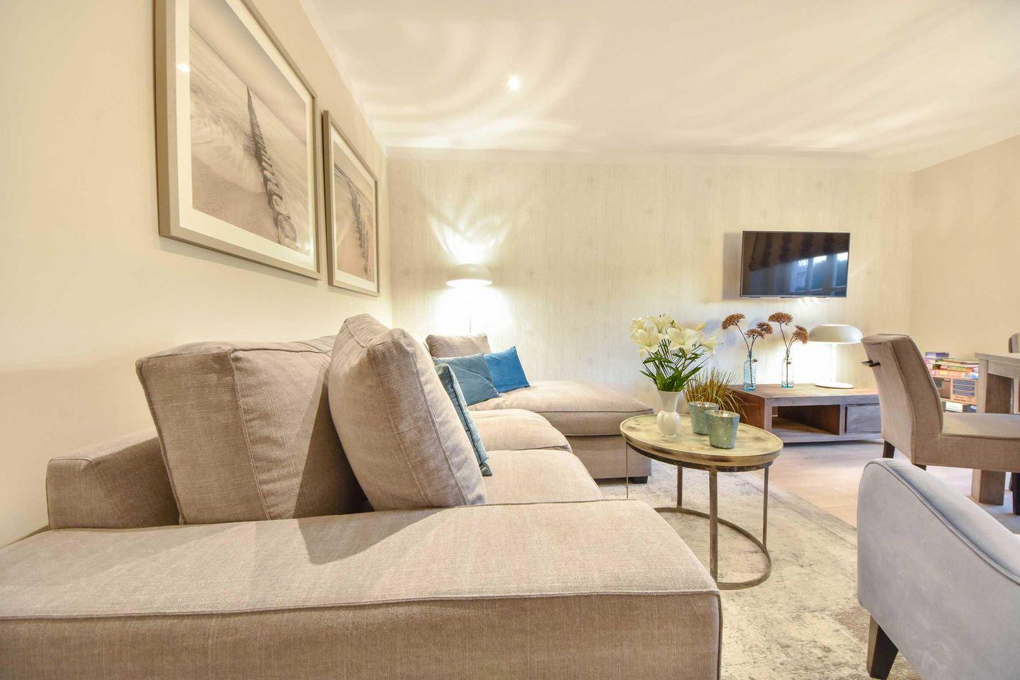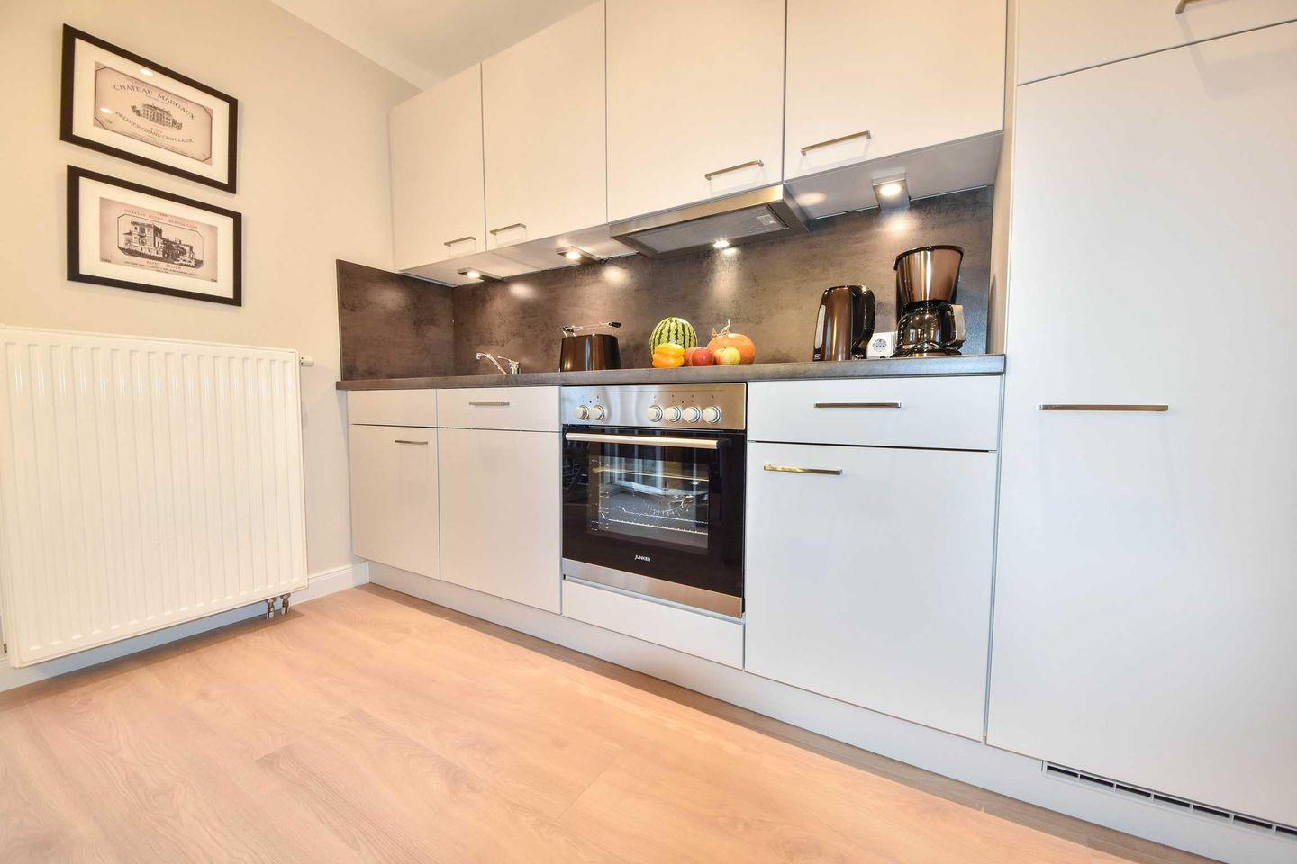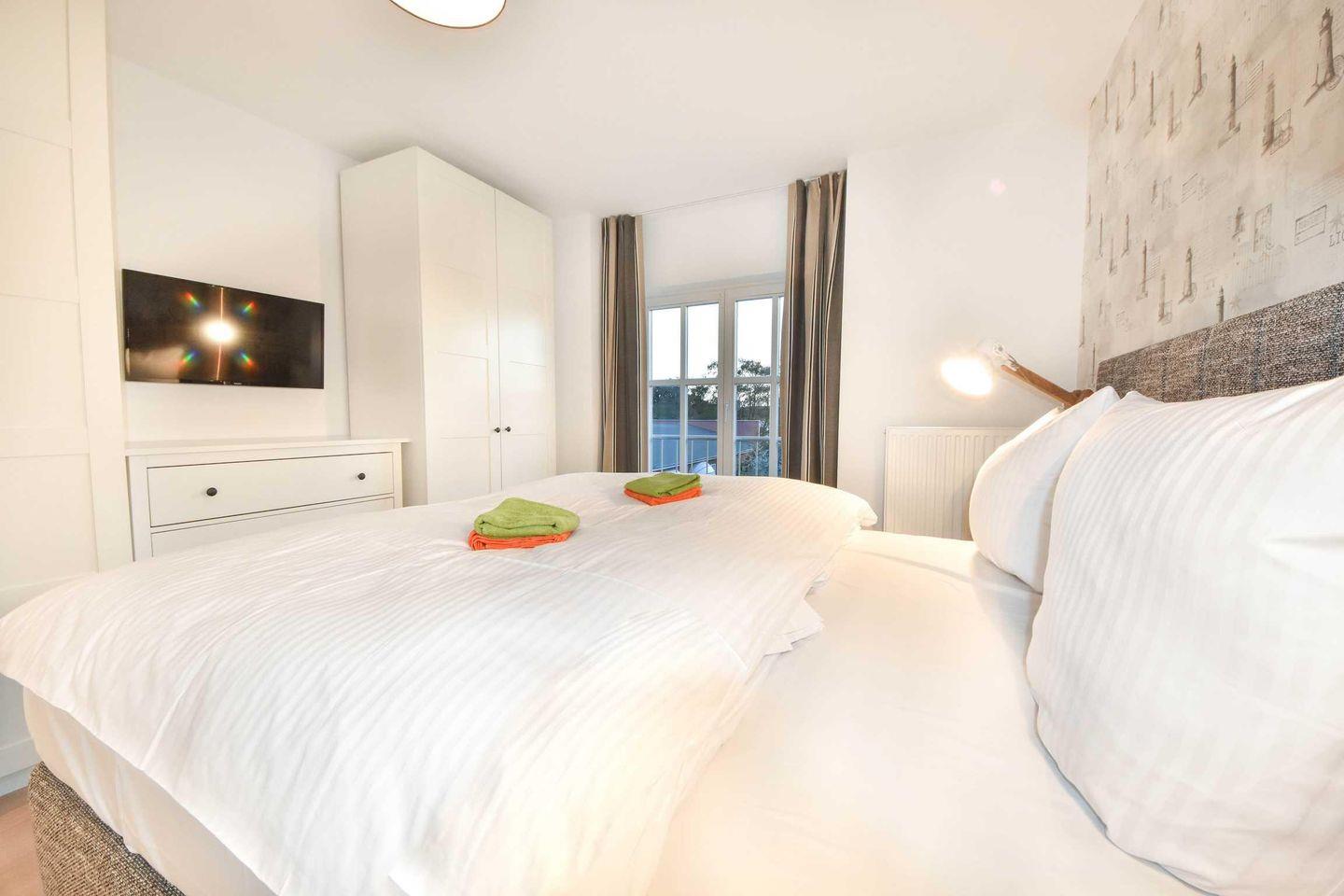 Im zweiten Stock des Hauses erwartet Sie eine komplett moderne Ferienwohnung. Im Jahr 2018 neu eingerichtet und mit Liebe ins Detail dekoriert können Sie hier entspannen und den Alltag hinter sich lassen. Die geschmackvoll eingerichteten 46m² verteilen sich auf einen offenen Wohnraum mit integrierter und vollausgestatteter Küchenzeile sowie Balkon, das Tageslichtbad mit Dusche und ein Schlafzimmer mit Boxspringbett und zweiten TV. Ideal für zwei Personen bleiben hier keine Wünsche offen. Eine dritte Person kann auf der Schlafcouch im Wohnzimmer übernachten. Besonders familienfreundlich sind der bereits in der Wohnung vorhandene Hochstuhl, sowie das Baby-Reisebett inklusive Matratze aber ohne Wäsche.