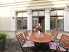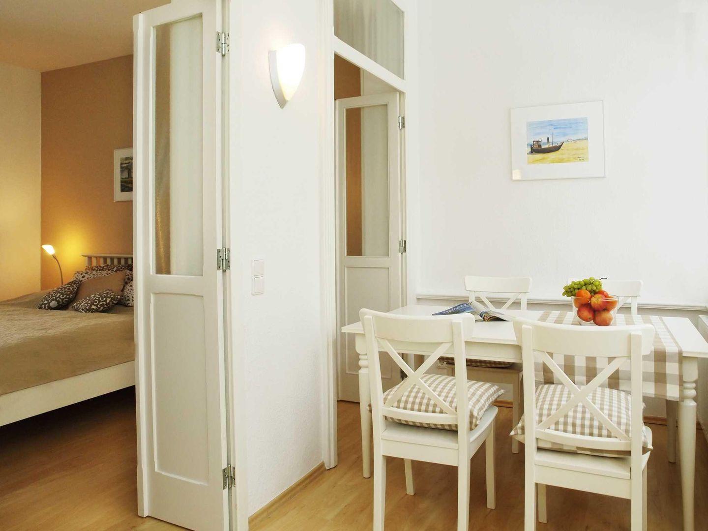 Ein besonderes Highlight ist die möblierte Terrasse mit seitlichem Blick in Richtung Strandpromenade. Hier genießen Sie frische Ostseeluft und entspannte Stunden im Freien. Die geschlossene, voll ausgestattete Wohnküche bietet einen separaten Esstisch sowie Cerankochfeld, Backofen, Spülmaschine und Kühlschrank mit Gefrierfach und ermöglicht eine komfortable Selbstversorgung.