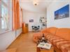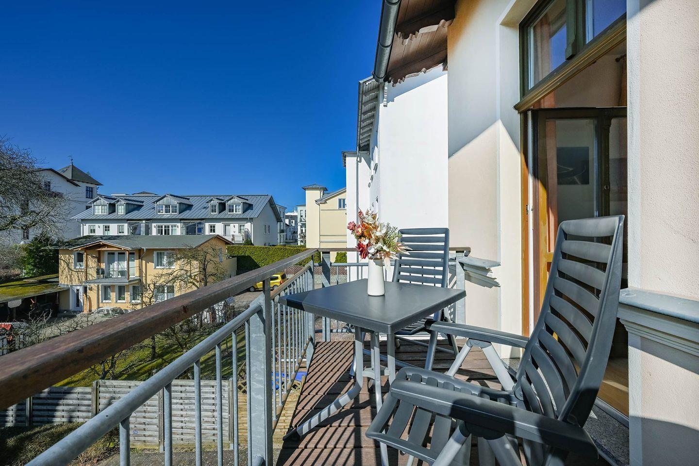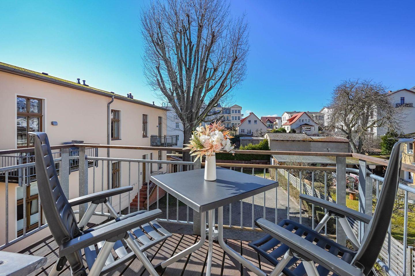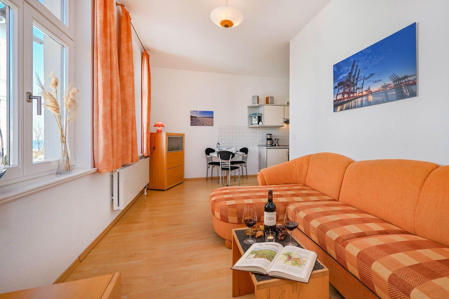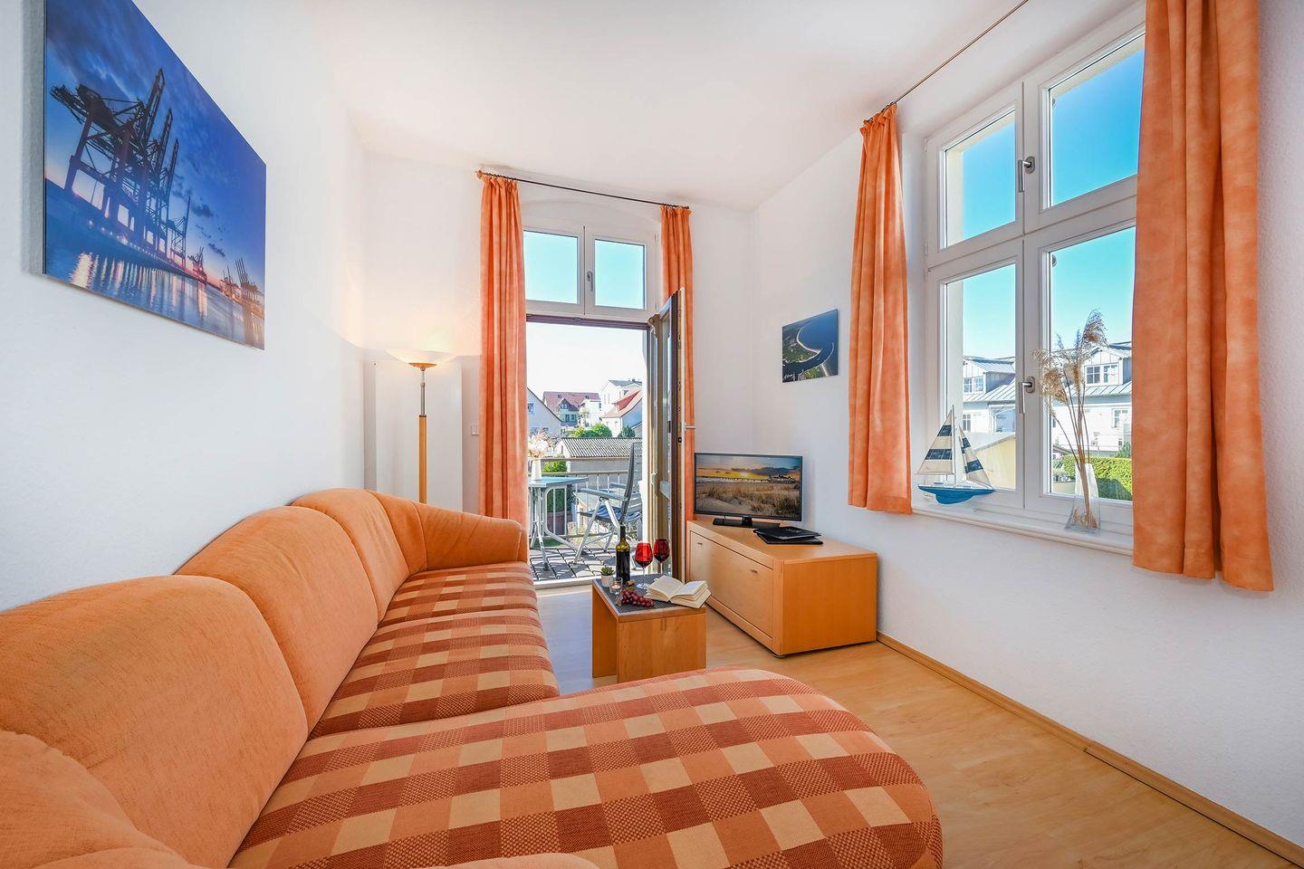 Die rund 44 Quadratmeter große Ferienwohnung befindet sich im ersten Obergeschoss und überzeugt durch einen offenen, gut durchdachten Grundriss. Der Wohnbereich ist hell und freundlich gestaltet und bietet eine gemütliche Eckcouch, ein TV-Gerät sowie direkten Zugang zum sonnigen Balkon. Vom Wohnzimmerfenster aus genießen Sie sogar einen seitlichen Blick auf die Ostsee, der maritimes Flair in die Wohnung bringt.