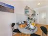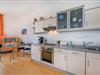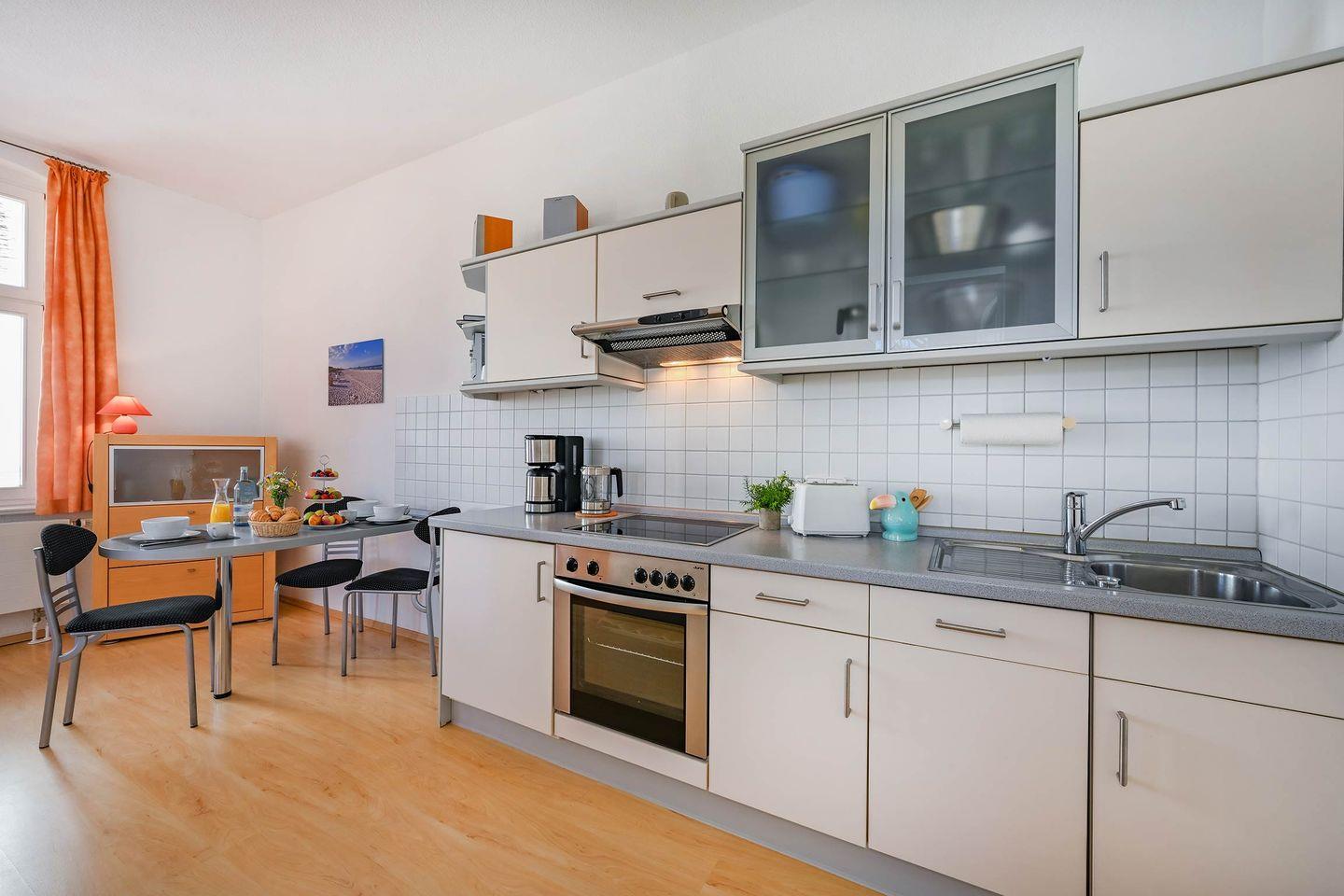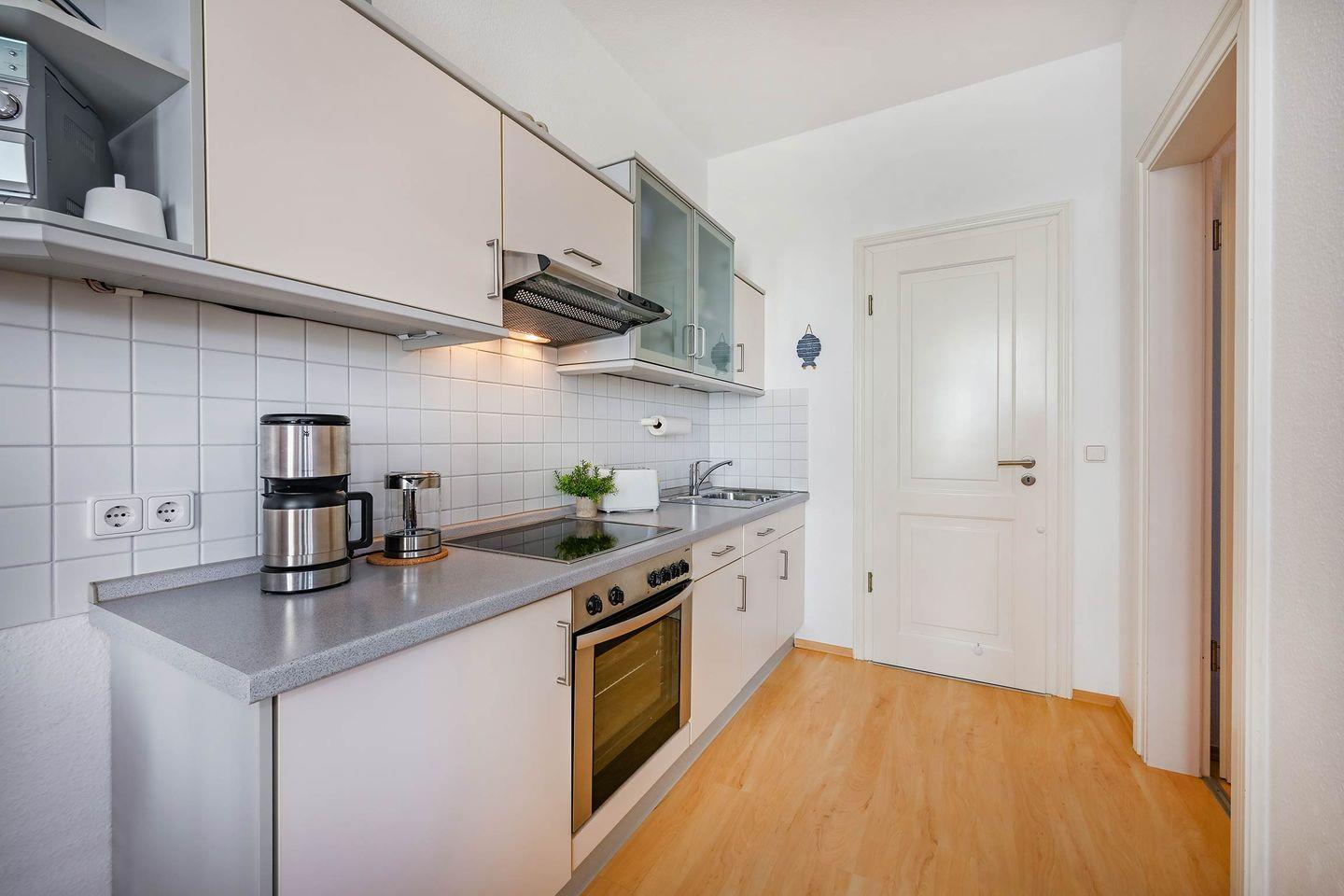 Die voll ausgestattete Küchenzeile ist offen in den Wohnraum integriert und verfügt über Cerankochfeld, Backofen, Spülmaschine sowie Kühlschrank mit Gefrierfach. Hier lassen sich kleine Mahlzeiten ebenso komfortabel zubereiten wie ein ausgedehntes Frühstück vor einem Strandtag.