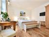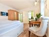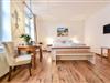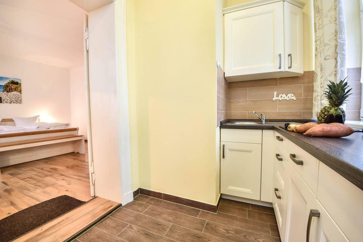 Die Wohnung befindet sich im Tiefparterre einer gepflegten Villa und besticht durch ihre durchdachte Raumaufteilung und ihren wohnlichen Charakter. Der kombinierte Wohn- und Schlafbereich bietet ein komfortables Doppelbett (200?cm x 180?cm), einen Esstisch mit zwei Stühlen sowie ein TV-Gerät für entspannte Abende. Ein geräumiger Kleiderschrank sorgt dafür, dass auch längere Aufenthalte bequem und ordentlich gestaltet werden können. Die abgetrennte Küchenzeile ist funktional ausgestattet mit einem 2-Platten-Ceran-Kochfeld, einem Kühlschrank und einem Geschirrspüler, sodass Sie auch im Urlaub auf kulinarische Selbstversorgung nicht verzichten müssen.