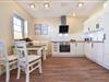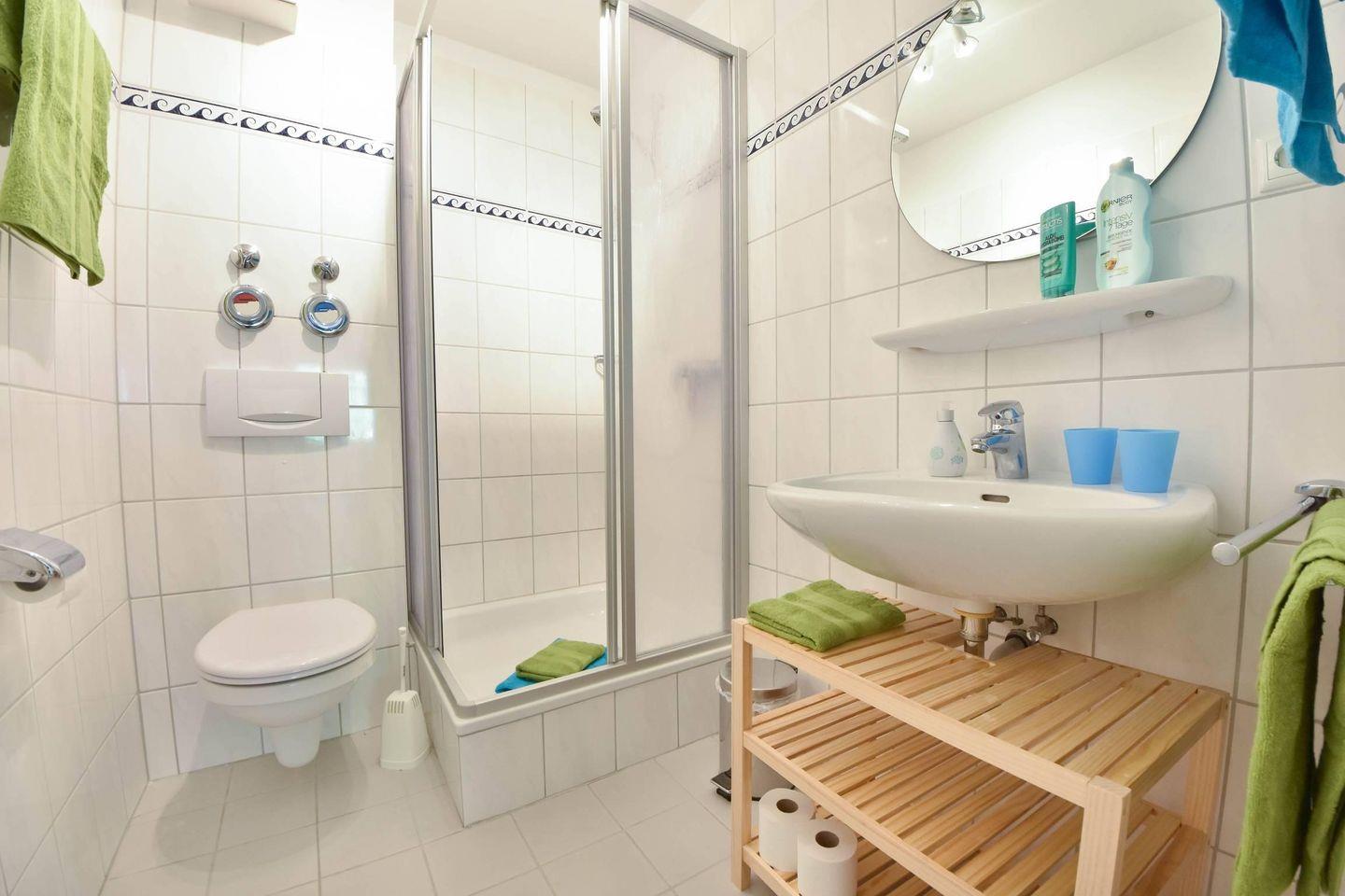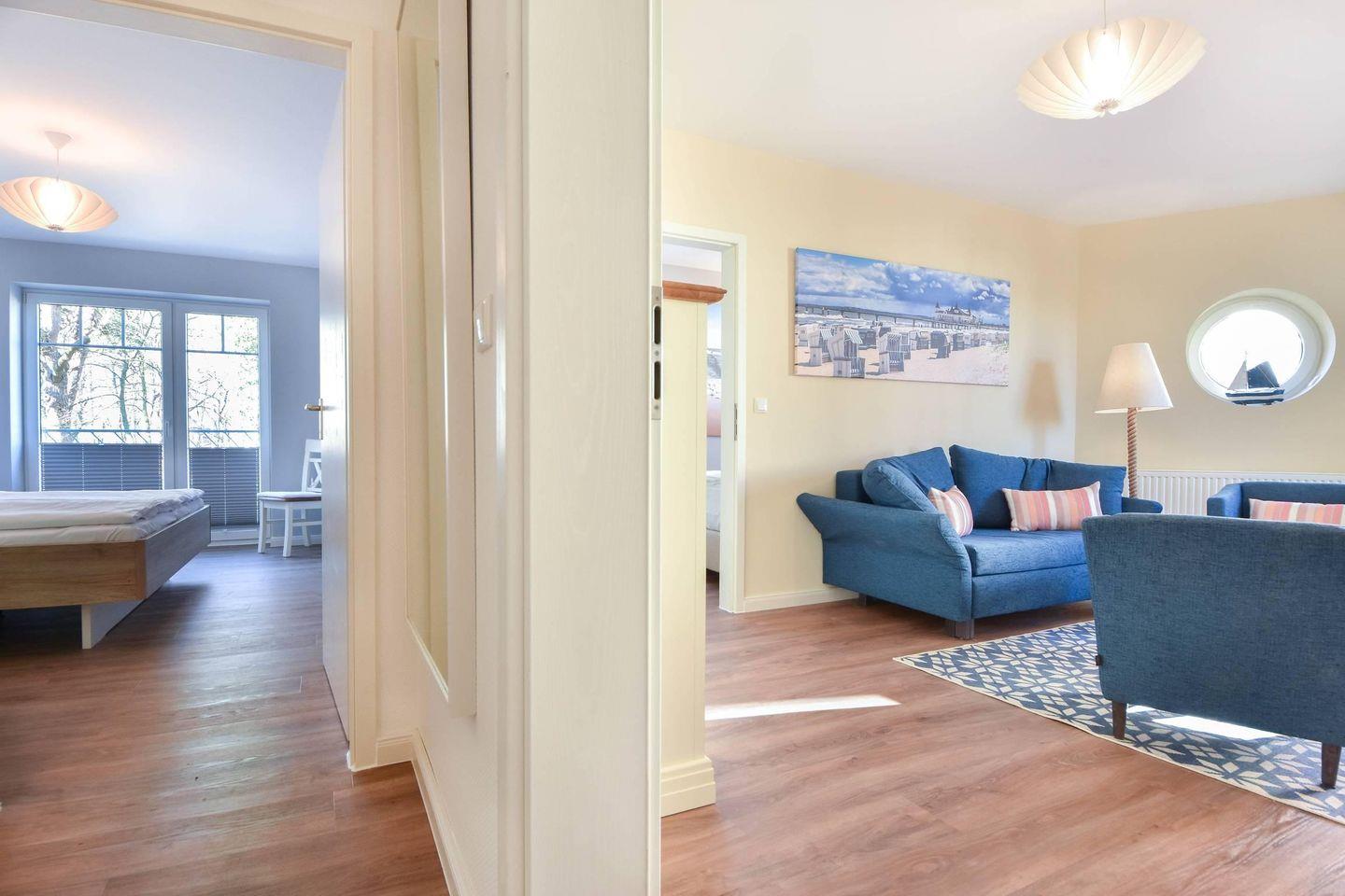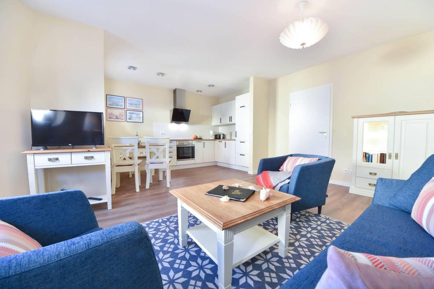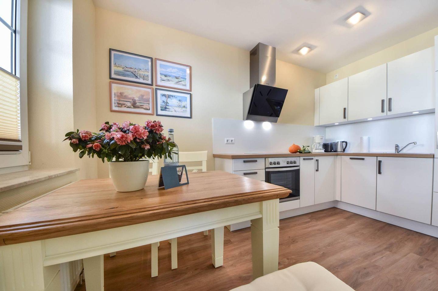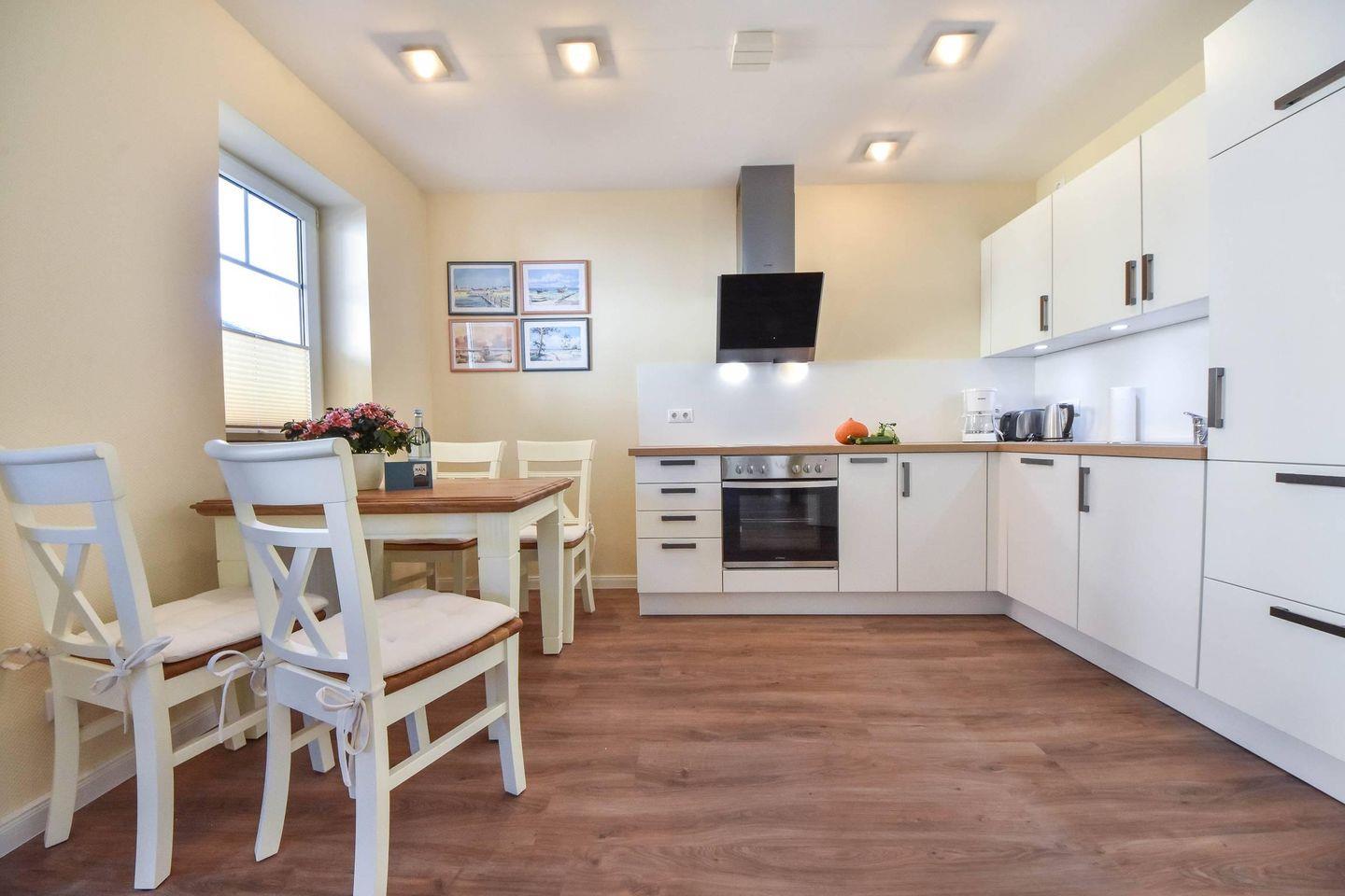 Ihre Ferienwohnung 20 am Wilhelmsberg befindet sich im ersten Obergeschoss und bietet auf 60 Quadratmetern Platz für vier Erwachsene und ein Kleinkind (bis drei Jahre). Vom Flur aus erreichen Sie den modernen und maritim gestalteten Wohnbereich mit offener Küche und bequemer Sitzecke. Die großzügig über Eck laufende Einbauküche ist voll ausgestattet mit Cerankochfeld, Backofen, Geschirrspüler, Kaffeemaschine, Toaster, Wasserkocher sowie Kühlschrank mit Gefrierfach. Ein Esstisch mit vier Stühlen rundet den Küchenbereich ab. Vom Wohnraum erreichen Sie den geräumigen Balkon, auf dem Sie zum Frühstück und am Vormittag die Sonne genießen können.