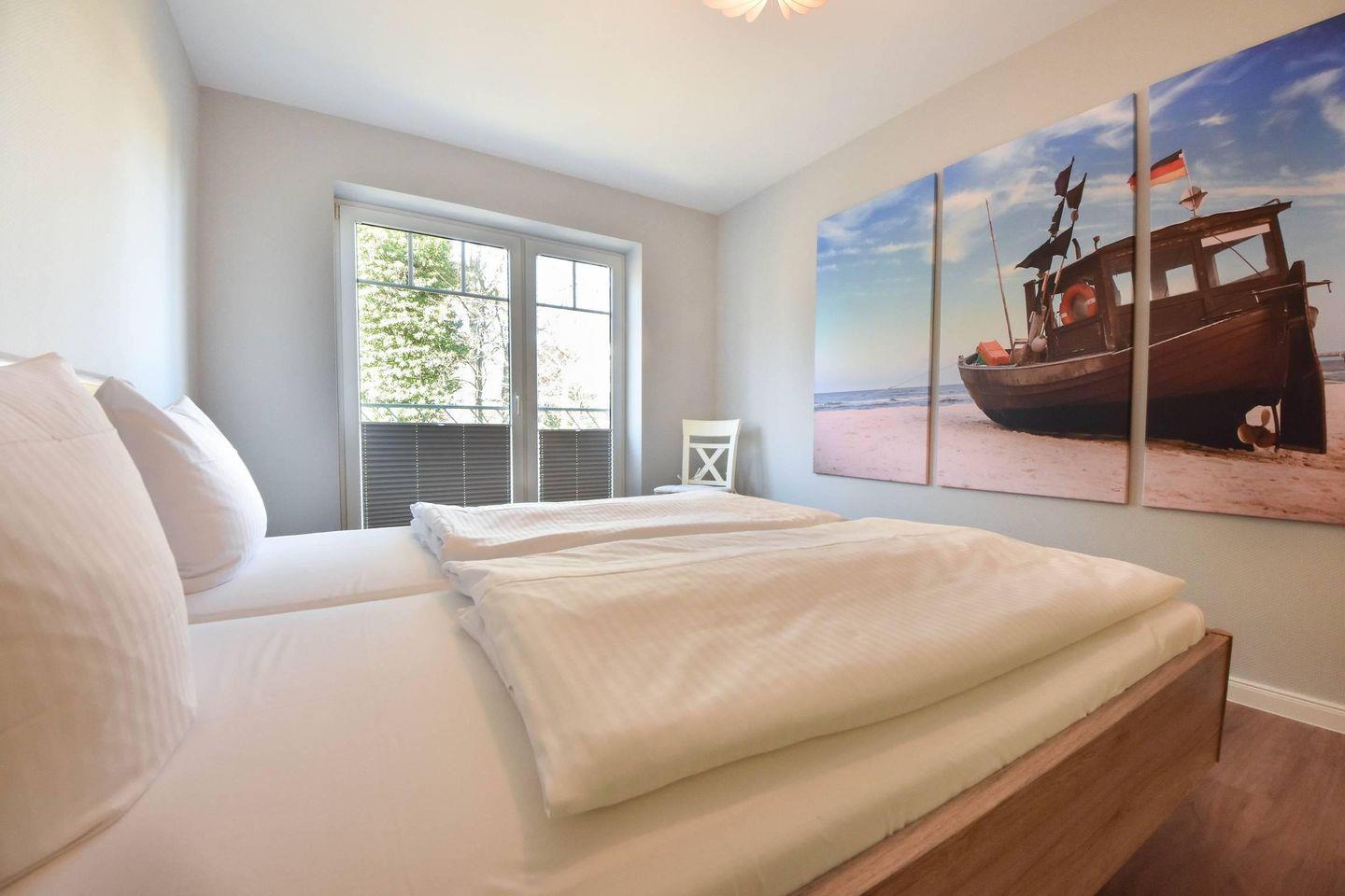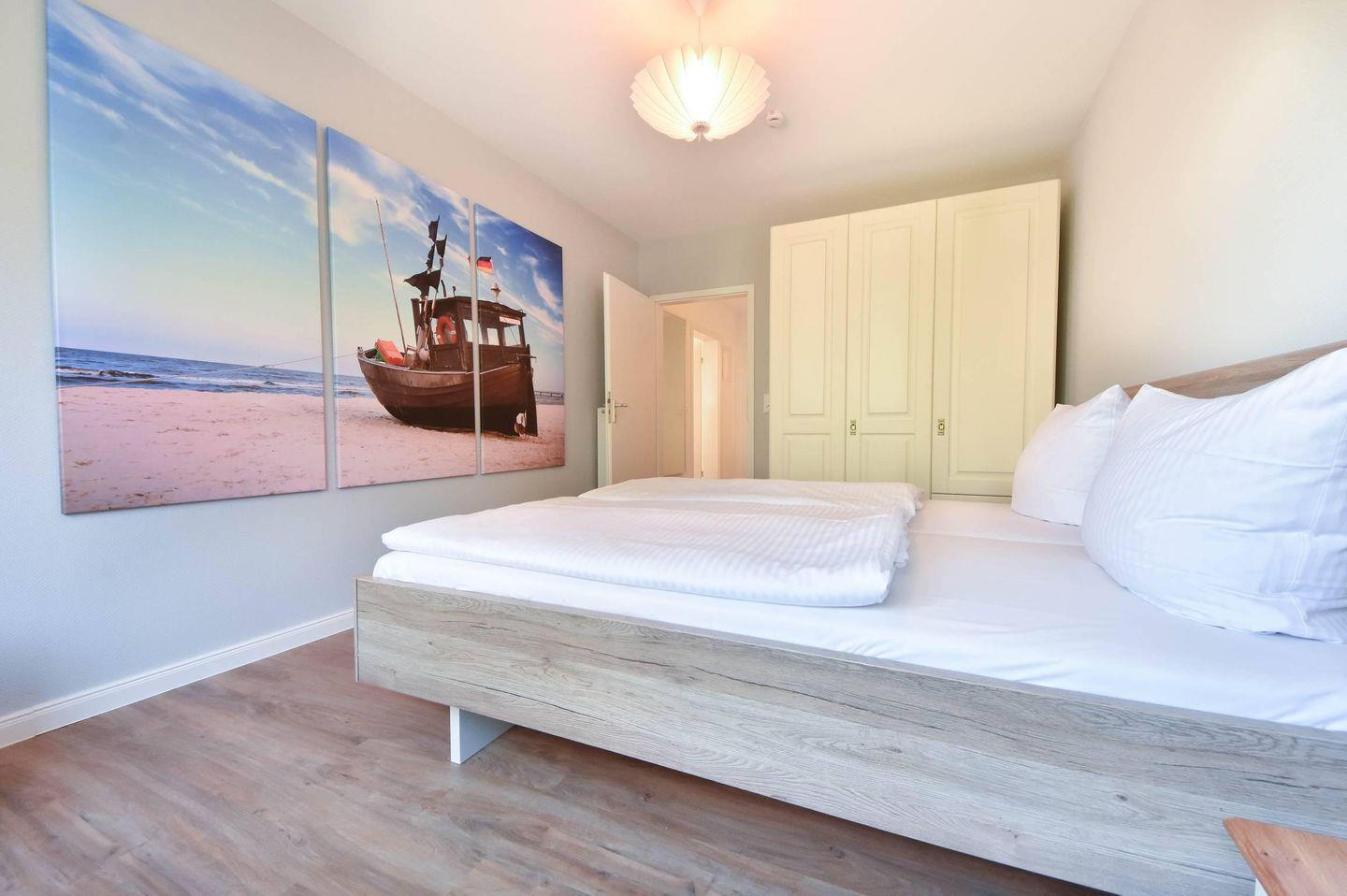 Ebenfalls vom Wohnraum gelangen Sie in das kleinere der beiden zur Verfügung stehenden Schlafzimmer, welches mit einem Doppelbett (1,90m x 1,40m) und großen Kleiderschrank ausgestattet ist. Das Hauptschlafzimmer mit französischem Balkon und Blick in eine schön gestaltete, private Grünanlage verfügt über ein Doppelbett (2,00m x 1,60m) mit zwei Einzelmatratzen sowie einen großen Kleiderschrank.