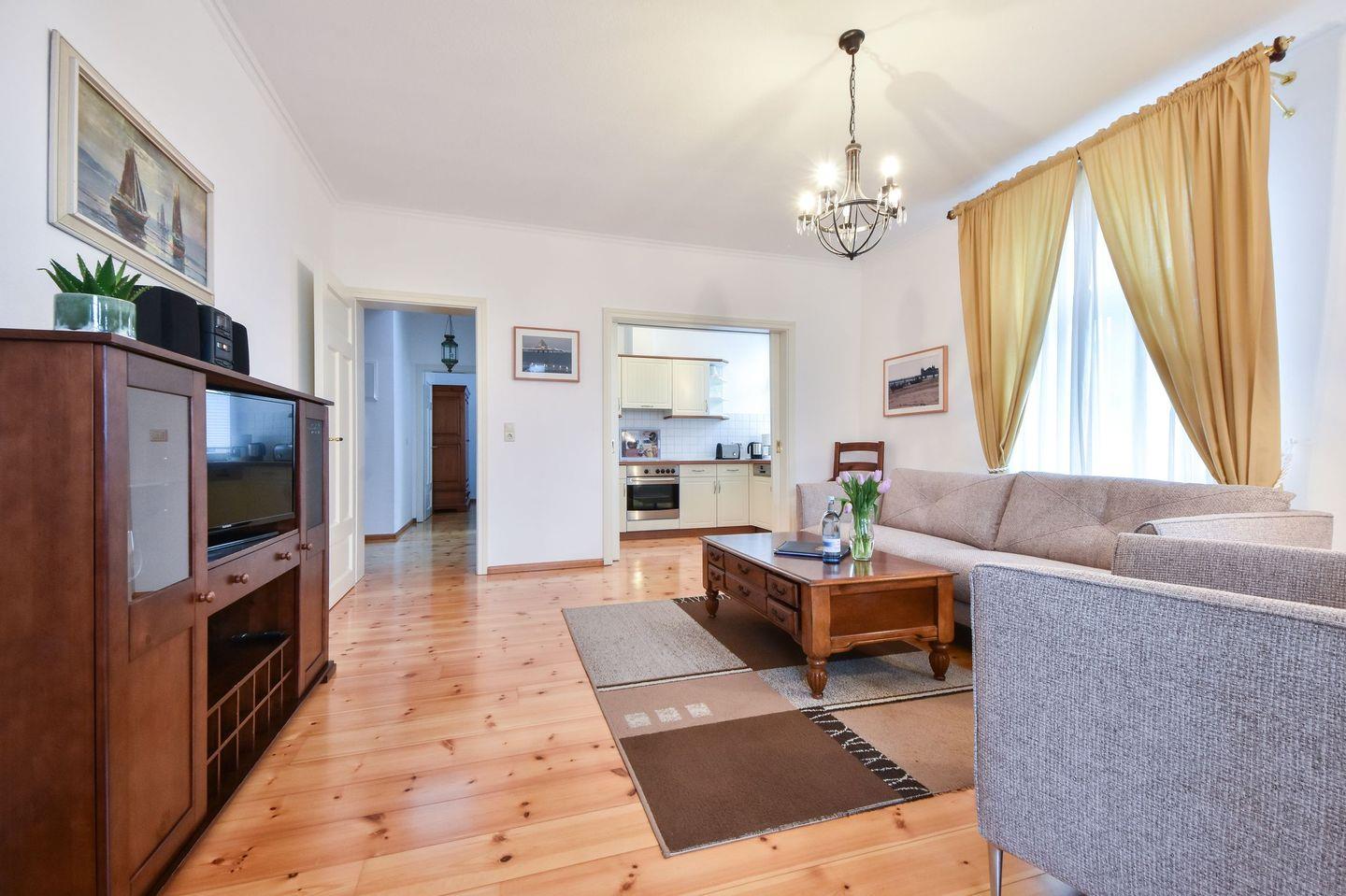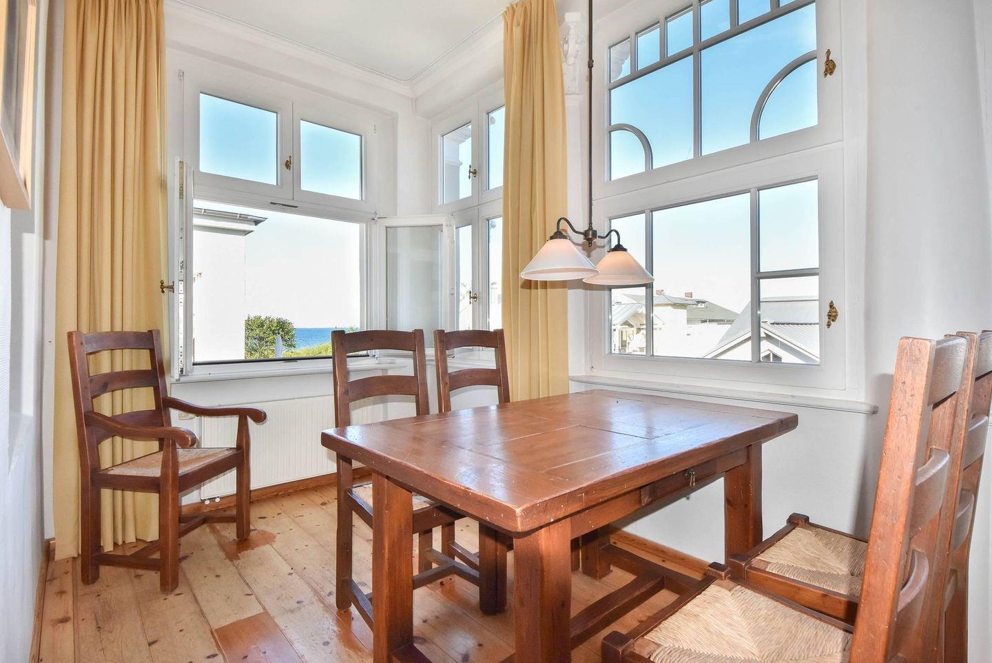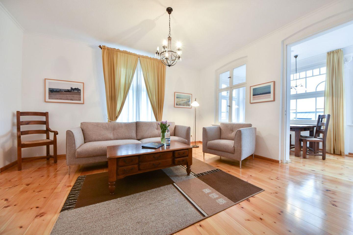 In der zweiten Etage der historischen Villa Ahlbeck erwartet Sie eine klassisch eingerichtete Ferienwohnung, die hohen Ansprüchen genügt. Besonders hervorzuheben ist die zeitlose Einrichtung, die den Charakter des Hauses unterstreicht. Echte Holzdielen, englische Eisenbetten, Echtholz-Möbel und ein schöner, seitlicher Meerblick sind die besonderen Attribute der Wohnung, die sie zu einem einzigartigen Urlaubsdomizil machen.