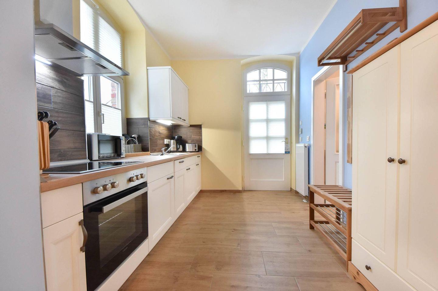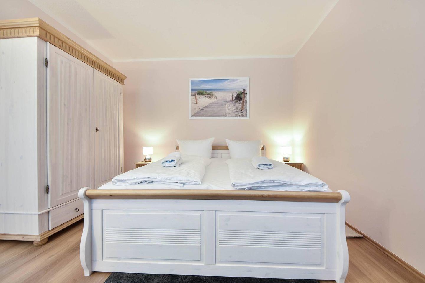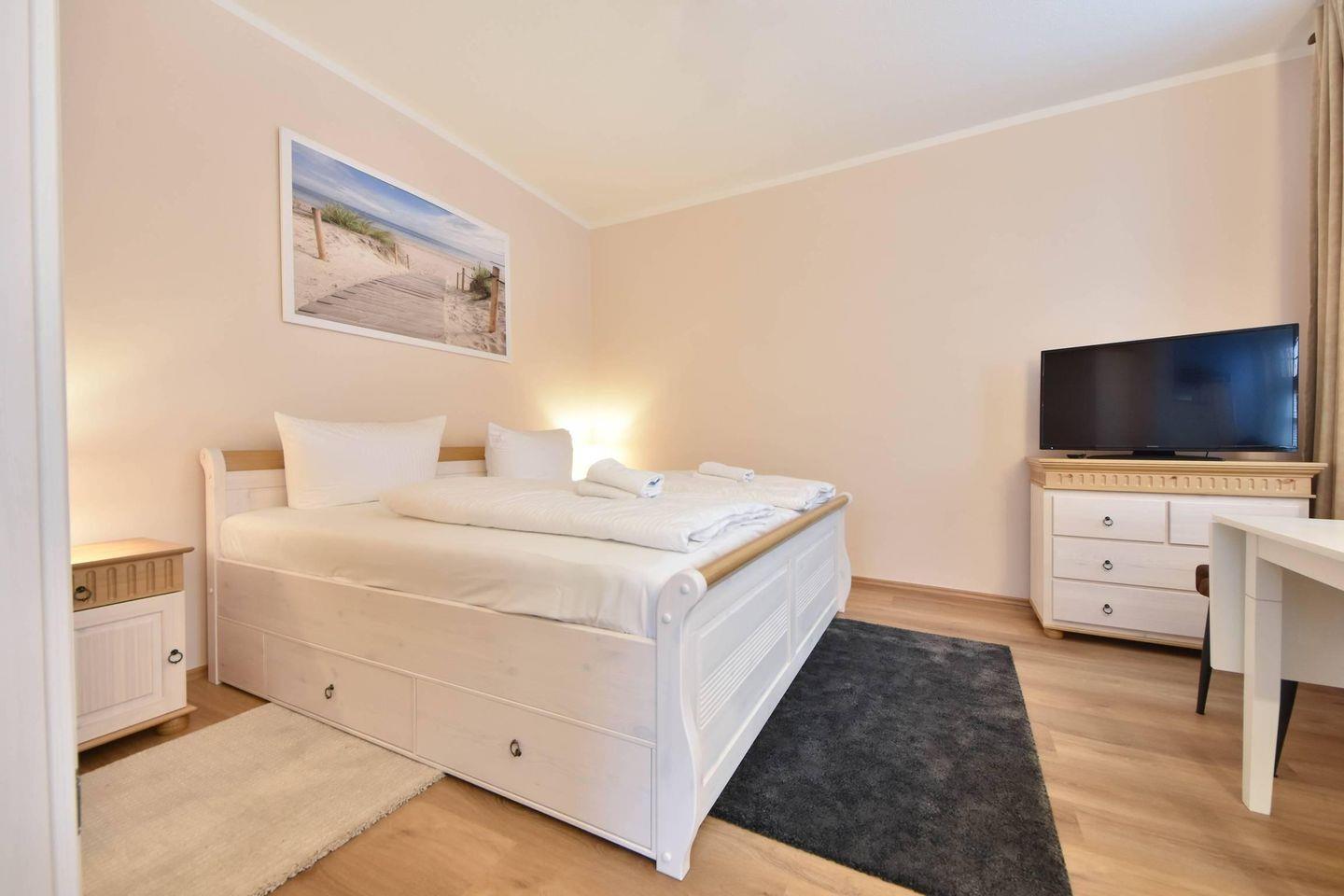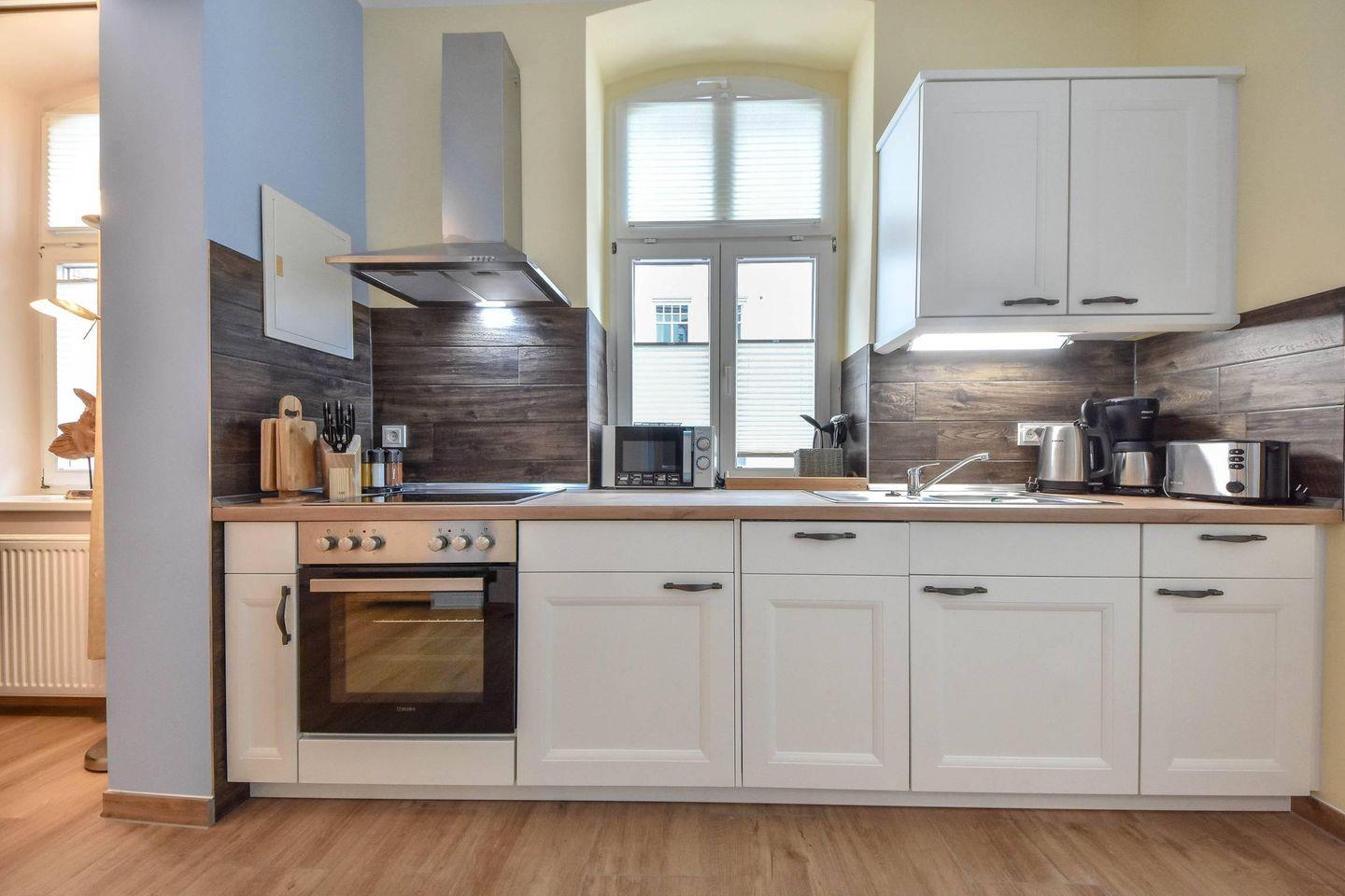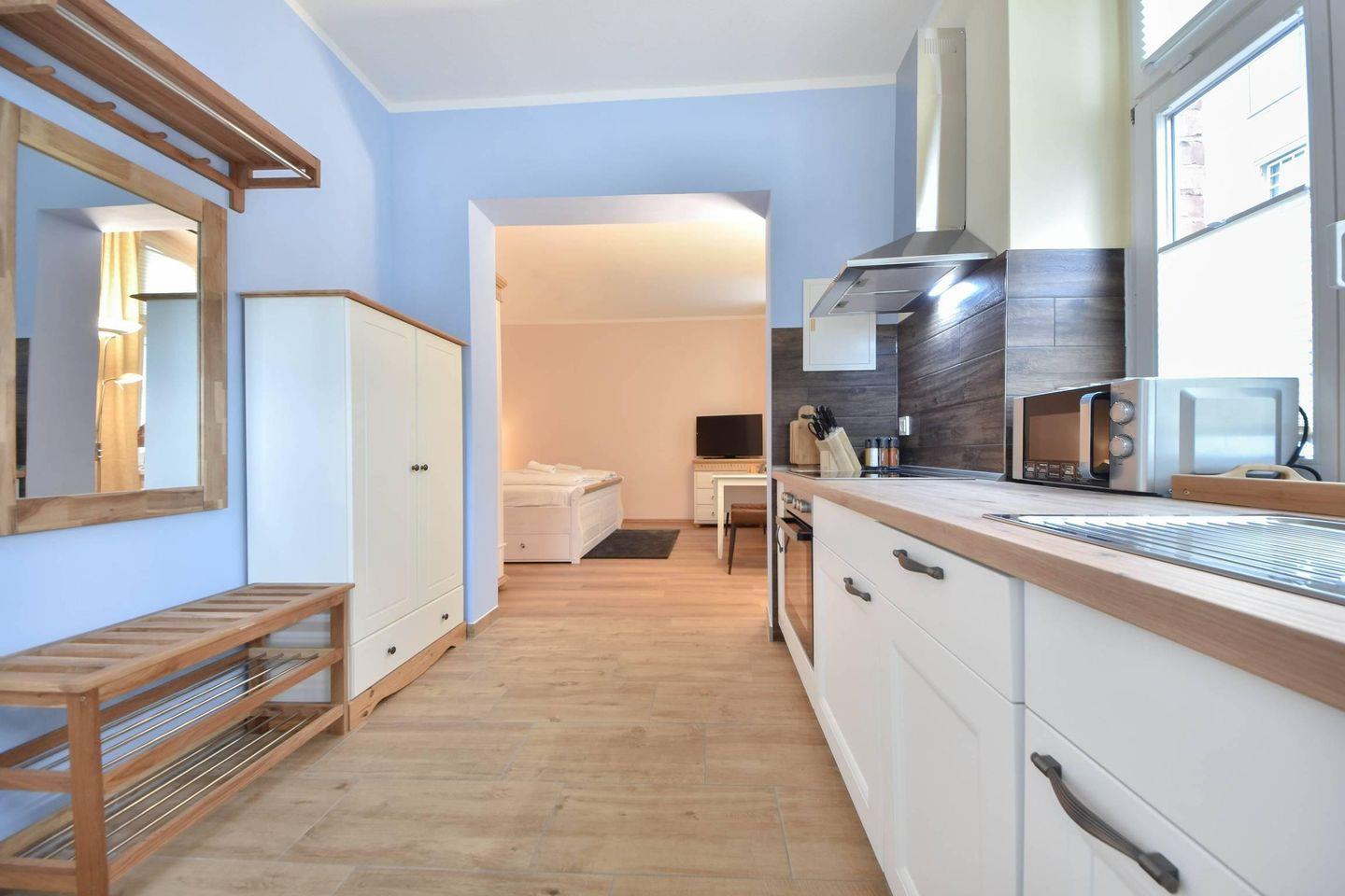 Die Ferienwohnung empfängt ihre Gäste mit einem charmanten Wohn- und Schlafbereich, der durchdacht gestaltet wurde. Ein komfortables Doppelbett (200?cm x 180?cm), ein separater Esstisch sowie ein Kleiderschrank sorgen für eine behagliche Atmosphäre, die zum Verweilen und Ausruhen einlädt. Für Unterhaltung ist mit einem Flachbild-TV ebenfalls gesorgt. Die offen integrierte Küchenzeile ist komplett ausgestattet mit Ceran-Kochfeld, Backofen, Mikrowelle, Geschirrspüler sowie einem Kühlschrank mit Gefrierfach – perfekt für die Selbstverpflegung im Urlaub.