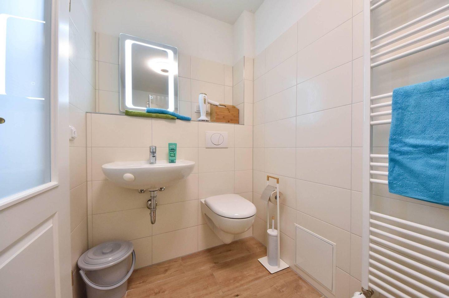 Das moderne Badezimmer ist mit Dusche, Waschbecken und WC funktional eingerichtet und bietet alles, was Sie für den täglichen Komfort benötigen. Bei Ankunft ist bereits alles vorbereitet: Die Betten sind frisch bezogen, Handtücher liegen bereit und eine hilfreiche Grundausstattung mit den wichtigsten Dingen für den Start in den Urlaub ist vorhanden. So beginnt die Erholung bereits mit dem ersten Schritt in die Ferienwohnung.