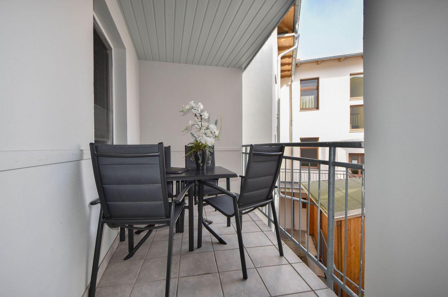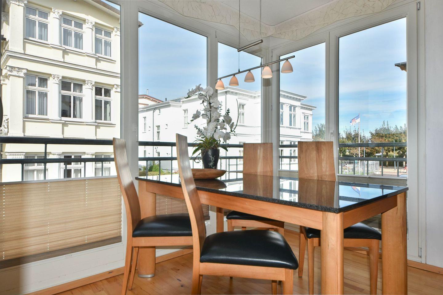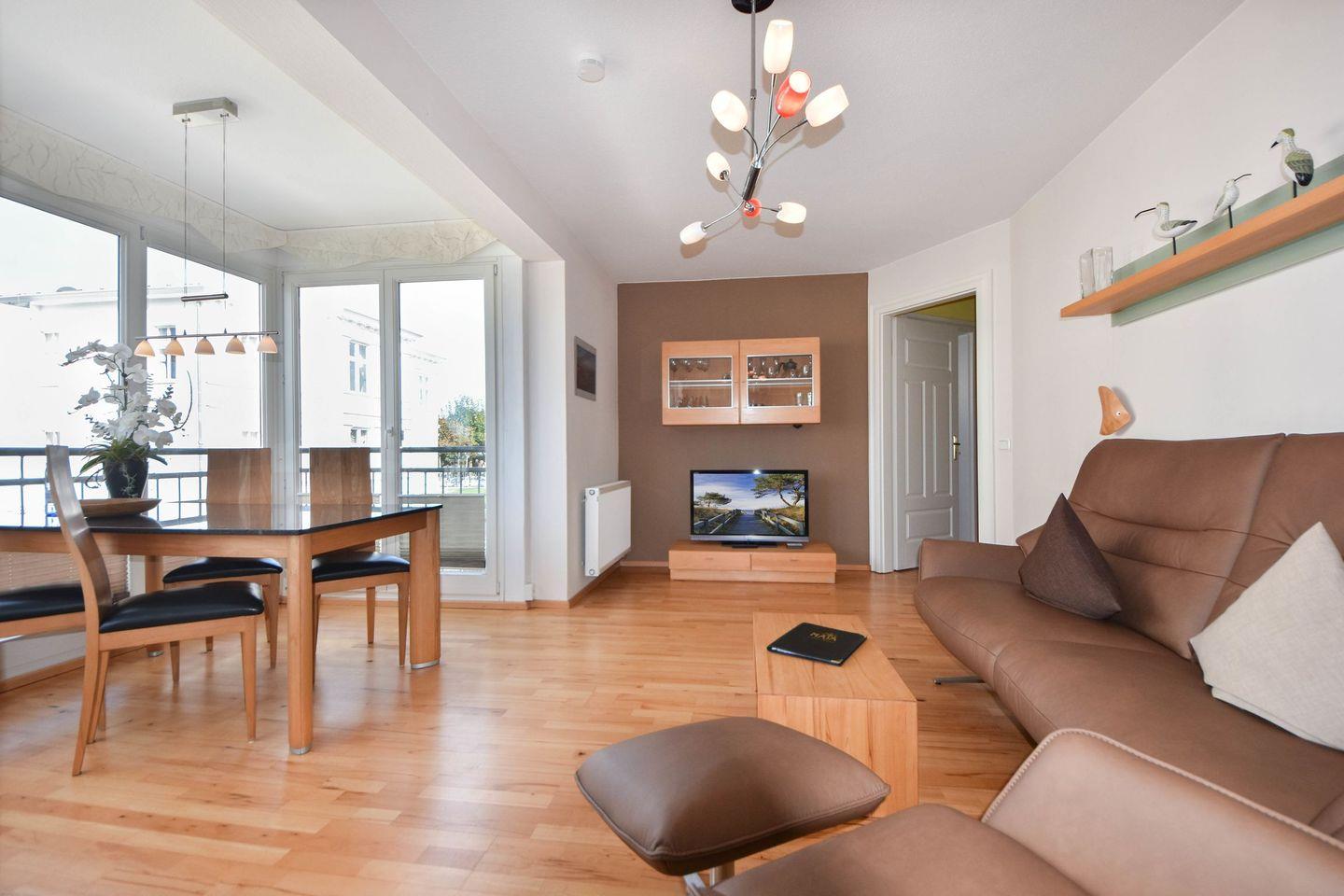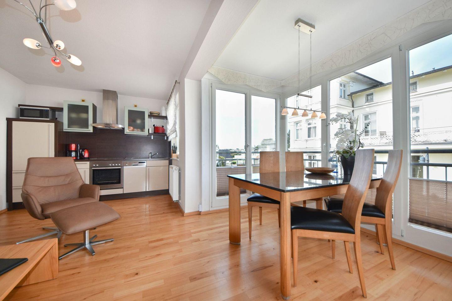 Der kombinierte Wohn- Essbereich ist mit einer kompletten Küchenzeile und einem Esstisch ausgestattet. Mikrowelle, Backofen, Herd sowie Geschirrspüler sind vorhanden. Vom Esstisch genießen Sie einen hervorragenden Blick auf die Promenade und können teilweise sogar bis auf die Ostsee blicken. Das Badezimmer verfügt über eine Dusche mit flachem Einstieg und ein WC. Ein überdachter und möblierter Balkon lädt zum Verweilen ein. Hier können Sie den Tag ausklingen lassen.