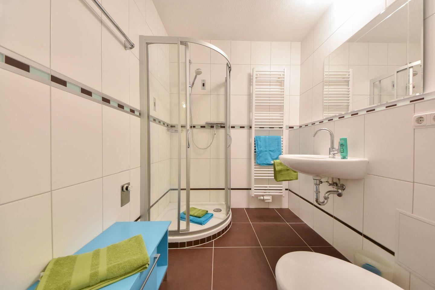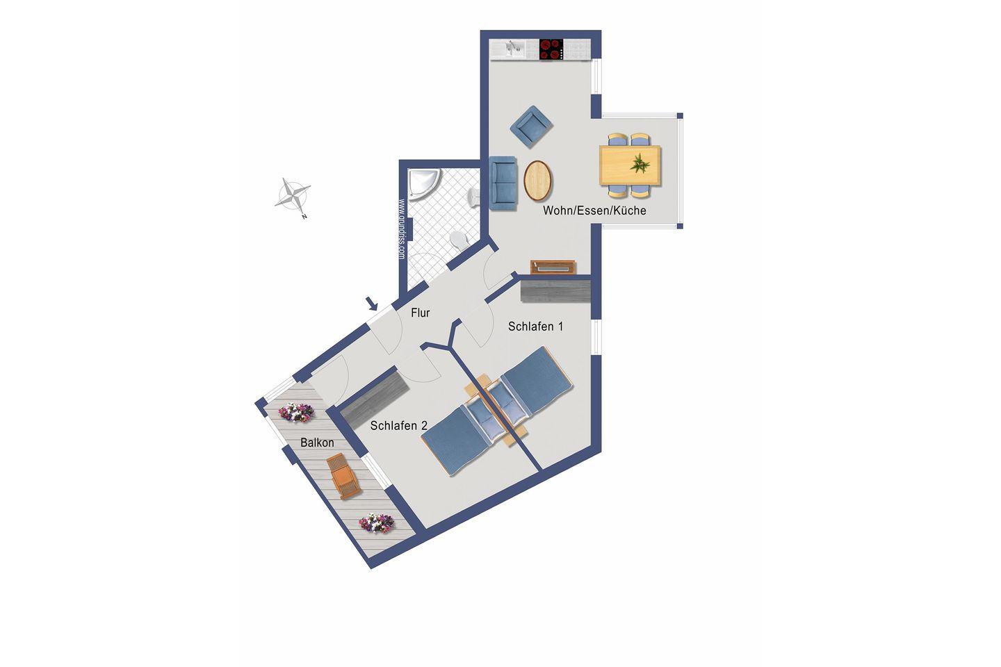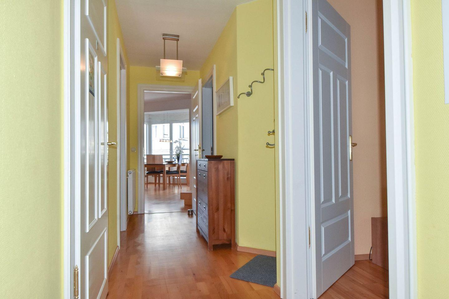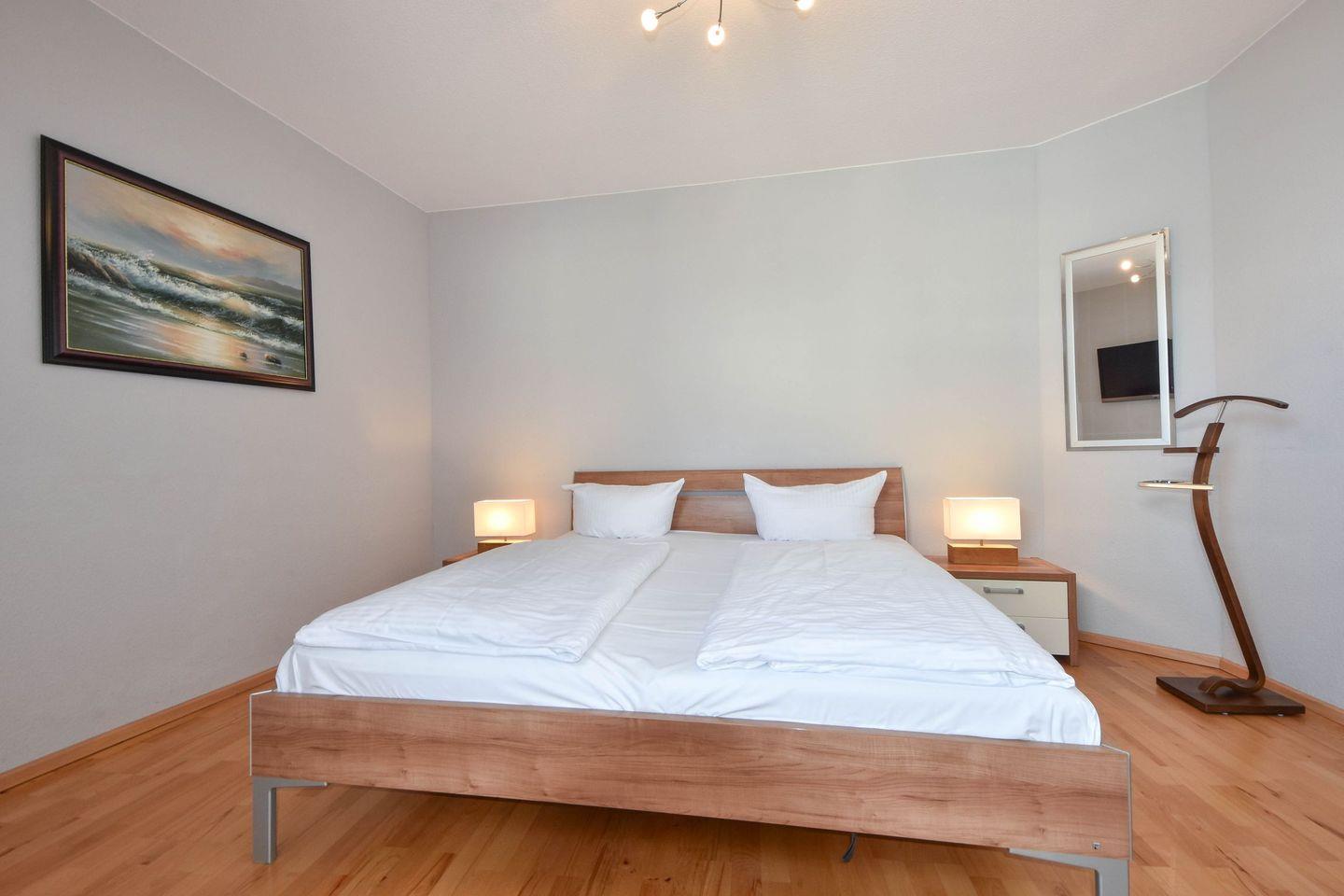 Die Ferienwohnung 16 im Haus Meerblick befindet sich im 1. Obergeschoss des Hauses und verfügt über zwei separate Schlafzimmer mit Doppelbetten und ausreichend Stauraum. Ein Schlafzimmer verfügt über einen weiteren Fernseher. Auf 67 Quadratmetern finden so vier Personen ihr ideales, strandnahes Urlaubsdomizil vor.