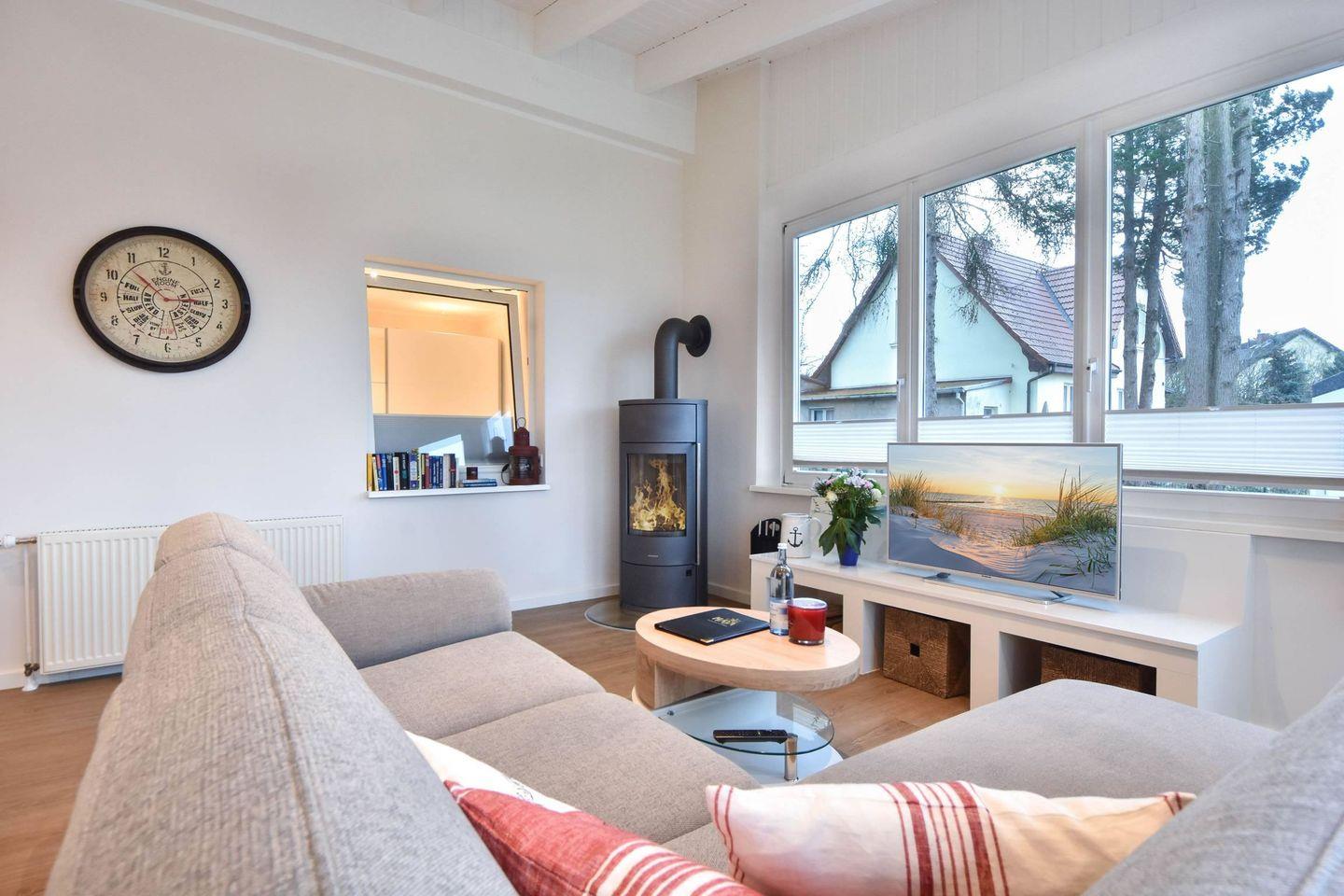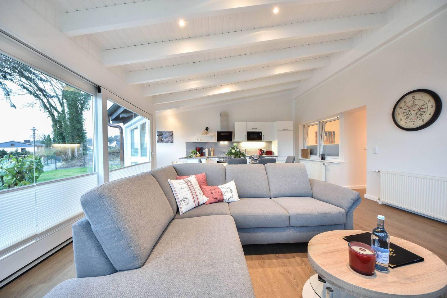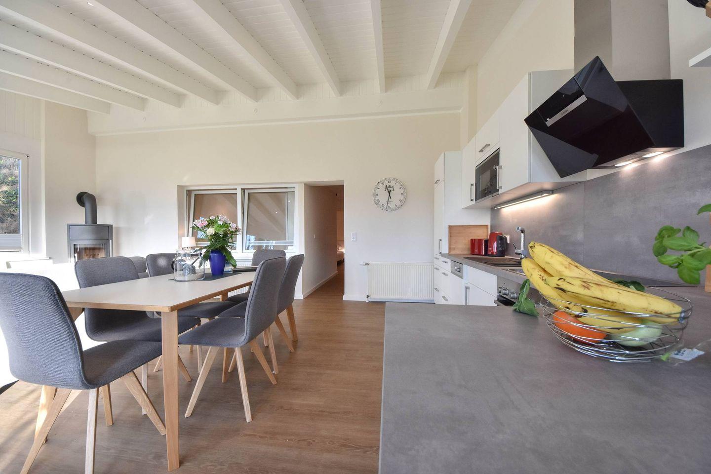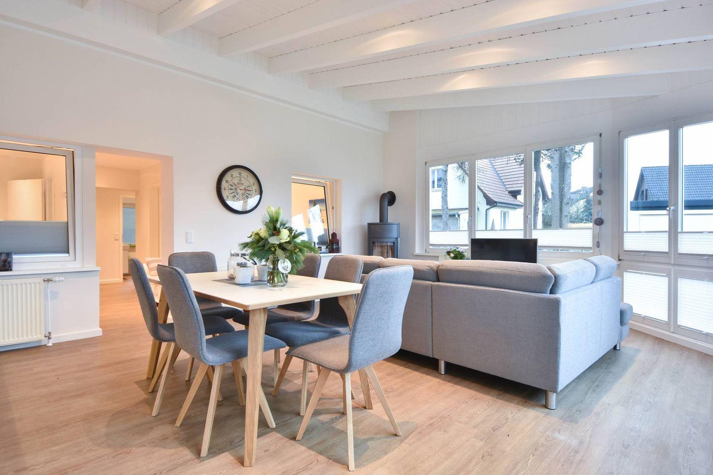 Das Haus besteht aus zwei separaten Wohnungen, die hervorragend gemeinsam genutzt werden können und dennoch die Möglichkeit bieten, sich am Ende des Tages zurück zu ziehen. Jede Wohnung verfügt über einen eigenen Eingang, einen offenen Wohnbereich mit großzügiger Sitzlandschaft und eigenem Kamin, eine offene und voll ausgestattete Küche samt Mikrowelle, Backofen und Herd, zwei Schlafzimmer mit Doppelbett und je ein Badezimmer mit Tageslicht, Dusche und Waschtrockner. So können hier in jeder Einheit vier (und insgesamt acht) Erwachsene komfortabel Ihren Urlaub verbringen. Dank der großen Fensterfronten im Wohnbereich, die komplett geöffnet werden können, entsteht ein zweiter Zugang zum Hof und die Möglichkeit, beide Wohnungen geschickt für Besuch der jeweils Anderen zu öffnen. Die Fenster im hinteren Bereich des Hauses sind mit Mückenschutz ausgestattet, sodass Sie zu jeder Zeit die Fenster öffnen können. Für ausreichend Sichtschutz und Privatsphäre sorgen die Plissees an allen Fensterfronten.
