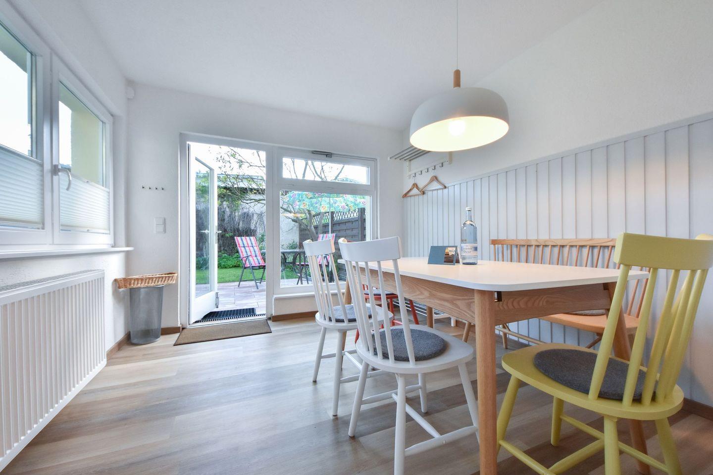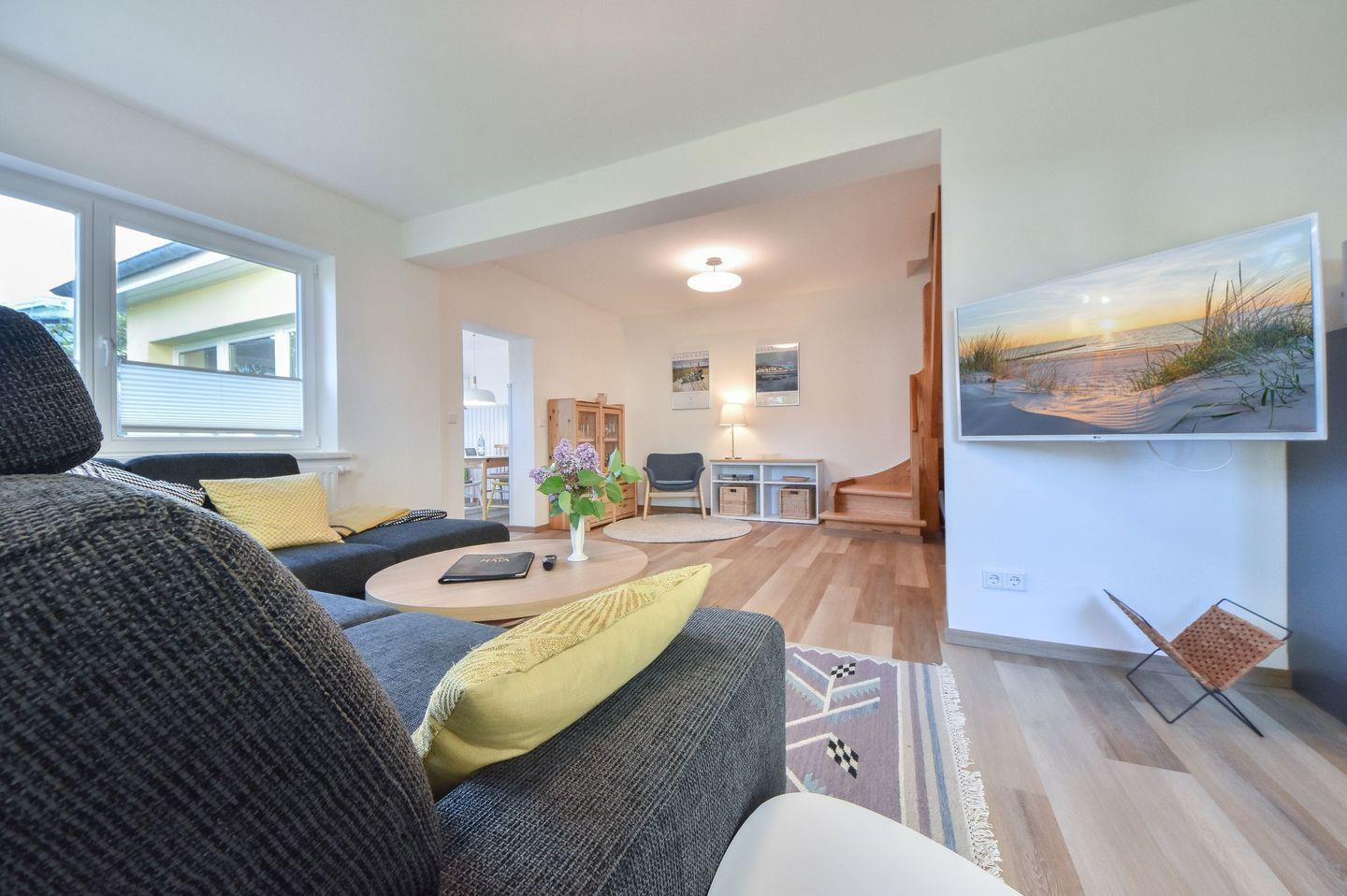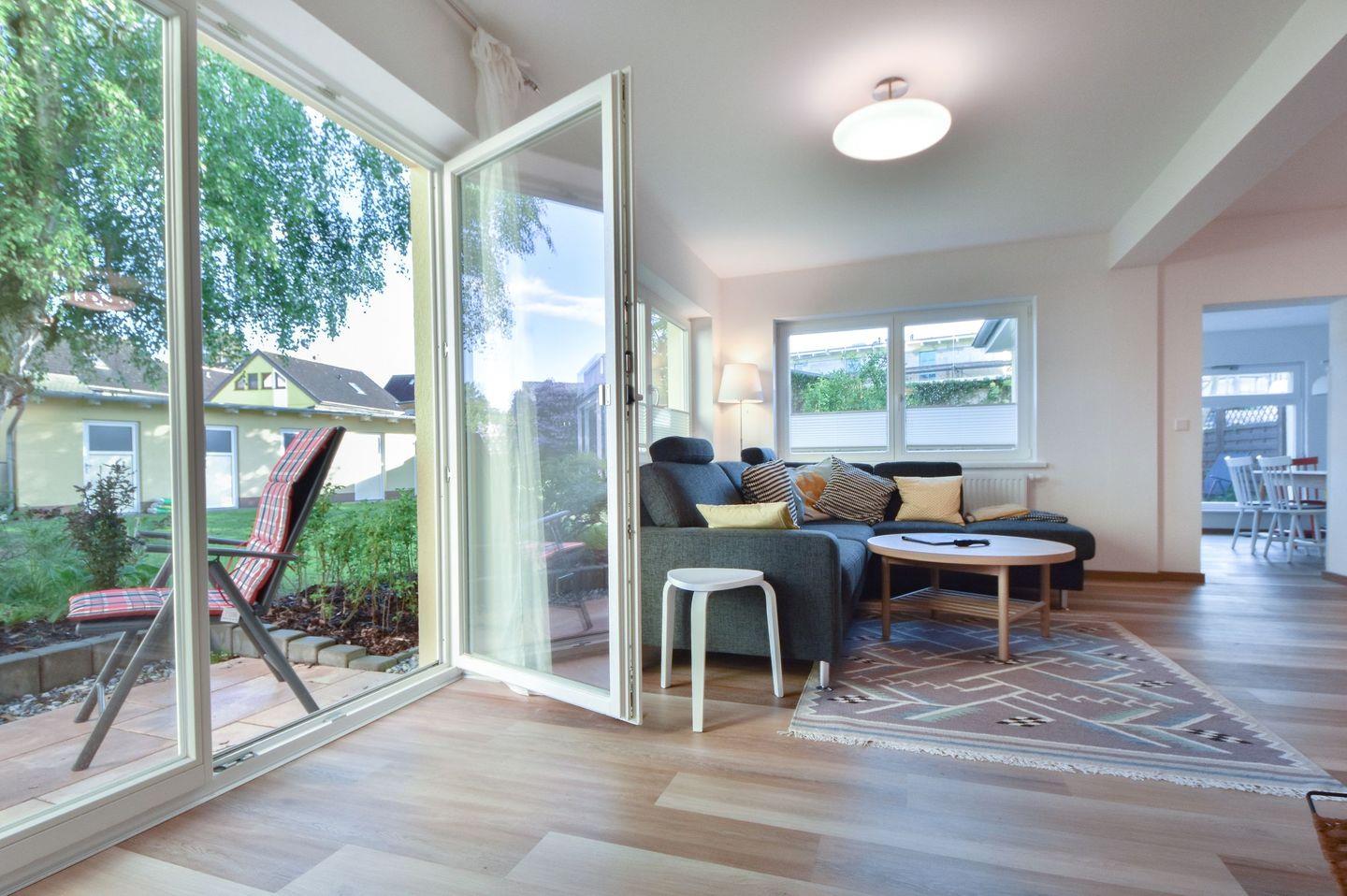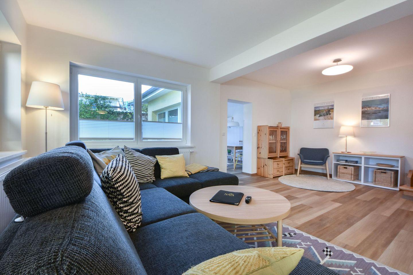 Usedom To Hus - hier ist der Name Programm, denn schnell werden Sie sich in diesem Ferienhaus wohlfühlen. Bei der Renovierung im Jahr 2021 wurde viel Wert auf eine stimmige Einrichtung gelegt; moderne Elemente verbinden sich mit den hochwertigen Echtholzmöbeln zu einem passenden Gesamtkonzept. Das Ferienhaus ist freistehend auf dem umzäunten Grundstück eines historischen Mehrfamilienhauses und bietet viel Platz und Privatsphäre für bis zu vier Personen. Die 78 Quadratmeter Wohnfläche verteilen sich geschickt auf zwei Etagen. Im unteren Bereich des Hauses befindet sich der große, helle Eingangsbereich mit großzügigem Esstisch, sowie der offen gestaltete Wohn- und Küchenbereich. Dank der großen Fensterfronten zum Garten gelangt viel Licht in den Raum. Die Küche ist komplett ausgestattet und verfügt über eine Mikrowelle, Geschirrspüler, Backofen und Ceranfeld. Alle Dinge des täglichen Bedarfs wie Kaffeemaschine und Toaster sind natürlich vorhanden. Der TV samt Soundbar ist geschickt angebracht und kann zur Couch ausgerichtet werden. Vom Wohnraum erreichen Sie eine kleine Terrasse. Die große Terrasse mit Sonnenschirm und Gartenmöbeln befindet sich vor dem Wohnungseingang. WLAN ist kostenfrei nutzbar. Ebenfalls zur ebenen Erde befindet sich das große Duschbad mit bodentiefer Dusche und Tageslicht. Über eine schmale Treppe gelangen Sie in die obere Etage, die die beiden Schlafzimmer beherbergt. Ein Schlafzimmer verfügt über ein Doppelbett, das zweite Schlafzimmer ist mit einem Doppelstockbett eingerichtet und dient idealerweise als Kinderzimmer. Das Bett besitzt Standardmaße (je 200cm x 90cm) und ist belastbar, sodass auch erwachsene Personen hier übernachten könnten. Beide Zimmer können mit Plissees abgedunkelt werden und verfügen über Stauraum für Ihre Garderobe. Für kleine Gäste steht eine Kinderausstattung mit Trip Trap Kinderstuhl oder alternativ Antilop-Hochstuhl, Kinderreisebett (ohne Wäsche aber mit Matratze), Nachtlicht, Wickelauflage und Babybadewanne zur Verfügung. Ein PKW-Stellplatz am Haus ist für die Wohnung reserviert. Sollten Sie Ihre eigenen Räder mitbringen, so können Sie diese in einem abschließbaren Fahrradschuppen unterstellen.