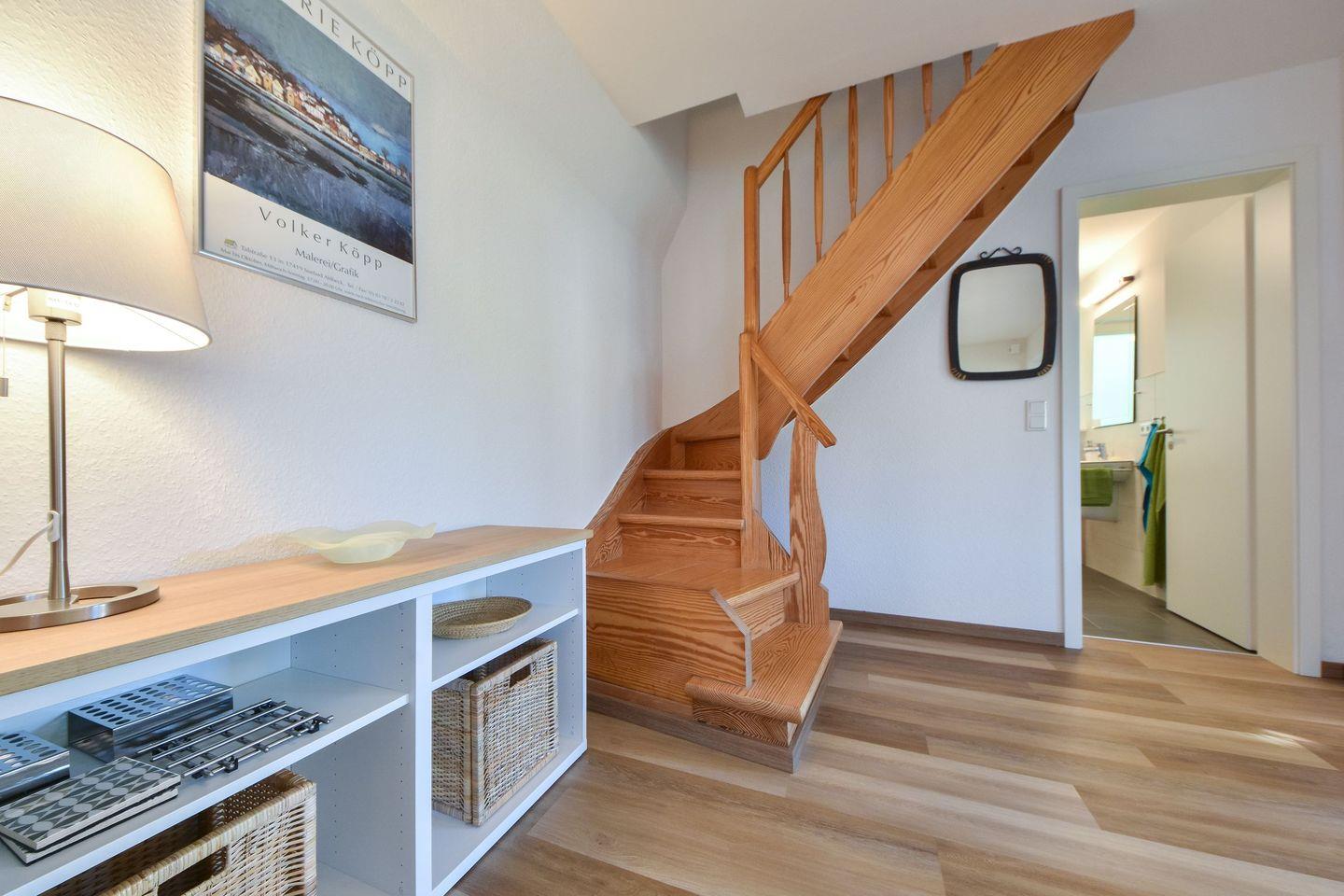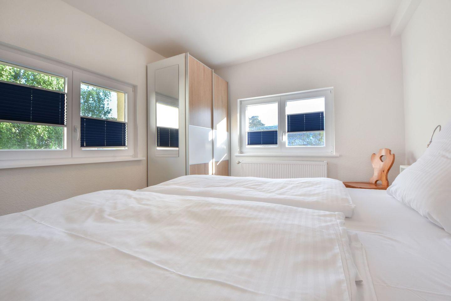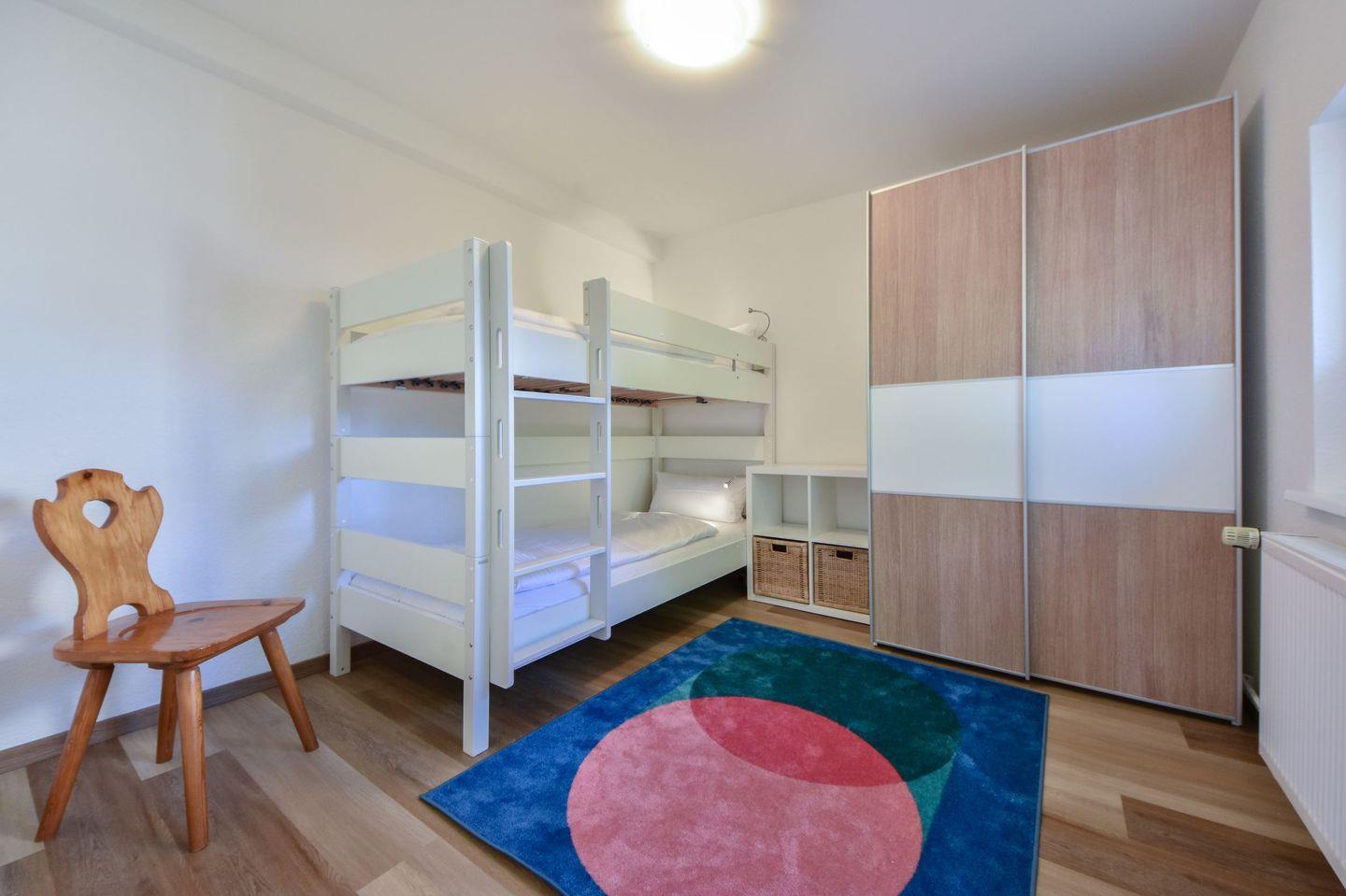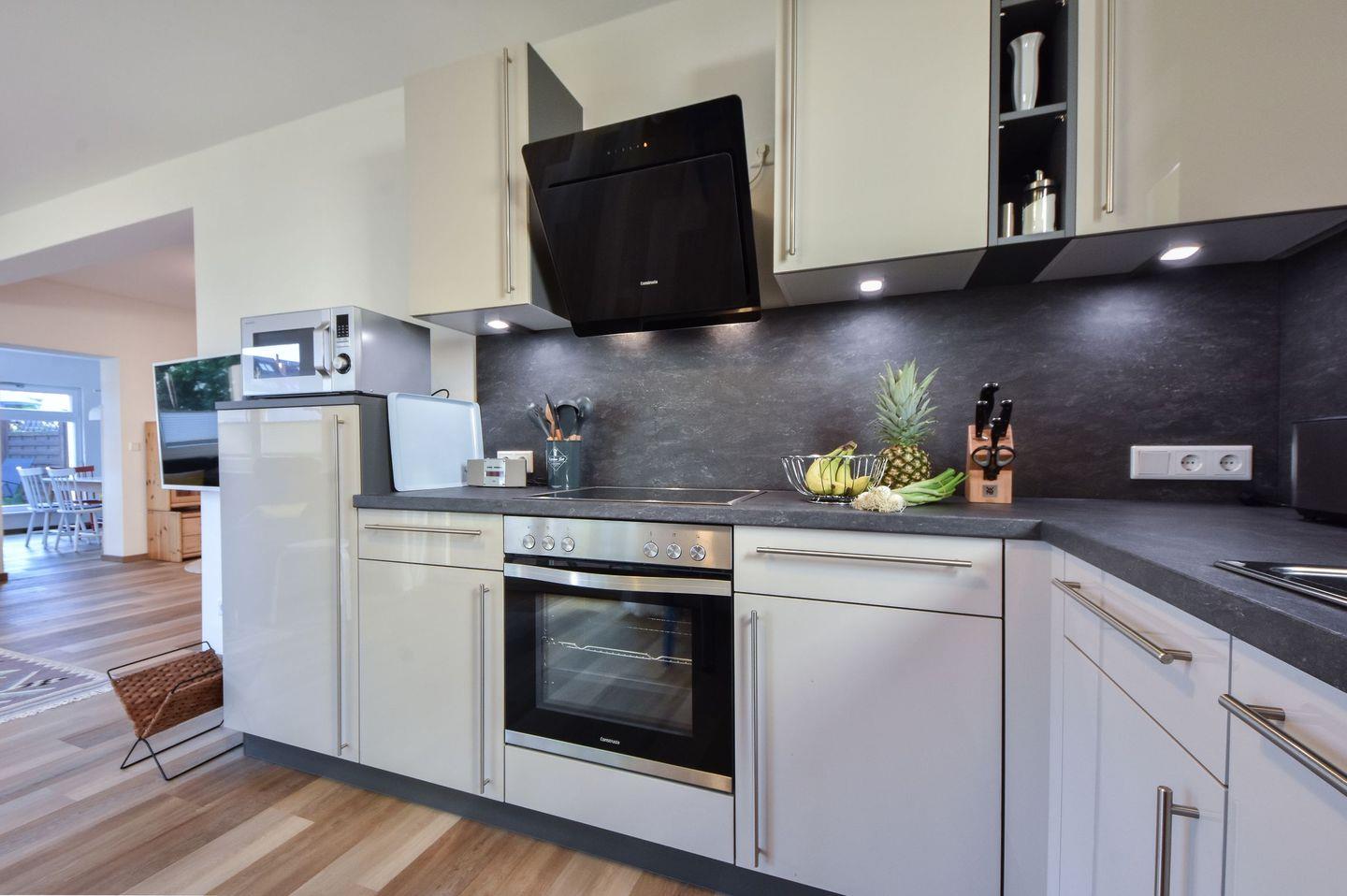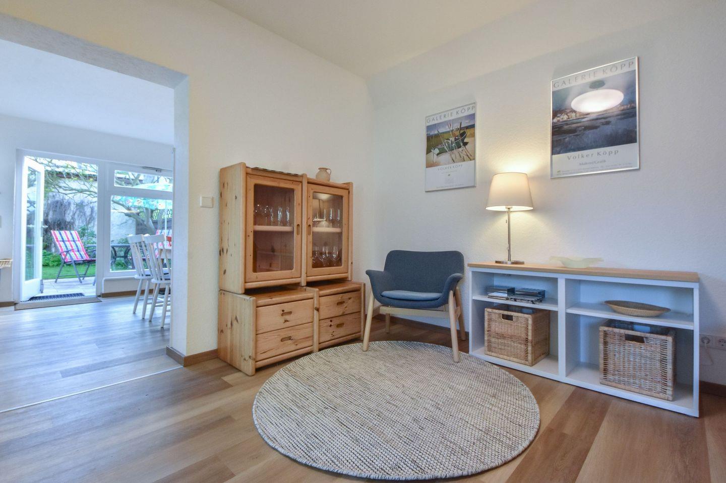 Usedom To Hus - hier ist der Name Programm, denn schnell werden Sie sich in diesem Ferienhaus wohlfühlen. Bei der Renovierung im Jahr 2021 wurde viel Wert auf eine stimmige Einrichtung gelegt; moderne Elemente verbinden sich mit den hochwertigen Echtholzmöbeln zu einem passenden Gesamtkonzept. Das Ferienhaus ist freistehend auf dem umzäunten Grundstück eines historischen Mehrfamilienhauses und bietet viel Platz und Privatsphäre für bis zu vier Personen. Die 78 Quadratmeter Wohnfläche verteilen sich geschickt auf zwei Etagen. Im unteren Bereich des Hauses befindet sich der große, helle Eingangsbereich mit großzügigem Esstisch, sowie der offen gestaltete Wohn- und Küchenbereich. Dank der großen Fensterfronten zum Garten gelangt viel Licht in den Raum. Die Küche ist komplett ausgestattet und verfügt über eine Mikrowelle, Geschirrspüler, Backofen und Ceranfeld. Alle Dinge des täglichen Bedarfs wie Kaffeemaschine und Toaster sind natürlich vorhanden. Der TV samt Soundbar ist geschickt angebracht und kann zur Couch ausgerichtet werden. Vom Wohnraum erreichen Sie eine kleine Terrasse. Die große Terrasse mit Sonnenschirm und Gartenmöbeln befindet sich vor dem Wohnungseingang. WLAN ist kostenfrei nutzbar. Ebenfalls zur ebenen Erde befindet sich das große Duschbad mit bodentiefer Dusche und Tageslicht. Über eine schmale Treppe gelangen Sie in die obere Etage, die die beiden Schlafzimmer beherbergt. Ein Schlafzimmer verfügt über ein Doppelbett, das zweite Schlafzimmer ist mit einem Doppelstockbett eingerichtet und dient idealerweise als Kinderzimmer. Das Bett besitzt Standardmaße (je 200cm x 90cm) und ist belastbar, sodass auch erwachsene Personen hier übernachten könnten. Beide Zimmer können mit Plissees abgedunkelt werden und verfügen über Stauraum für Ihre Garderobe. Für kleine Gäste steht eine Kinderausstattung mit Trip Trap Kinderstuhl oder alternativ Antilop-Hochstuhl, Kinderreisebett (ohne Wäsche aber mit Matratze), Nachtlicht, Wickelauflage und Babybadewanne zur Verfügung. Ein PKW-Stellplatz am Haus ist für die Wohnung reserviert. Sollten Sie Ihre eigenen Räder mitbringen, so können Sie diese in einem abschließbaren Fahrradschuppen unterstellen.
