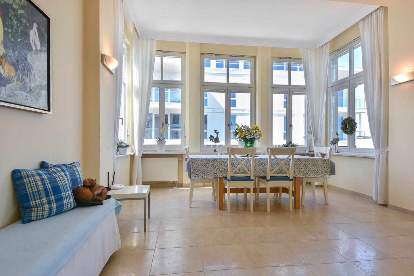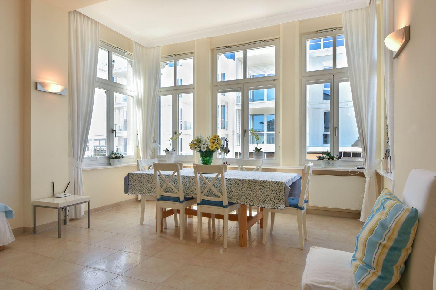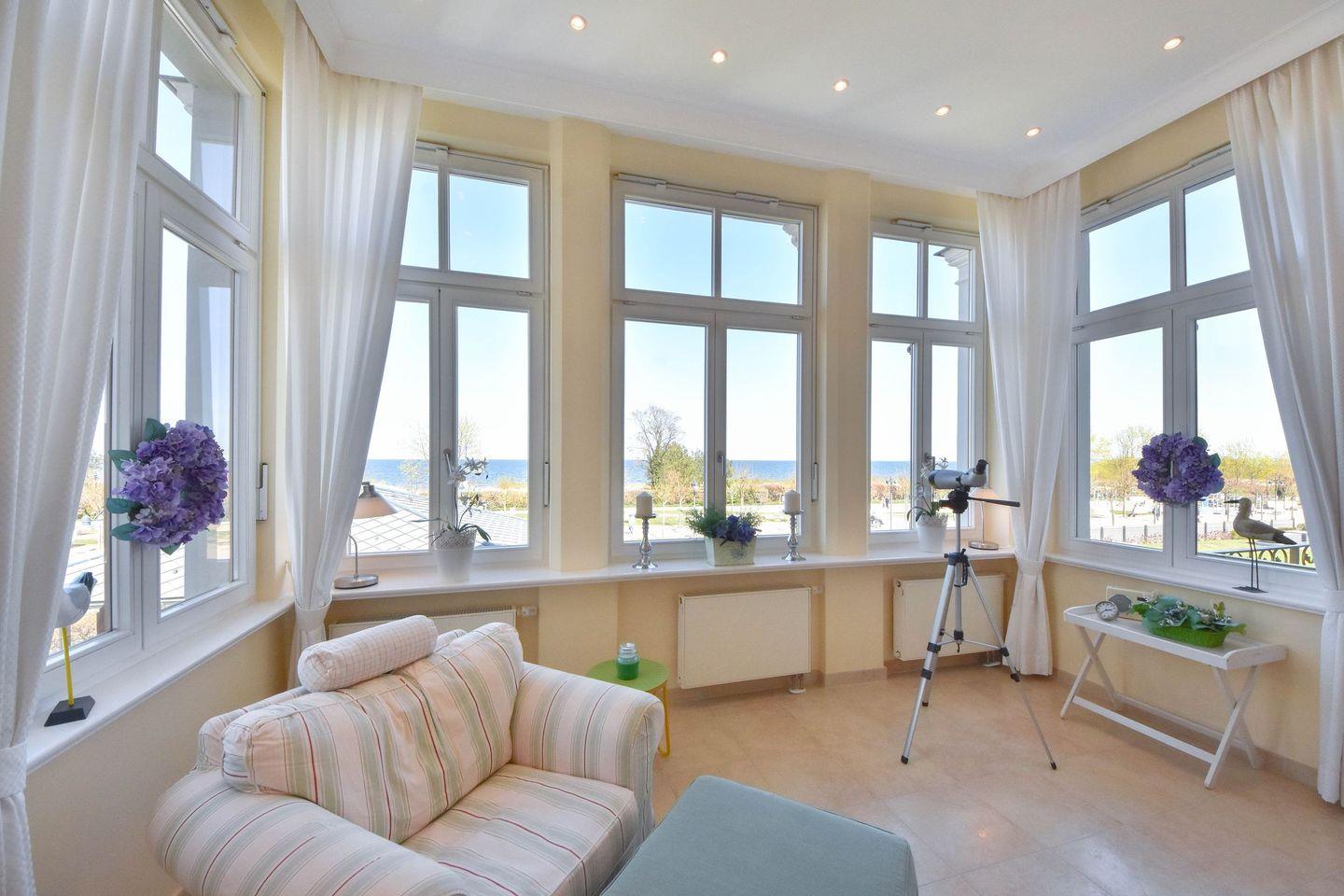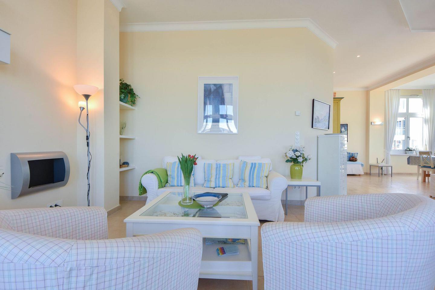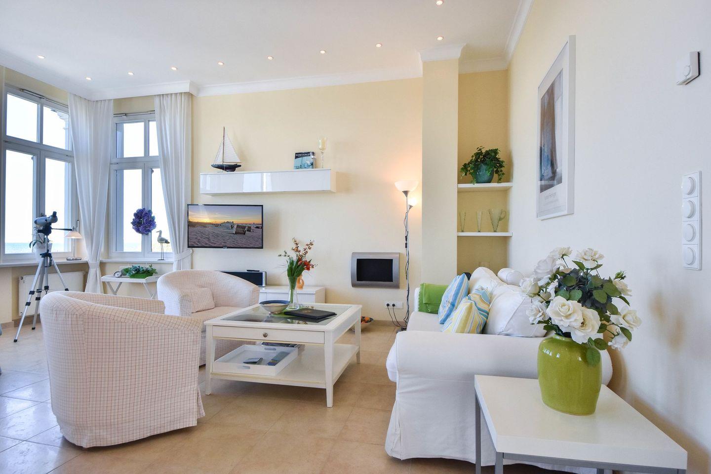 Im hell und freundlich eingerichteten Wohnbereich werden Sie sicher die meiste Zeit verbringen. Der Wohnbereich ist ausgestattet mit einem Sofa, drei Sesseln und einem Flachbild-Fernseher. Entspannen Sie mit einem Buch, lassen Sie bei geöffnetem Fenster das Meeresrauschen auf sich wirken oder genießen Sie die fantastische Aussicht auf die Ostsee und ihre Promenade. Anliegend finden Sie die vollwertig ausgestattete, offene Küche mit Mikrowelle, Kühl- und Gefrierschrank sowie einem Vier-Platten-Herd. Mit der ganzen Familie lässt es sich hervorragend am großen Esstisch in der Loggia dinieren. Beide Schlafzimmer sind mit je einem Doppelbett (Liegefläche 1,80 x 2,00 Meter), Nachttischen und einem Kleiderschrank eingerichtet. Eines der Schlafzimmer verfügt zusätzlich über einen kleinen TV. Sollten Sie sich in Ihrer morgendlichen Routine lieber aufteilen wollen, so ist dies dank des zweites Bades in der Wohnung möglich. Beide Bäder sind ausgestattet mit einem WC, Waschtisch und einer ebenerdigen Dusche. Das größere Bad besitzt zudem eine Badewanne.