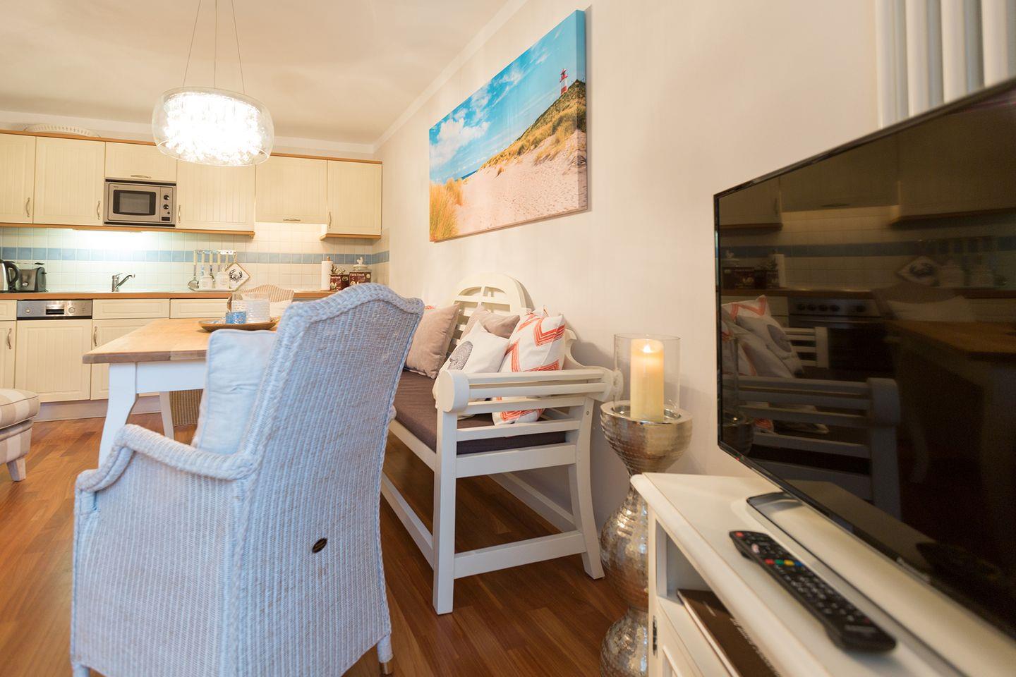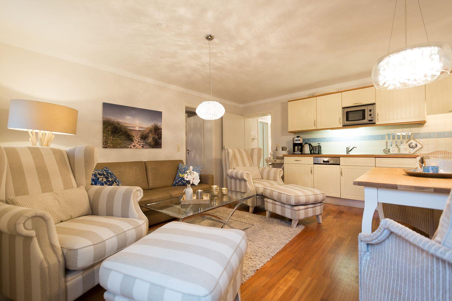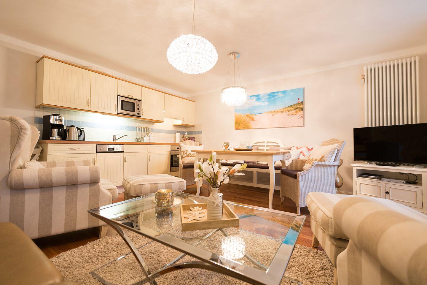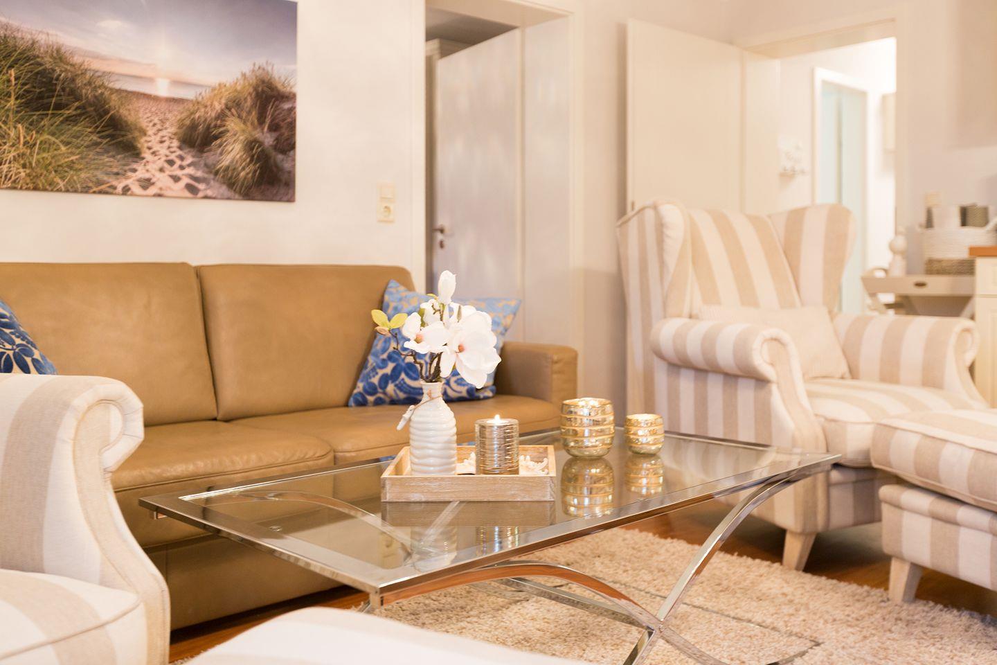 Das Wohnzimmer ist in warmen Braun- und Beigetönen gehalten und eröffnet einen stimmigen Übergang zur gemütlichen Sitzecke und zur offenen Küchenzeile. Legen Sie in einem der beiden bequemen Ohrensessel die Beine hoch oder kommen Sie gemeinsam mit der Familie zum Spieleabend an der Sitzgruppe zusammen. Dank der vollwertigen Küchenausstattung ist es möglich, auch im Urlaub eigene Mahlzeiten zuzubereiten. Eine Nespresso-Kapselmaschine ist zusätzlich zu der Filtermaschine vorhanden.