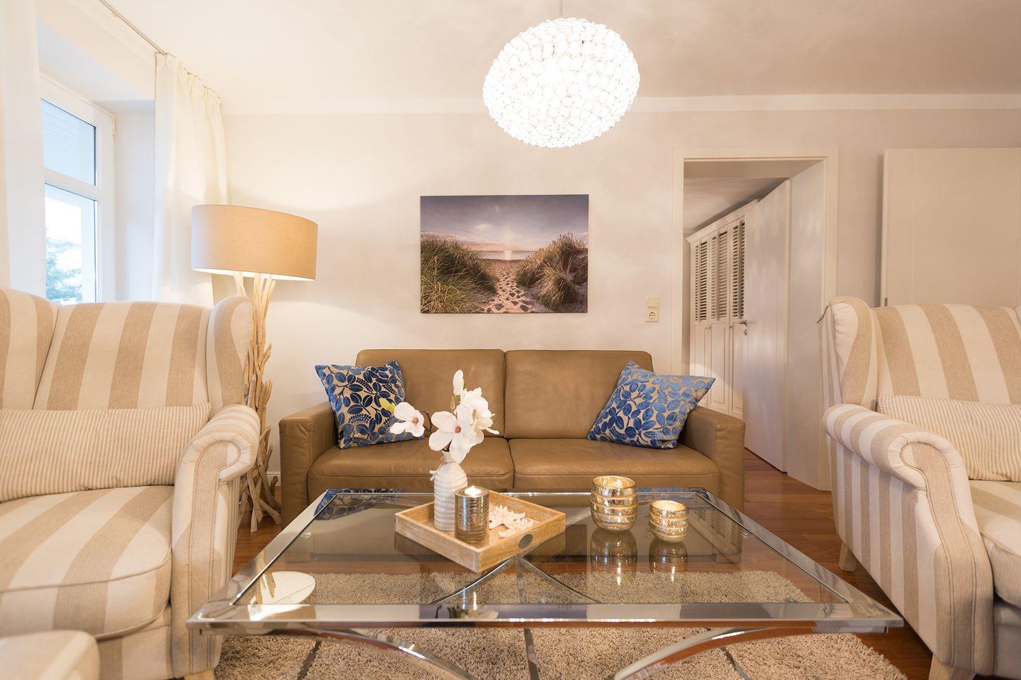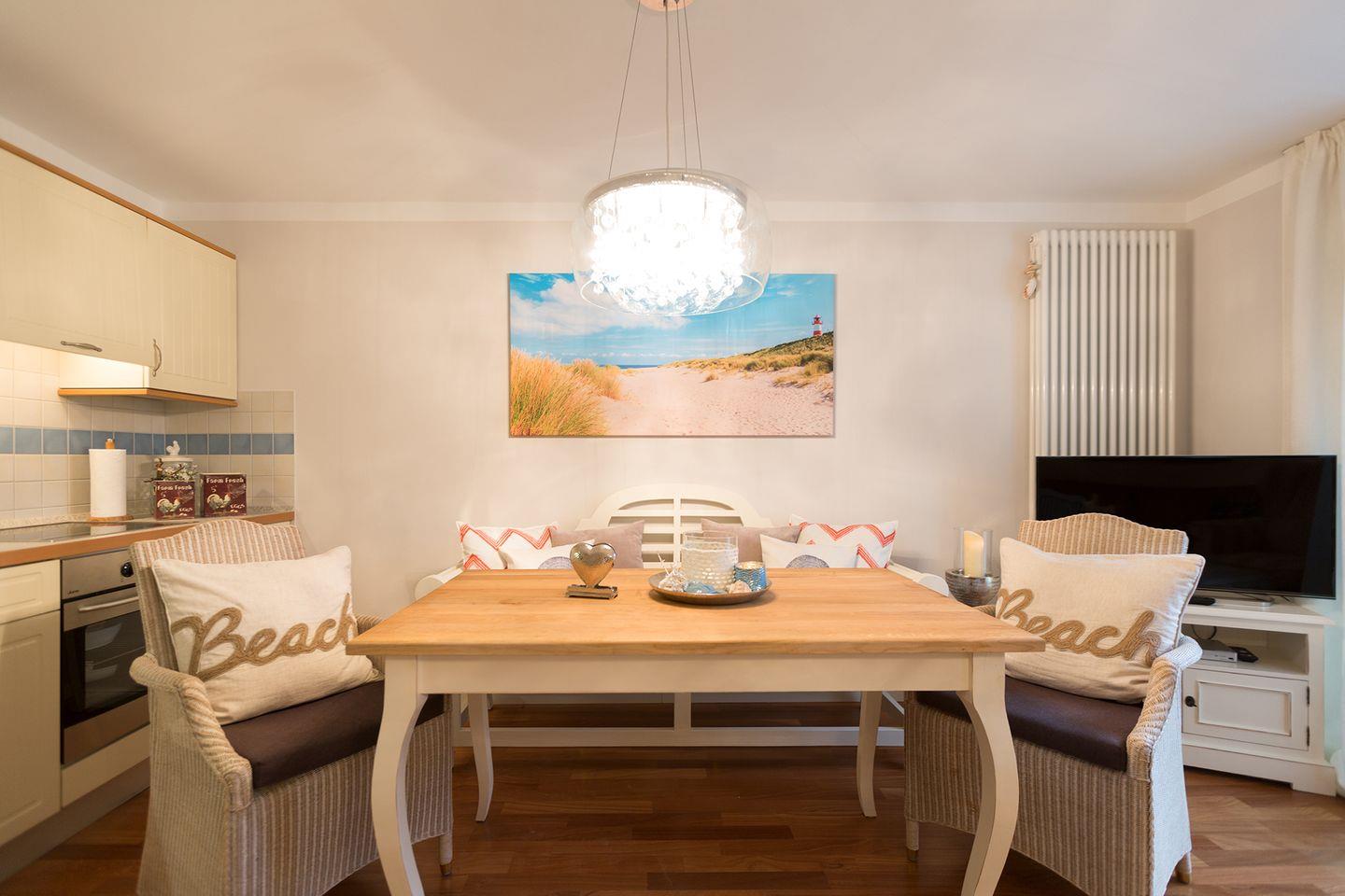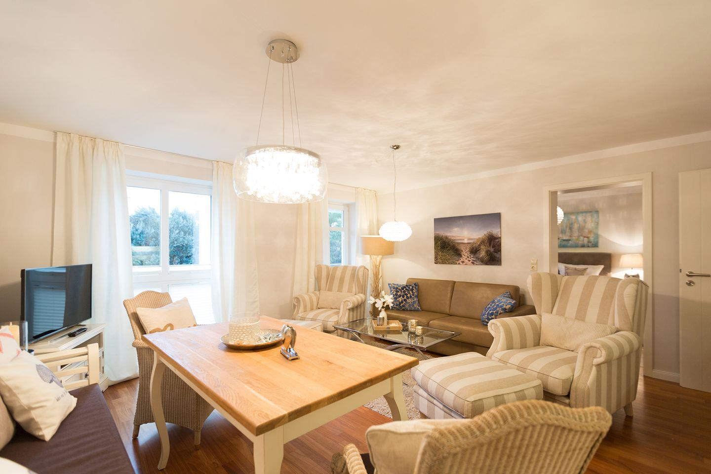 Das Wohnzimmer ist in warmen Braun- und Beigetönen gehalten und eröffnet einen stimmigen Übergang zur gemütlichen Sitzecke und zur offenen Küchenzeile. Legen Sie in einem der beiden bequemen Ohrensessel die Beine hoch oder kommen Sie gemeinsam mit der Familie zum Spieleabend an der Sitzgruppe zusammen. Dank der vollwertigen Küchenausstattung ist es möglich, auch im Urlaub eigene Mahlzeiten zuzubereiten. Eine Nespresso-Kapselmaschine ist zusätzlich zu der Filtermaschine vorhanden.