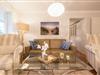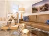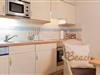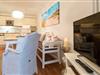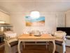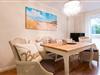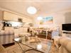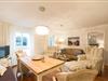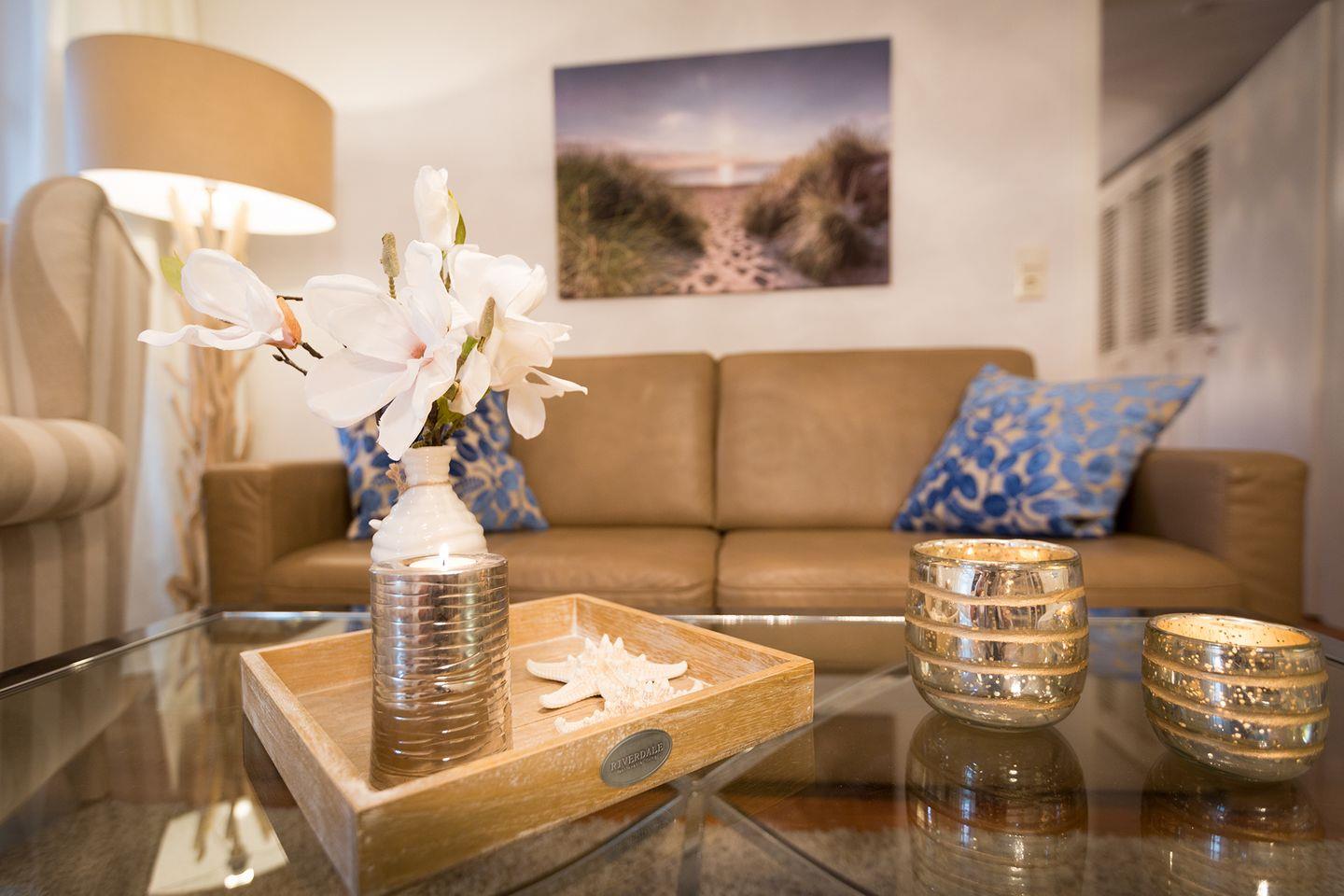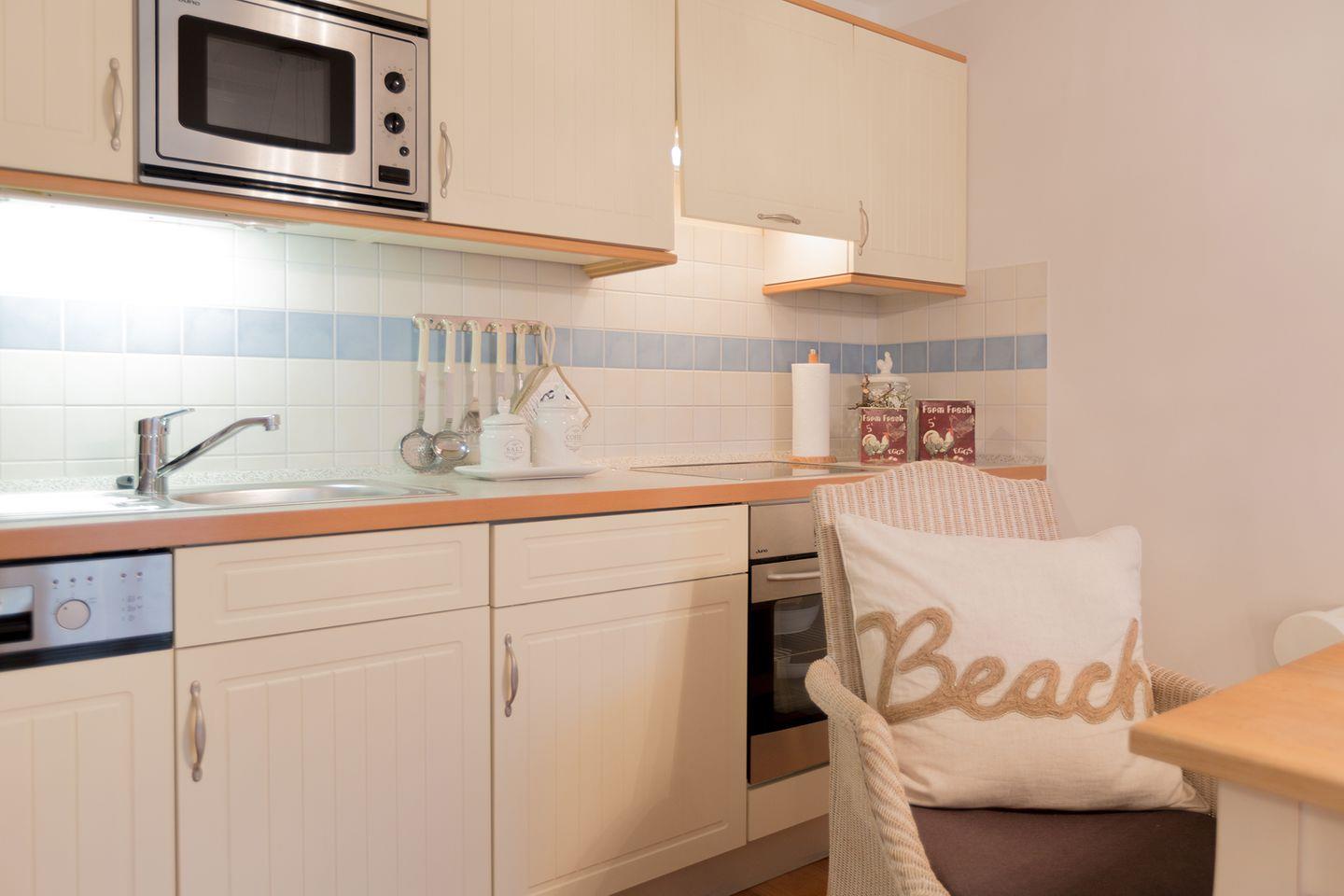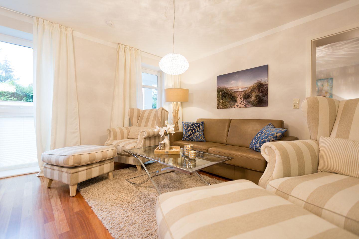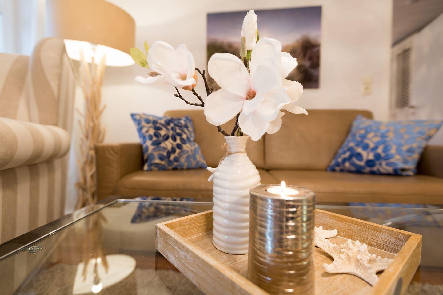 Das Wohnzimmer ist in warmen Braun- und Beigetönen gehalten und eröffnet einen stimmigen Übergang zur gemütlichen Sitzecke und zur offenen Küchenzeile. Legen Sie in einem der beiden bequemen Ohrensessel die Beine hoch oder kommen Sie gemeinsam mit der Familie zum Spieleabend an der Sitzgruppe zusammen. Dank der vollwertigen Küchenausstattung ist es möglich, auch im Urlaub eigene Mahlzeiten zuzubereiten. Eine Nespresso-Kapselmaschine ist zusätzlich zu der Filtermaschine vorhanden.