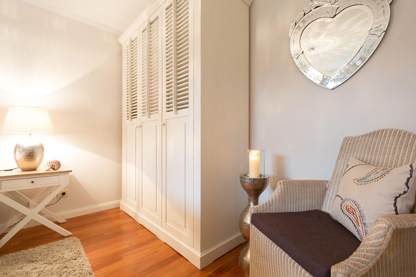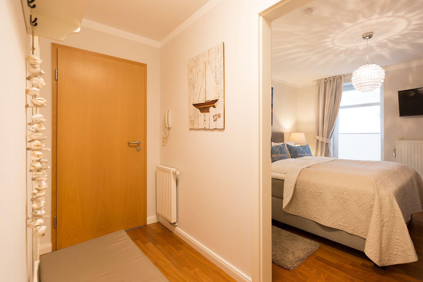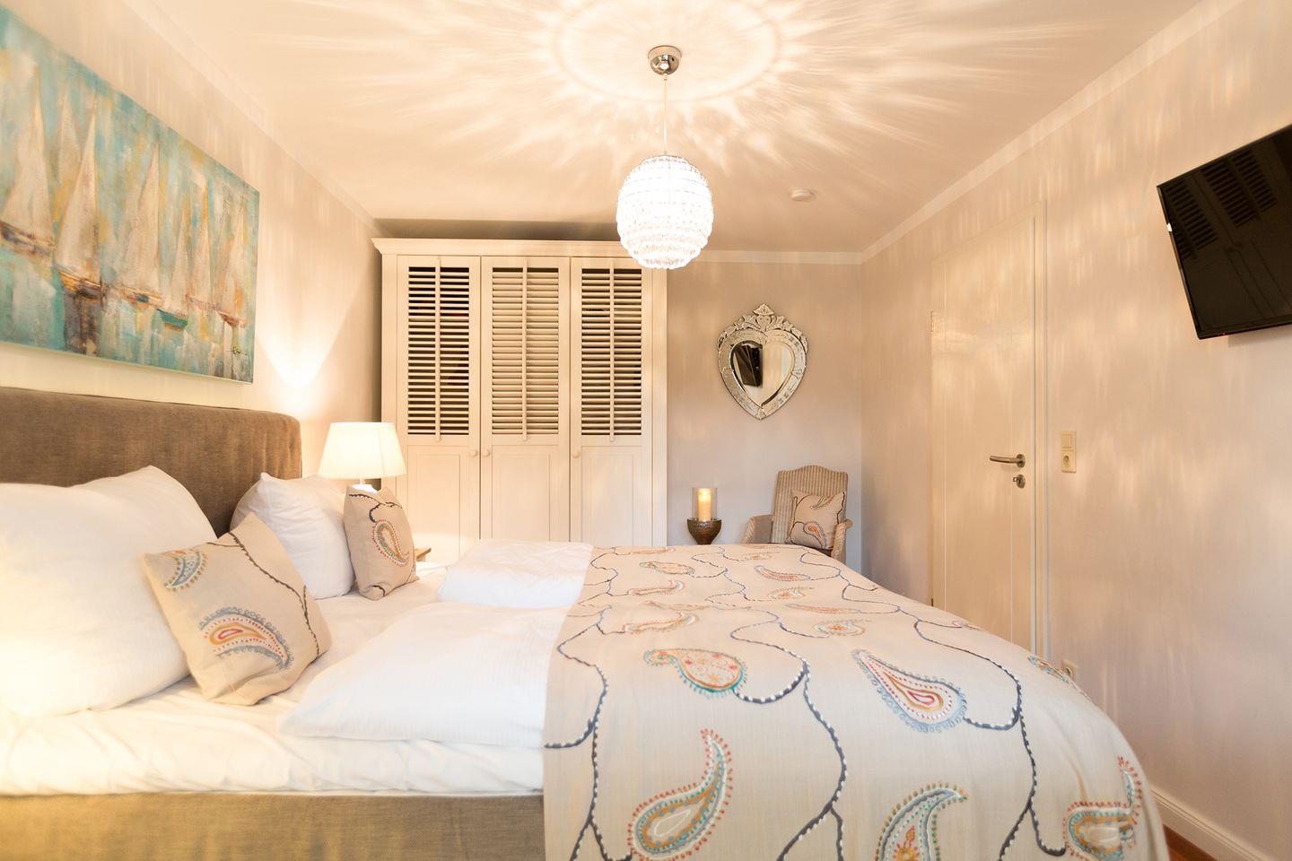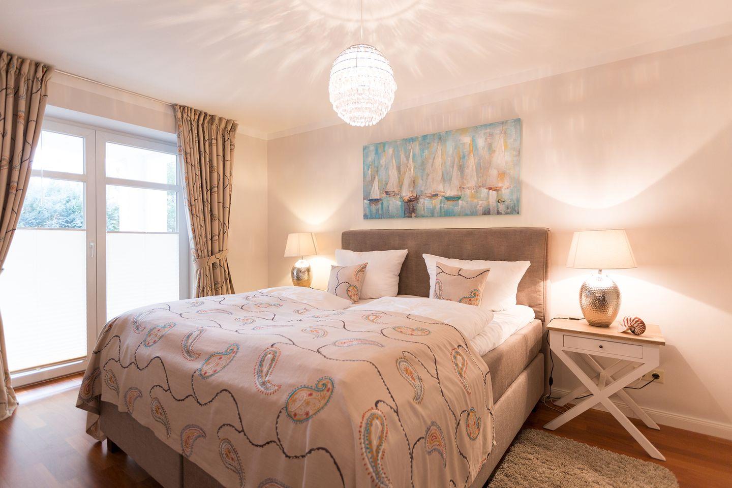 Ein nahezu einzigartiges Highlight sind die Sternenhimmel, die von einem österreichischen Künstler auf die Zimmerdecken beider Schlafzimmer gemalt wurden. Bei Tageslicht ist davon nichts zu sehen, aber nachts, wenn Sie im Bett liegen und sich Ihre Augen an die Dunkelheit gewöhnt haben, entfaltet das Kunstwerk seinen ganz besonderen Charme. Zudem ermöglicht Ihnen das zweite Schlafzimmer Zutritt zur gemeinschaftlich genutzten Terrasse, welche mit Sonnenliegen bestuhlt ist. Wenn Sie es lieber etwas privater mögen, können Sie sowohl vom ersten Schlafzimmer als auch vom Wohnzimmer die zweite, wohnungseigene und zudem überdachte Terrasse nutzen. Sie erreichen über diese Terrasse zusätzlich die hauseigene Gemeinschaftsaußenanlage mit Strandkörben. Das Bad mit Dusche, Waschschrank, WC und kleinen Extras bietet vielerlei Komfort.