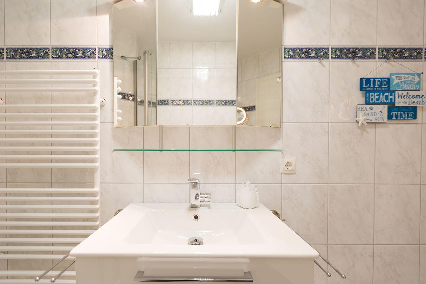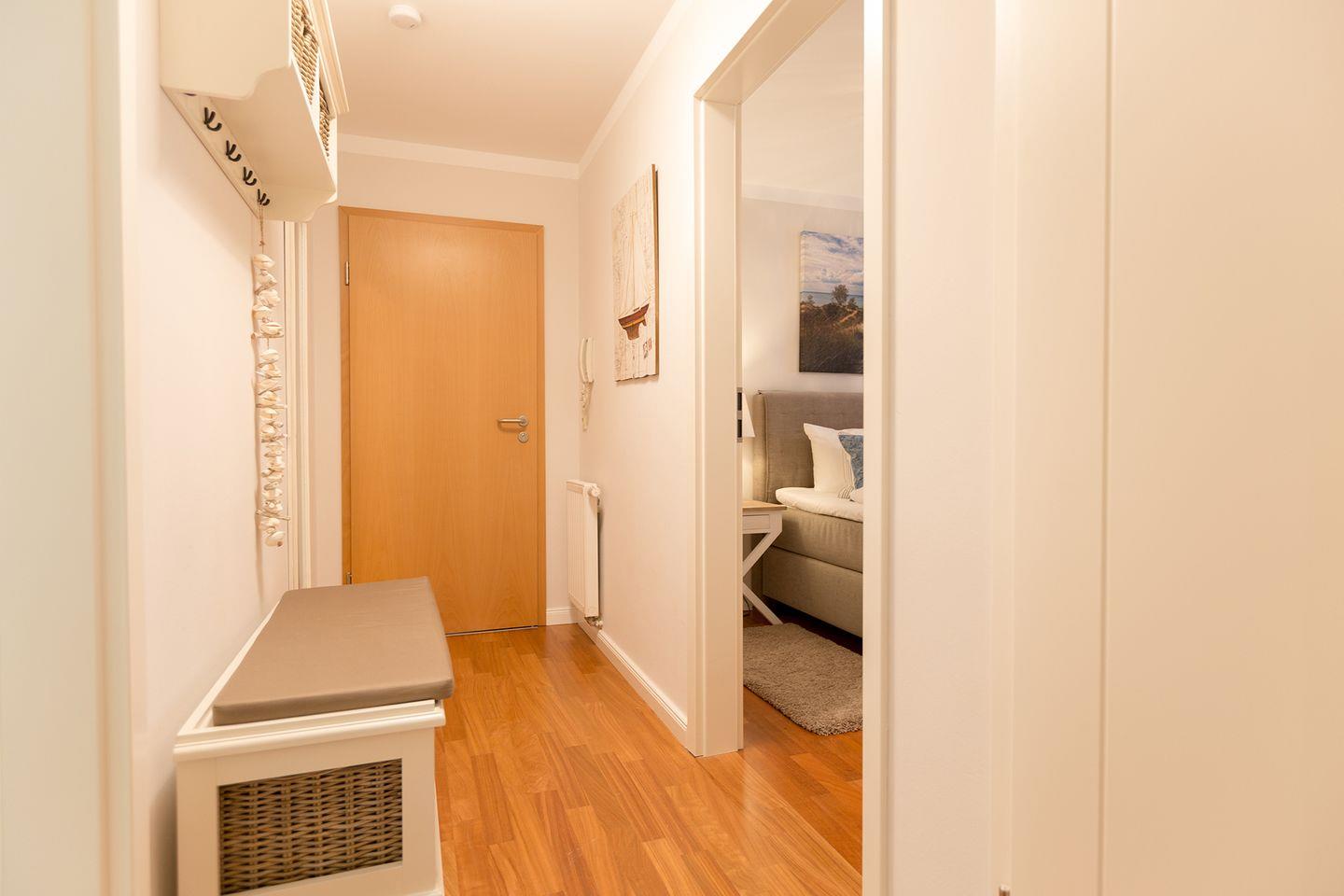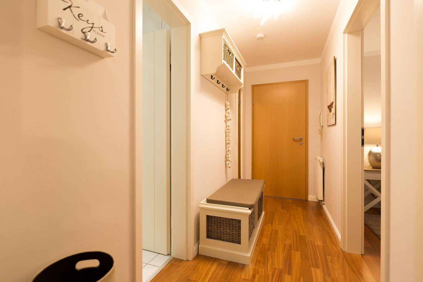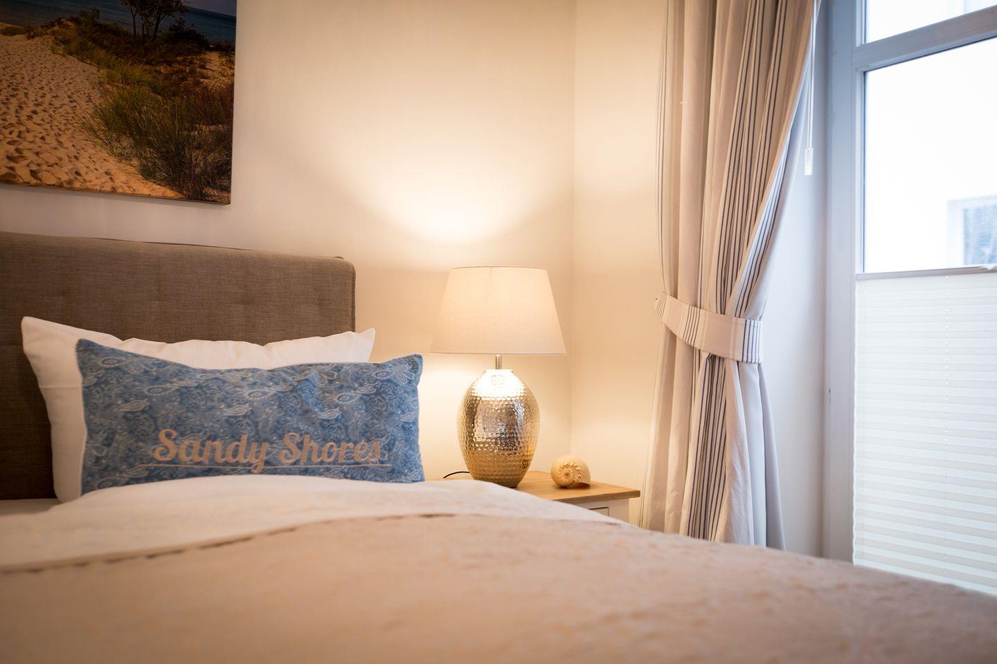 Ein nahezu einzigartiges Highlight sind die Sternenhimmel, die von einem österreichischen Künstler auf die Zimmerdecken beider Schlafzimmer gemalt wurden. Bei Tageslicht ist davon nichts zu sehen, aber nachts, wenn Sie im Bett liegen und sich Ihre Augen an die Dunkelheit gewöhnt haben, entfaltet das Kunstwerk seinen ganz besonderen Charme. Zudem ermöglicht Ihnen das zweite Schlafzimmer Zutritt zur gemeinschaftlich genutzten Terrasse, welche mit Sonnenliegen bestuhlt ist. Wenn Sie es lieber etwas privater mögen, können Sie sowohl vom ersten Schlafzimmer als auch vom Wohnzimmer die zweite, wohnungseigene und zudem überdachte Terrasse nutzen. Sie erreichen über diese Terrasse zusätzlich die hauseigene Gemeinschaftsaußenanlage mit Strandkörben. Das Bad mit Dusche, Waschschrank, WC und kleinen Extras bietet vielerlei Komfort.