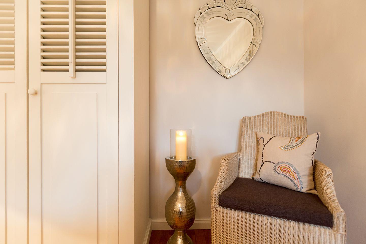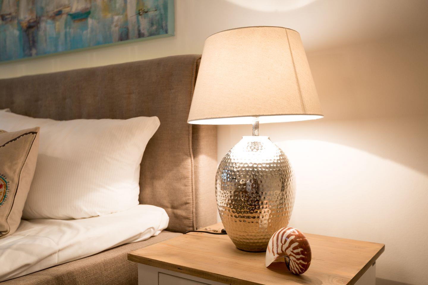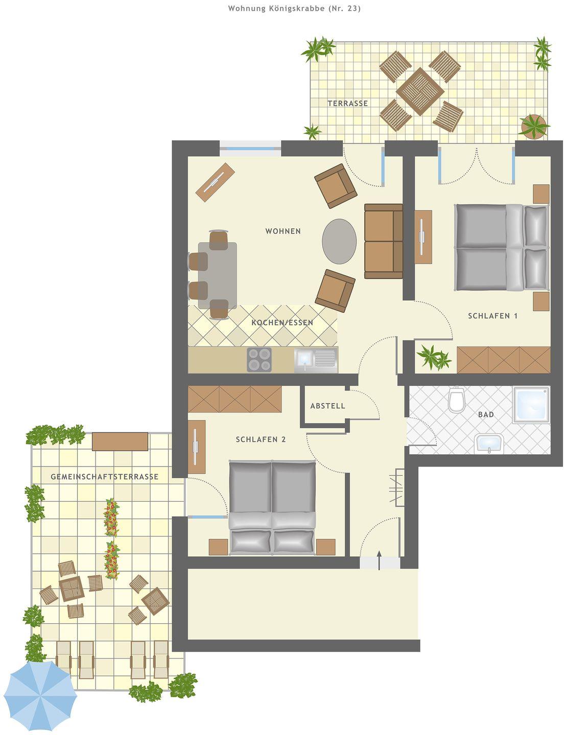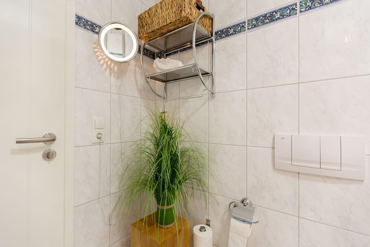 Ein nahezu einzigartiges Highlight sind die Sternenhimmel, die von einem österreichischen Künstler auf die Zimmerdecken beider Schlafzimmer gemalt wurden. Bei Tageslicht ist davon nichts zu sehen, aber nachts, wenn Sie im Bett liegen und sich Ihre Augen an die Dunkelheit gewöhnt haben, entfaltet das Kunstwerk seinen ganz besonderen Charme. Zudem ermöglicht Ihnen das zweite Schlafzimmer Zutritt zur gemeinschaftlich genutzten Terrasse, welche mit Sonnenliegen bestuhlt ist. Wenn Sie es lieber etwas privater mögen, können Sie sowohl vom ersten Schlafzimmer als auch vom Wohnzimmer die zweite, wohnungseigene und zudem überdachte Terrasse nutzen. Sie erreichen über diese Terrasse zusätzlich die hauseigene Gemeinschaftsaußenanlage mit Strandkörben. Das Bad mit Dusche, Waschschrank, WC und kleinen Extras bietet vielerlei Komfort.