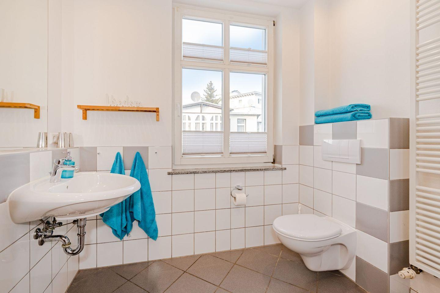 Diese 53 Quadratmeter große 2-Raum-Wohnung bietet als zentrumsnahes Urlaubsdomizil bis zu vier Personen Platz. Das Appartement befindet sich in der ersten Etage im Anbau der historischen Villa Alt Ahlbeck. Das Wohnzimmer ist mit einer gemütlichen Schlafcouch sowie zwei Sesseln und einen großen Flat-TV ausgestattet. Der Raum ist offen und hell in maritimer Farbgebung gestaltet. Hier dinieren Sie mit der Familie am Esstisch oder beobachten die Geschehnisse auf der Nebenstraße am Haus. Die Küche grenzt offen an den Wohnraum an und ist vollwertig eingerichtet. Unter anderem stehen ein 4-Platten-Herd, Kühlschrank, Mikrowelle sowie eine Spülmaschine zur Verfügung. Das Schlafzimmer ist liebevoll mit komfortablen Boxspringbett und einem Kleiderschrank für Ihre Garderobe hergerichtet. Im Badezimmer erwarten Sie mit einem WC, Waschbecken, Dusche und Handtuchheizung alle Annehmlichkeiten, die Sie von Zuhause gewohnt sind.
