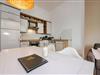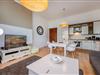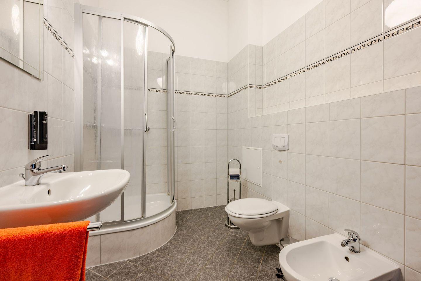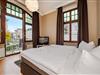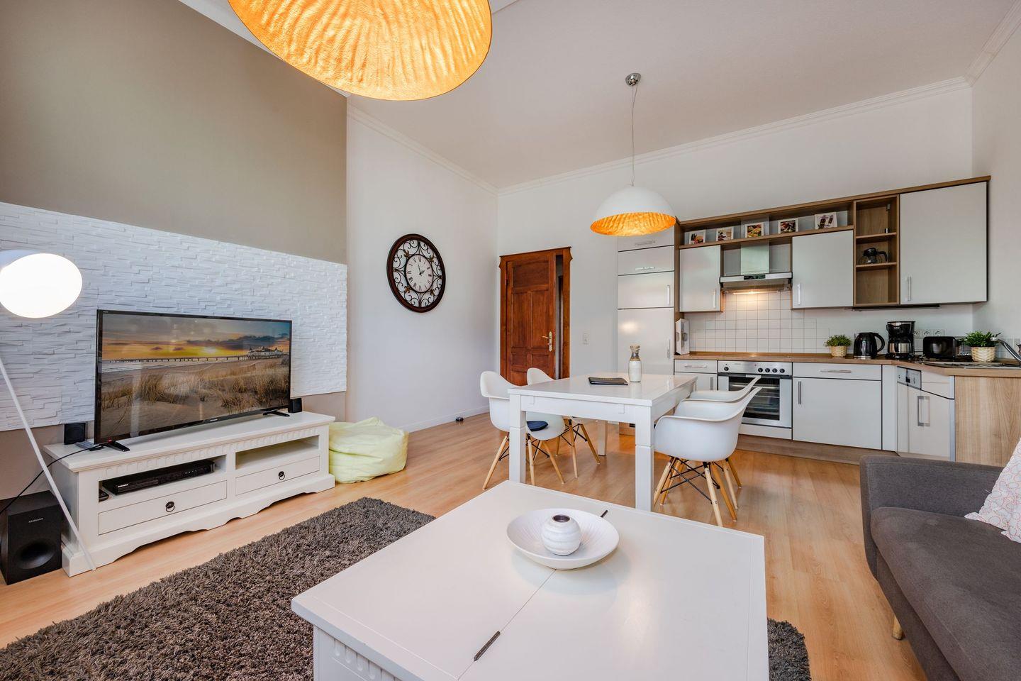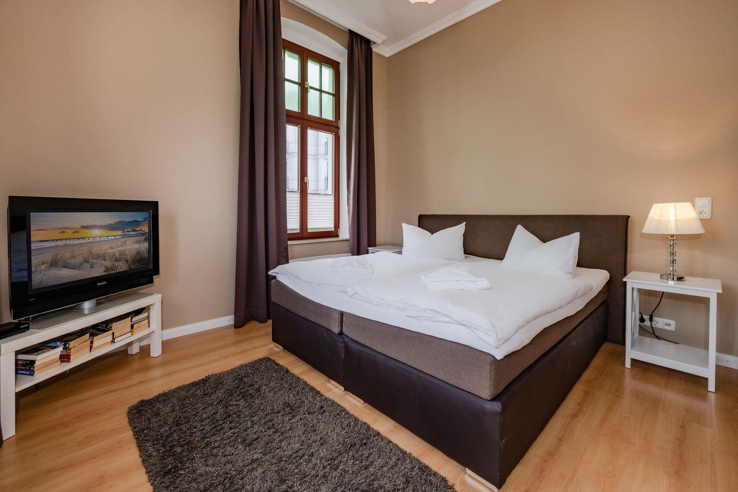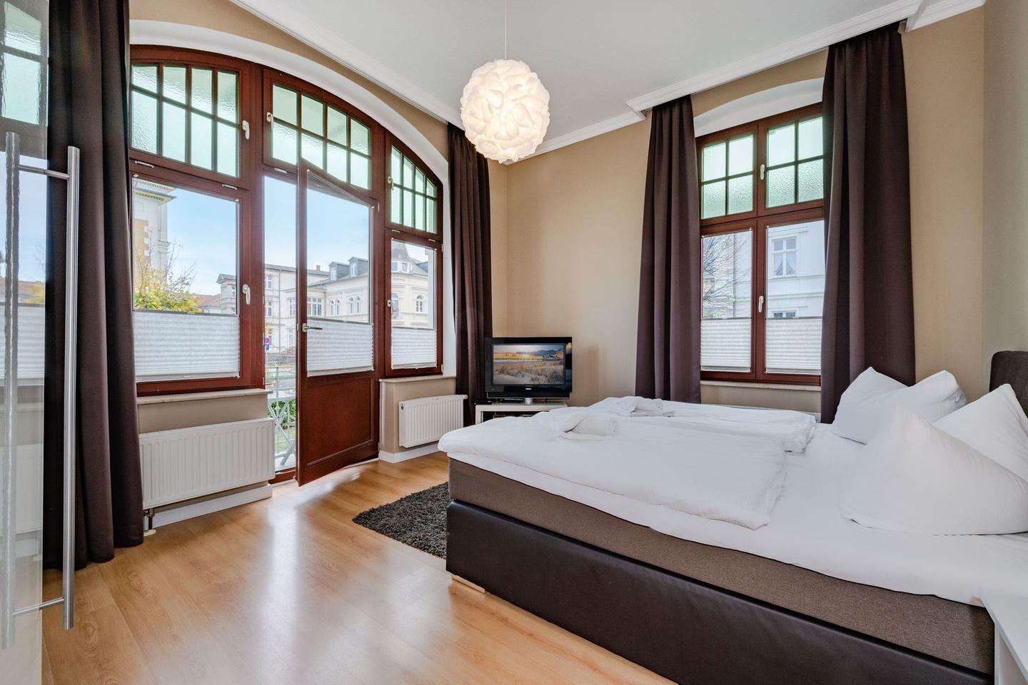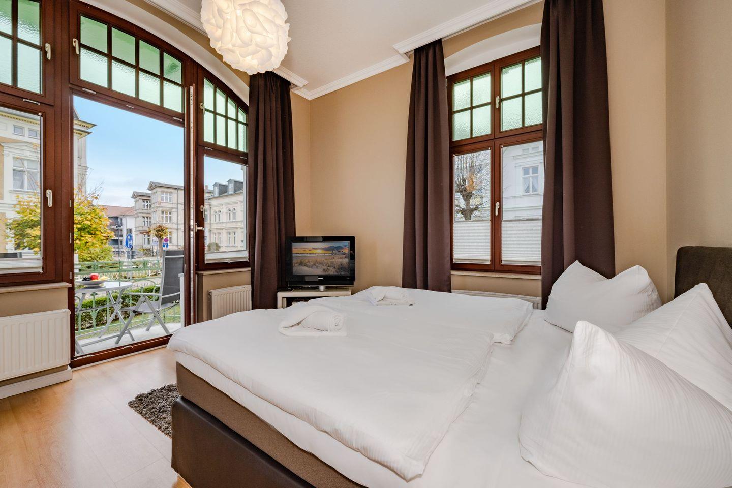 Das Wohnzimmer mit offener Küchenzeile ist in hellen und harmonischen Farbkombinationen stilvoll eingerichtet. So finden Sie dort die Schlafcouch für die dritte und vierte Person und einen ausreichend großen Flat-TV. Der Esstisch und die Küche fügen sich wunderbar in das Gesamtbild des Raumes. Liebevoll mit kleinen Details gestaltet und mit einer vollwertigen Küchenausstattung wird das Kochen auch im Urlaub zum Erlebnis. Umgeben von der einzigartigen Bäderarchitektur lässt es sich auf dem anliegenden Balkon wunderbar in ruhiger Lage ausspannen. Das Schlafzimmer ist mit einem bequemen Boxspringbett, einem platzbietenden Kleiderschrank und zudem mit einem weiteren Fernseher eingerichtet. Den Balkon erreichen Sie von diesem Raum aus. Das Badezimmer ist mit einem Waschbecken, WC und Dusche eingerichtet.