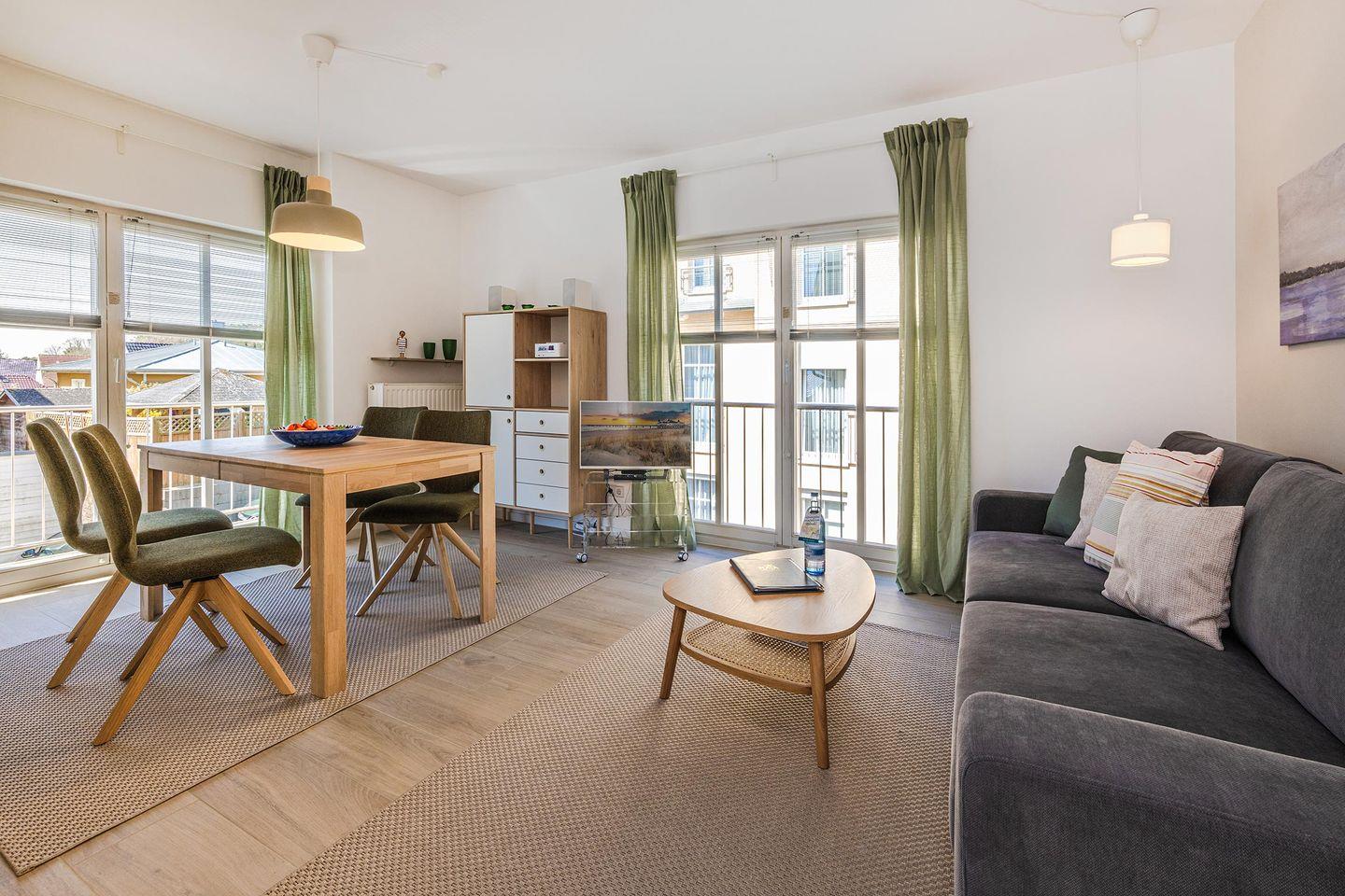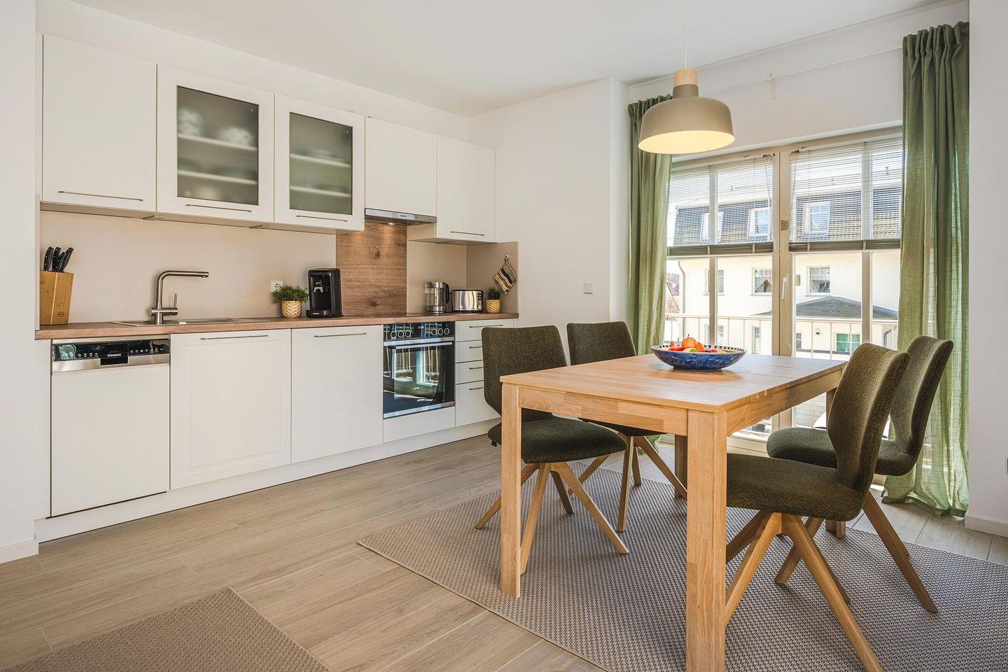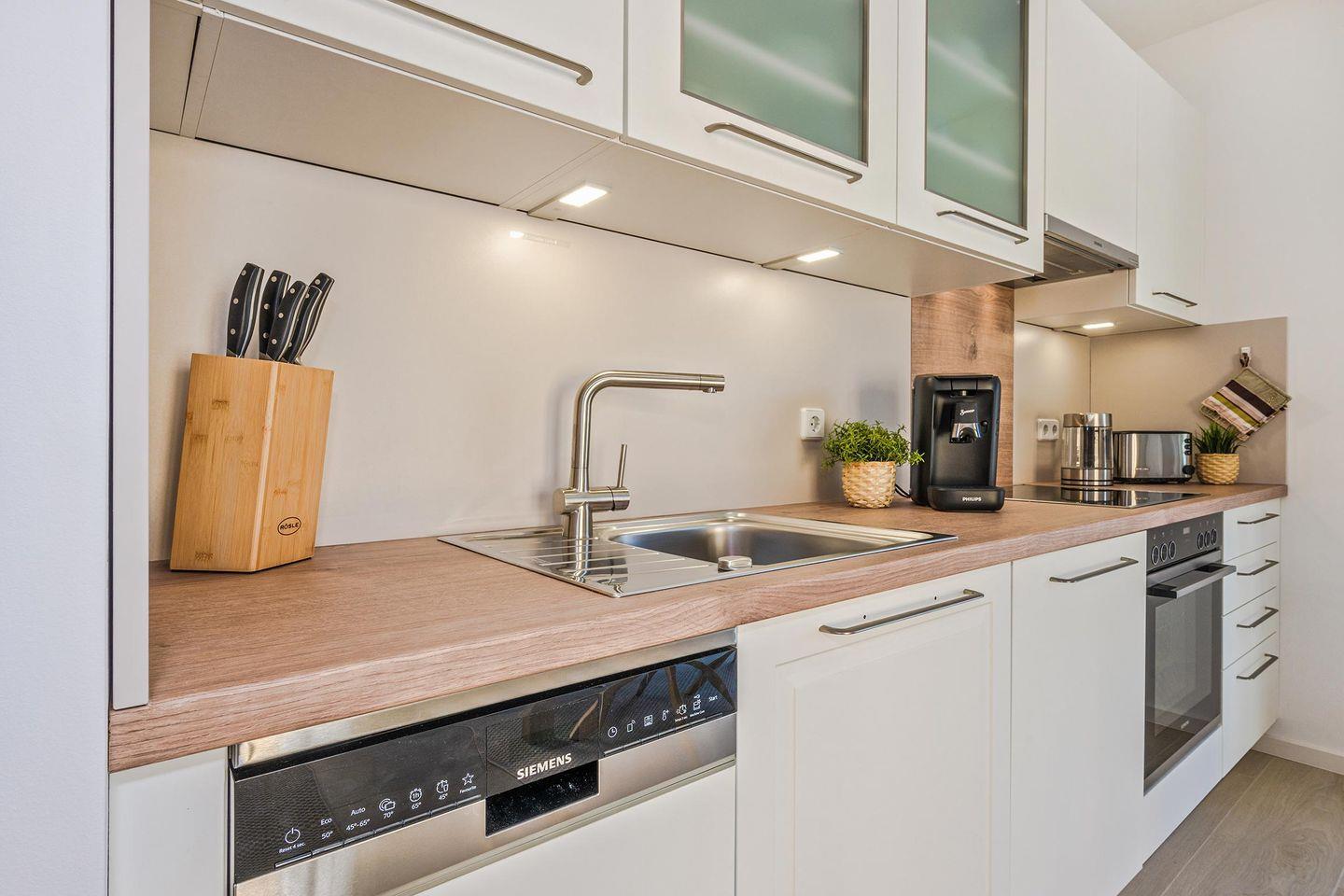 Der offene Wohnraum ist mit einer bequemen Couch, Kommode und Smart-TV eingerichtet. Die natürliche Farbgestaltung sorgt für eine entspannte Atmosphäre. Ihr Frühstück können Sie am modernen Esstisch genießen oder aber Sie stellen sich mit einer Tasse Kaffee auf den kleinen, französischen Balkon, angrenzend am Wohnzimmer, und lassen den Blick über die Umgebung des Hauses schweifen. Die Küche ist voll ausgestattet und verfügt über allerlei wichtige Dinge des täglichen Bedarfs. Das Schlafzimmer ist mit einem hochwertigen Doppelbett ausgestattet und ist für Ihren zusätzlichen Komfort mit einem zweiten Fernseher ausgestattet. Ein geräumiger Kleiderschrank für Ihre Urlaubsgarderobe ist hier ebenfalls zu finden. Im Badezimmer gehören Waschbecken, WC, Handtuchheizung und Dusche zur Ausstattung. Das Fenster erhellt diese Räumlichkeit in natürlichem Licht.