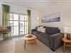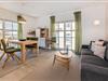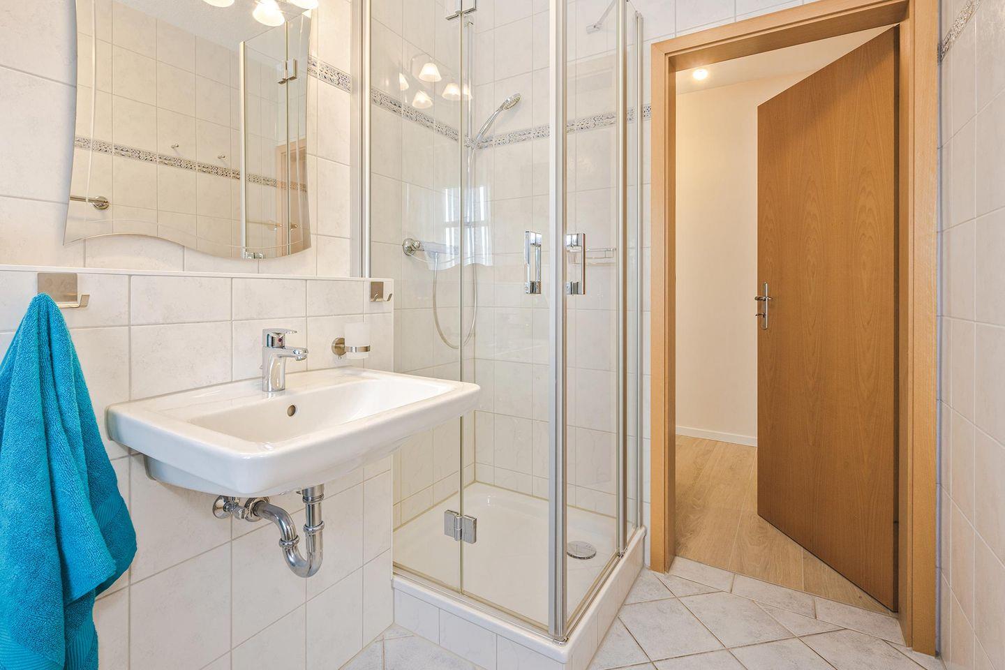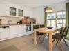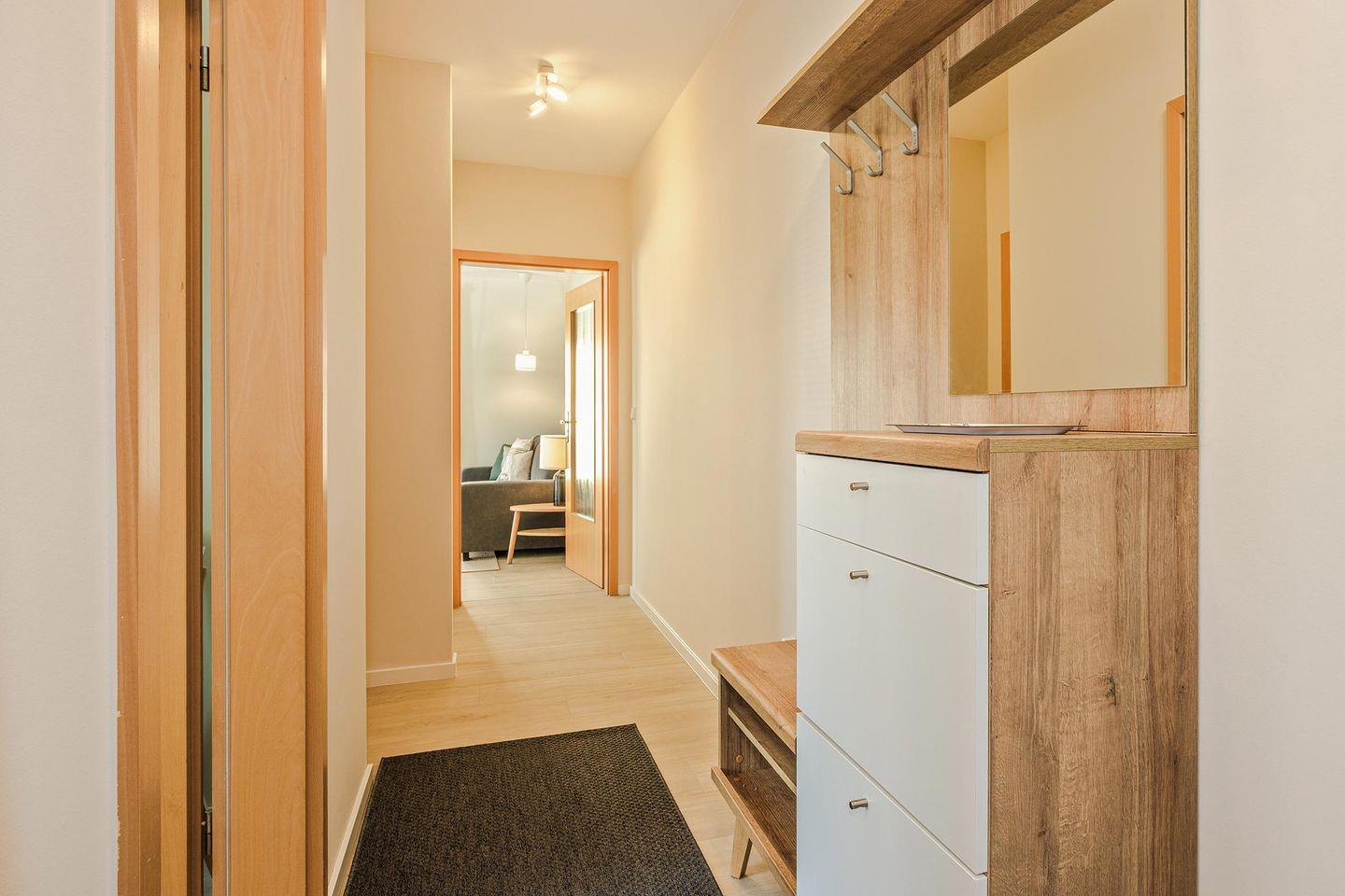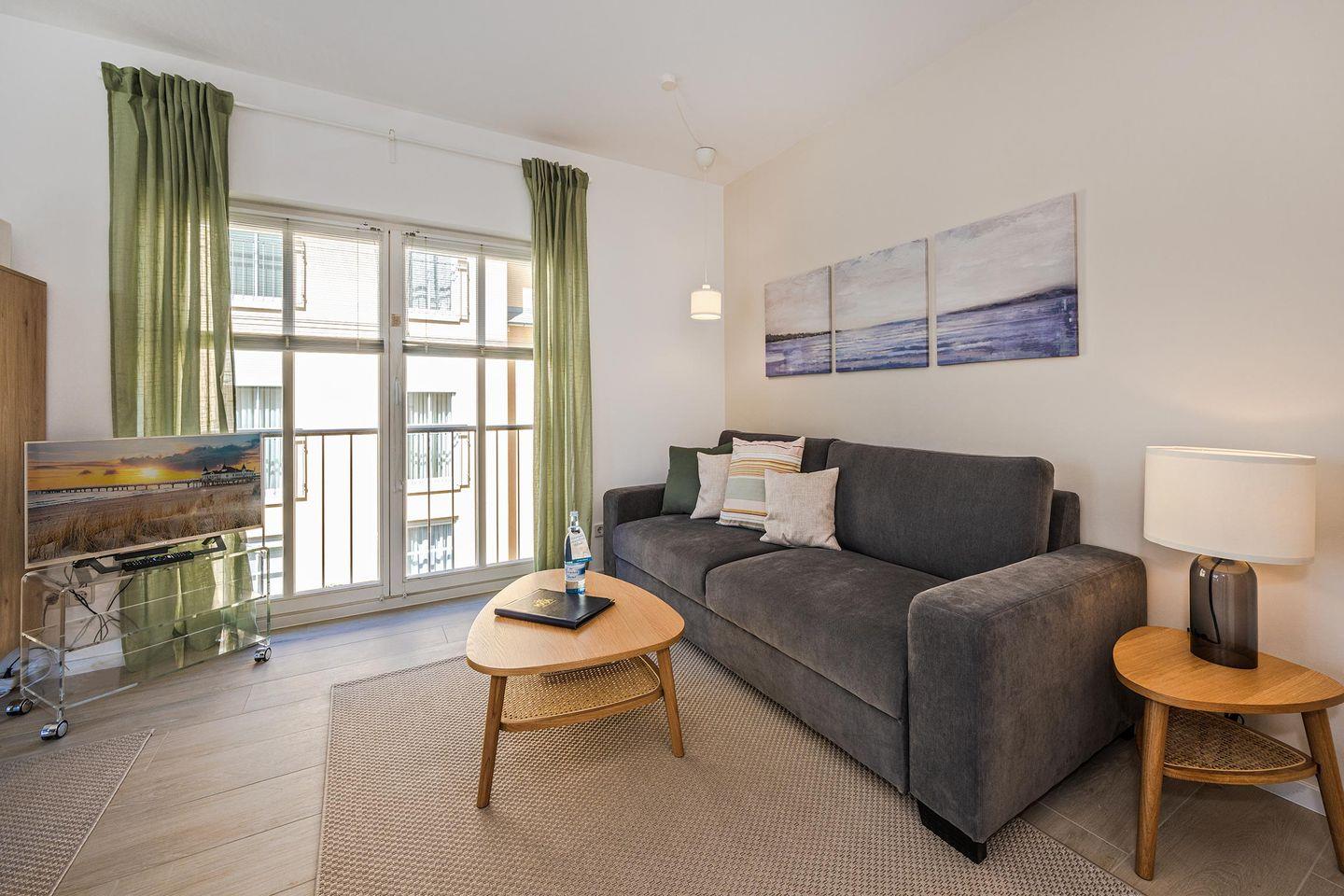Der offene Wohnraum ist mit einer bequemen Couch, Kommode und Smart-TV eingerichtet. Die natürliche Farbgestaltung sorgt für eine entspannte Atmosphäre. Ihr Frühstück können Sie am modernen Esstisch genießen oder aber Sie stellen sich mit einer Tasse Kaffee auf den kleinen, französischen Balkon, angrenzend am Wohnzimmer, und lassen den Blick über die Umgebung des Hauses schweifen. Die Küche ist voll ausgestattet und verfügt über allerlei wichtige Dinge des täglichen Bedarfs. Das Schlafzimmer ist mit einem hochwertigen Doppelbett ausgestattet und ist für Ihren zusätzlichen Komfort mit einem zweiten Fernseher ausgestattet. Ein geräumiger Kleiderschrank für Ihre Urlaubsgarderobe ist hier ebenfalls zu finden. Im Badezimmer gehören Waschbecken, WC, Handtuchheizung und Dusche zur Ausstattung. Das Fenster erhellt diese Räumlichkeit in natürlichem Licht.