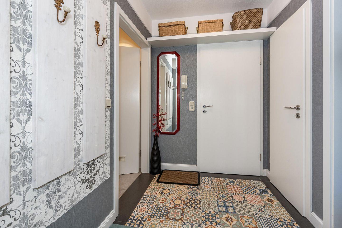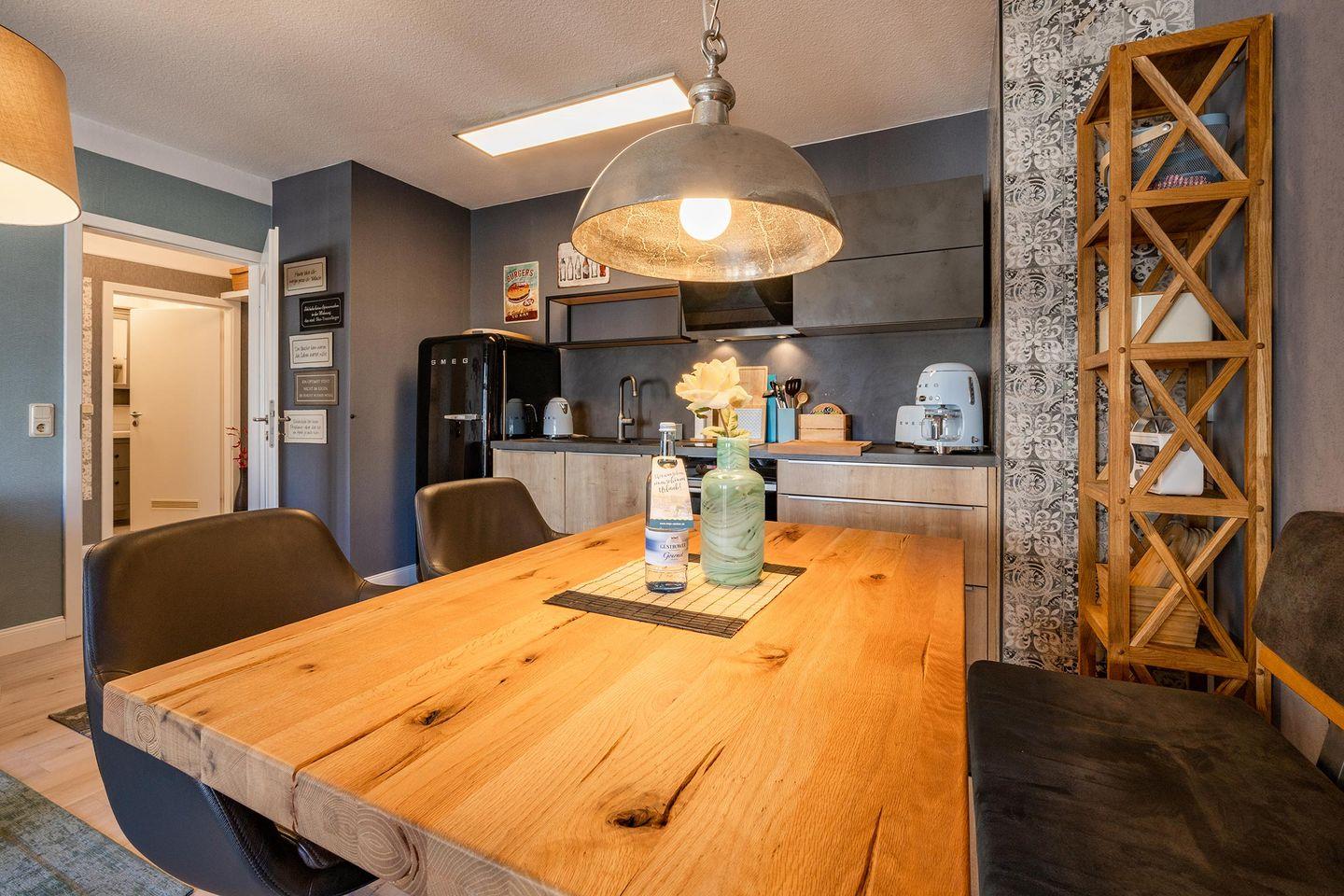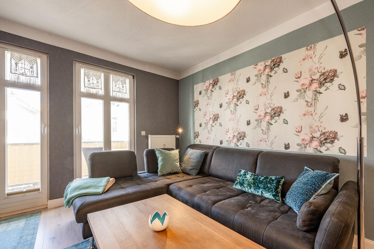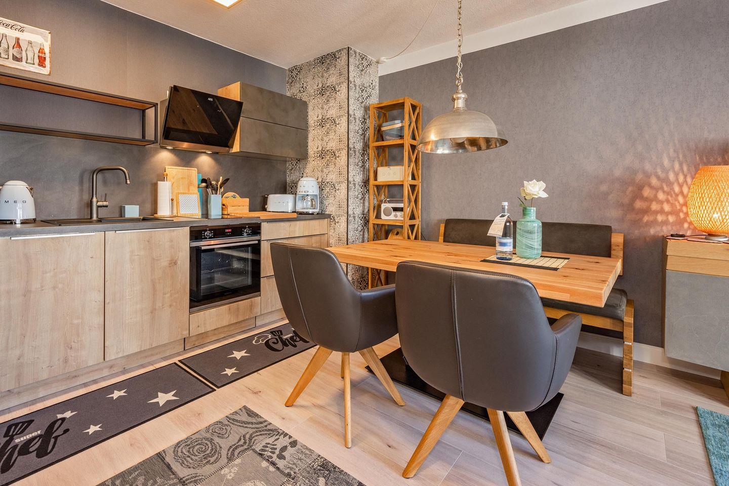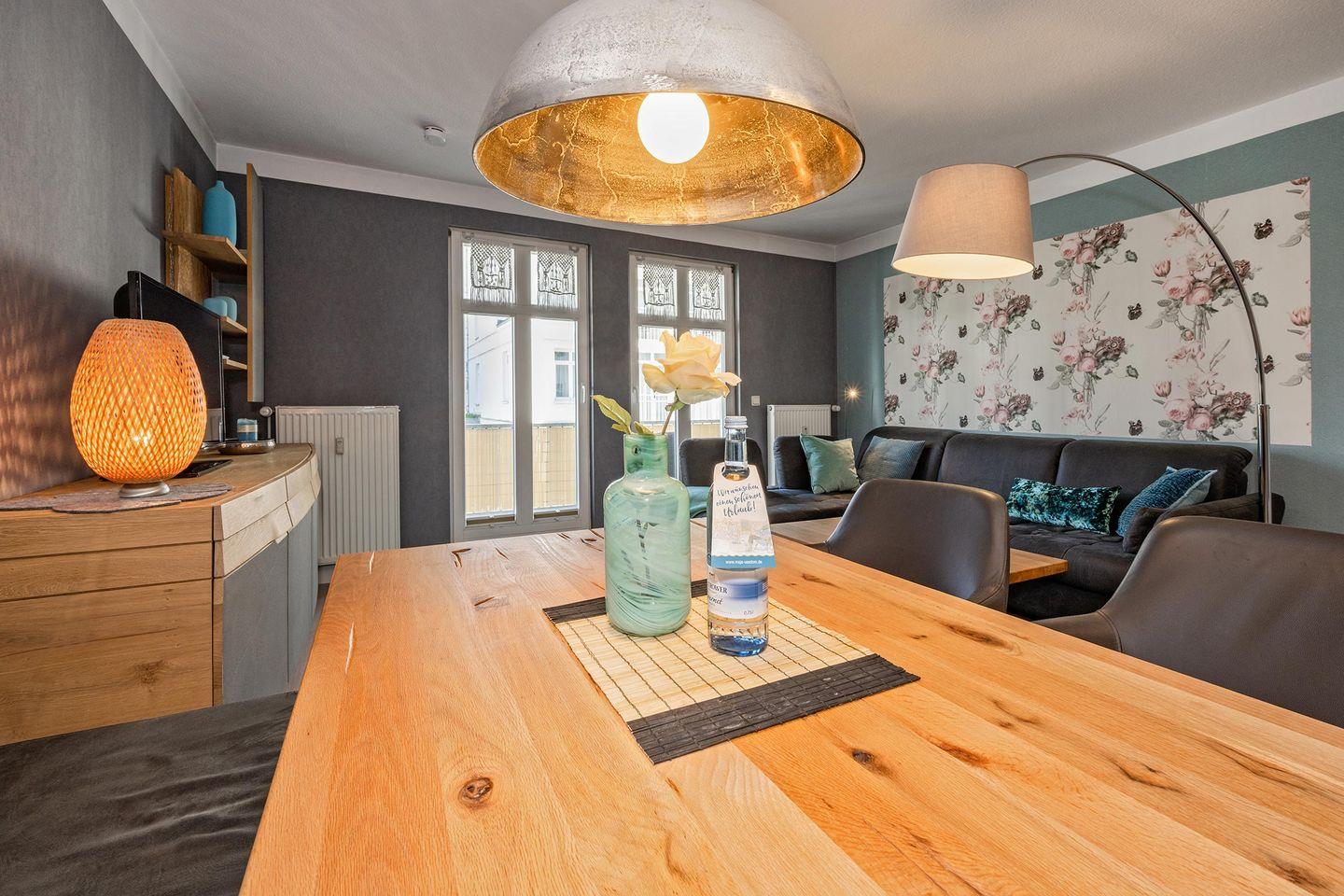 Bei der Einrichtung des Appartements wurden weder Herz noch Mühen gescheut und so wurde ein harmonisches Zusammenspiel von Farben und Stilen mit liebevollen Details erschaffen. Sie werden sich hier sofort wohlfühlen. Das Wohnzimmer ist mit einer großen Couchgarnitur und einen TV zu Ihrem Komfort eingerichtet. Frühstücken Sie bei ersten Sonnenstrahlen auf dem Balkon oder setzen Sie sich zusammen an den Esstisch im Wohnbereich. Die Wahl liegt bei Ihnen. Offen zum Wohnraum befindet sich die Küche, die mit allerhand praktischen Dingen aufwartet und Ihnen so auch das Kochen im Urlaub ermöglicht.